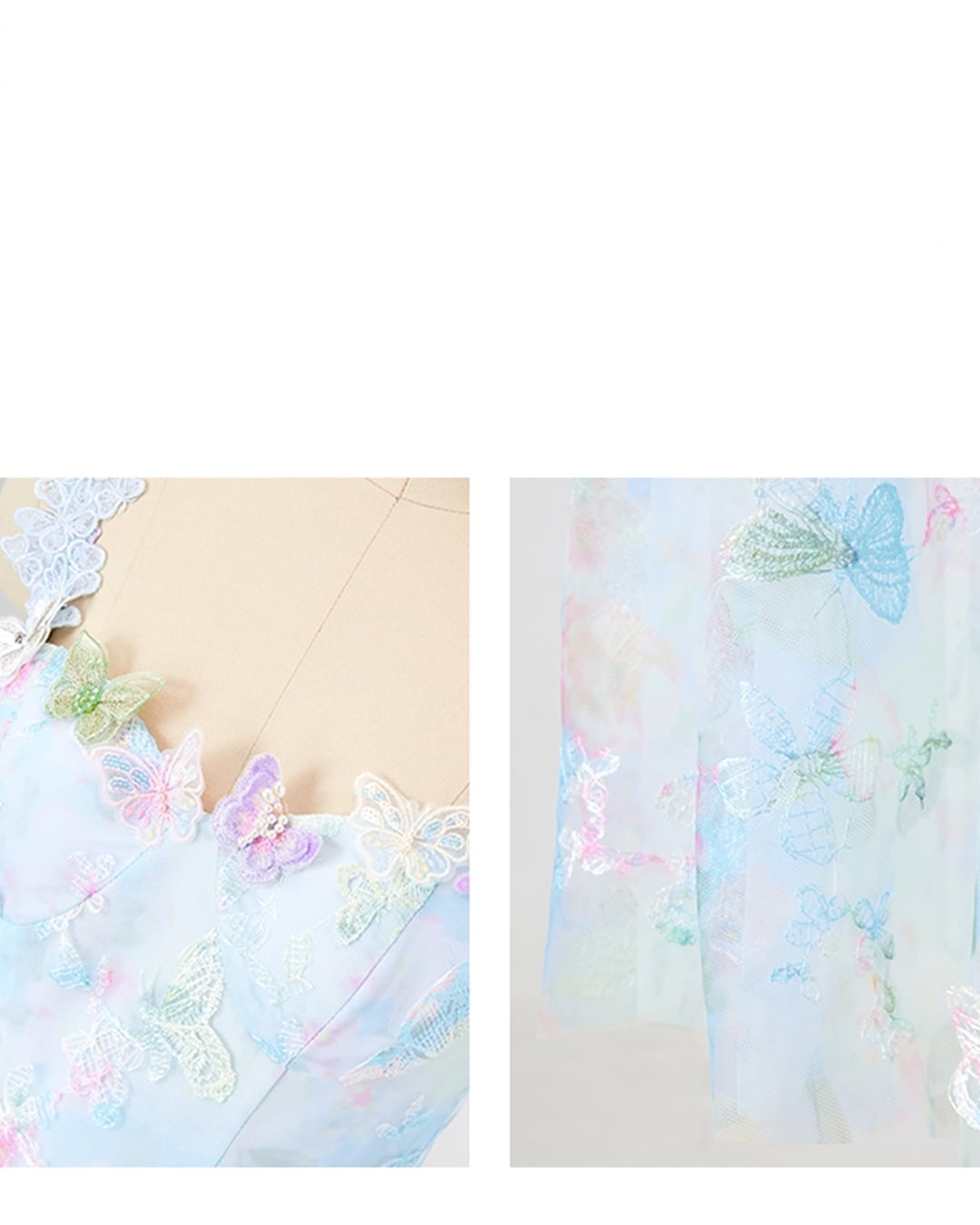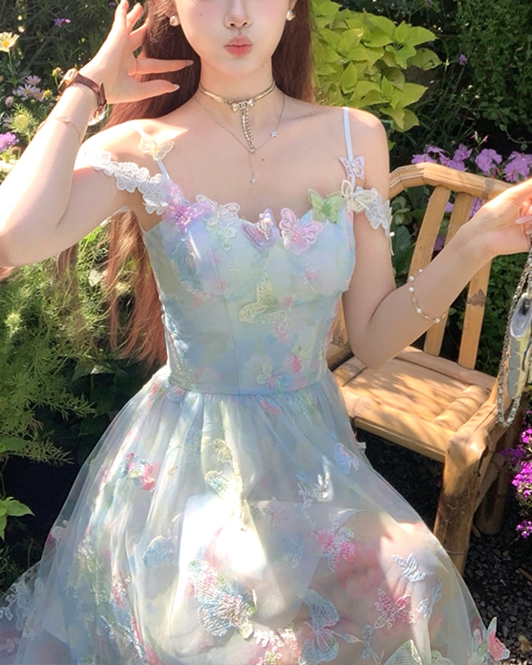 澄んだブルーに舞う蝶と花々が印象的なワンピース♡