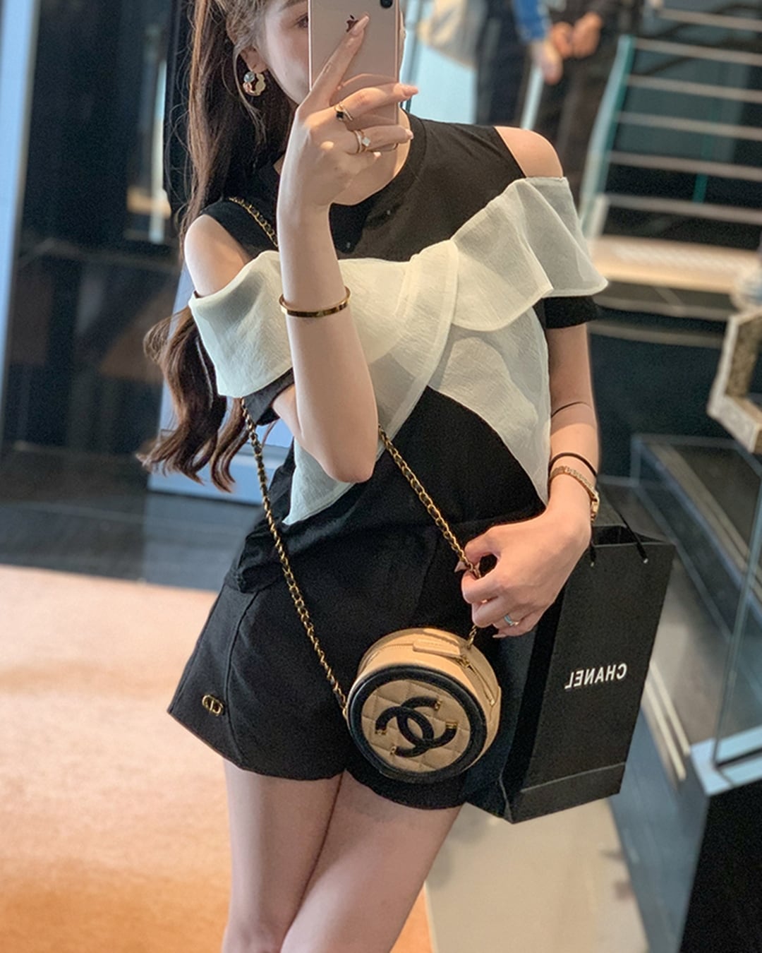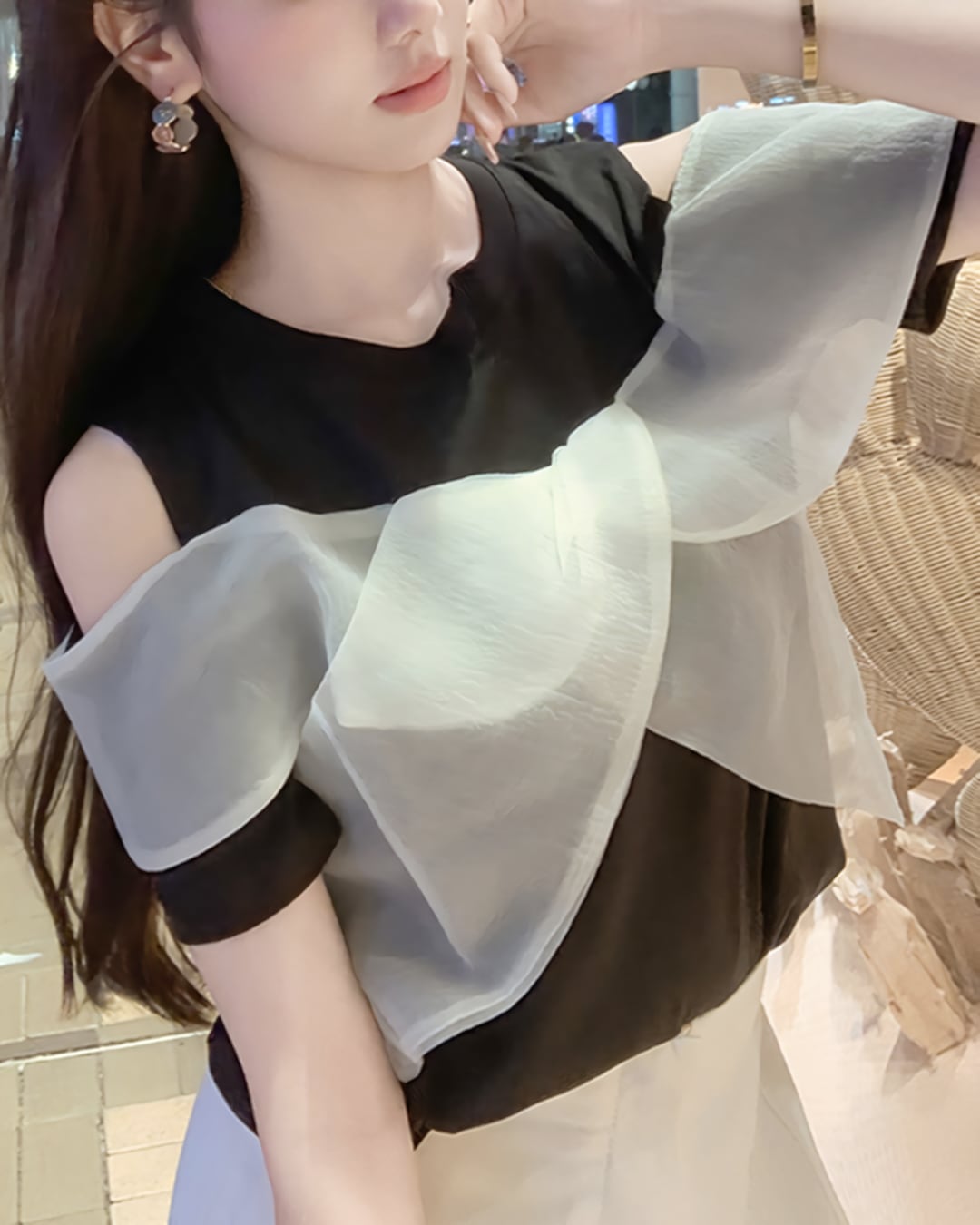 ブラックトップスに透け感のあるシアー素材を重ねた