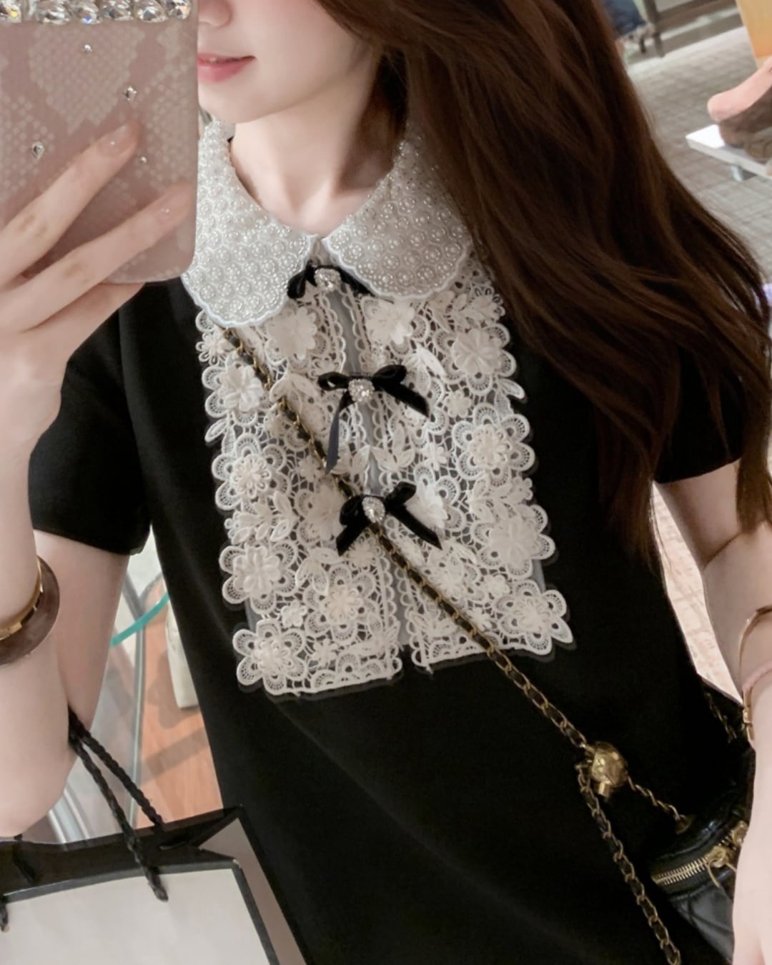 ビーズをあしらった襟元が華やかにきらめく