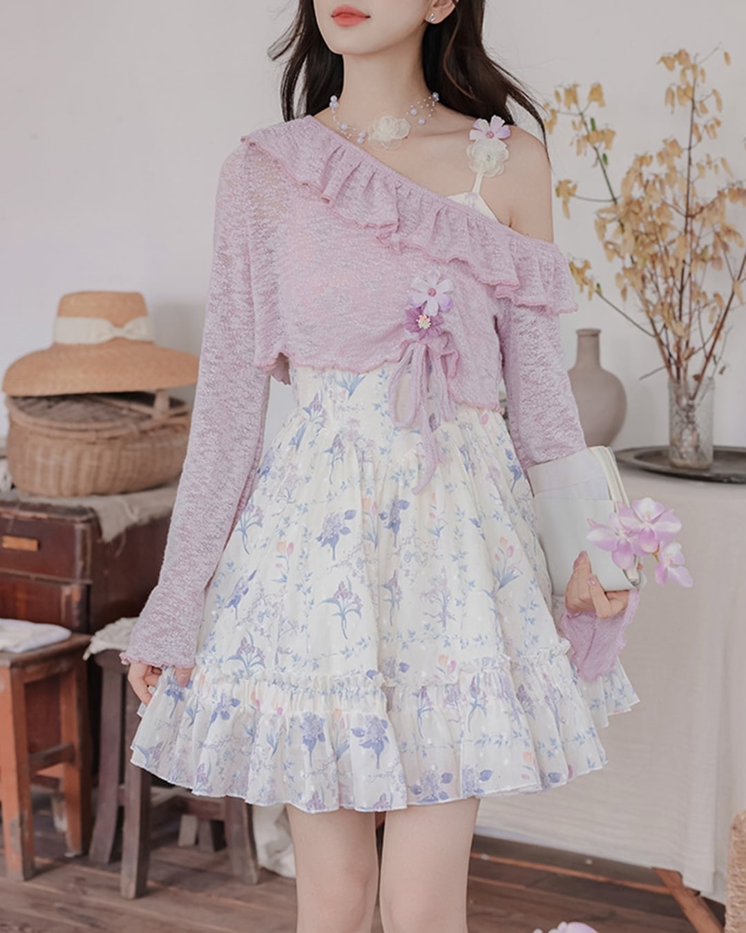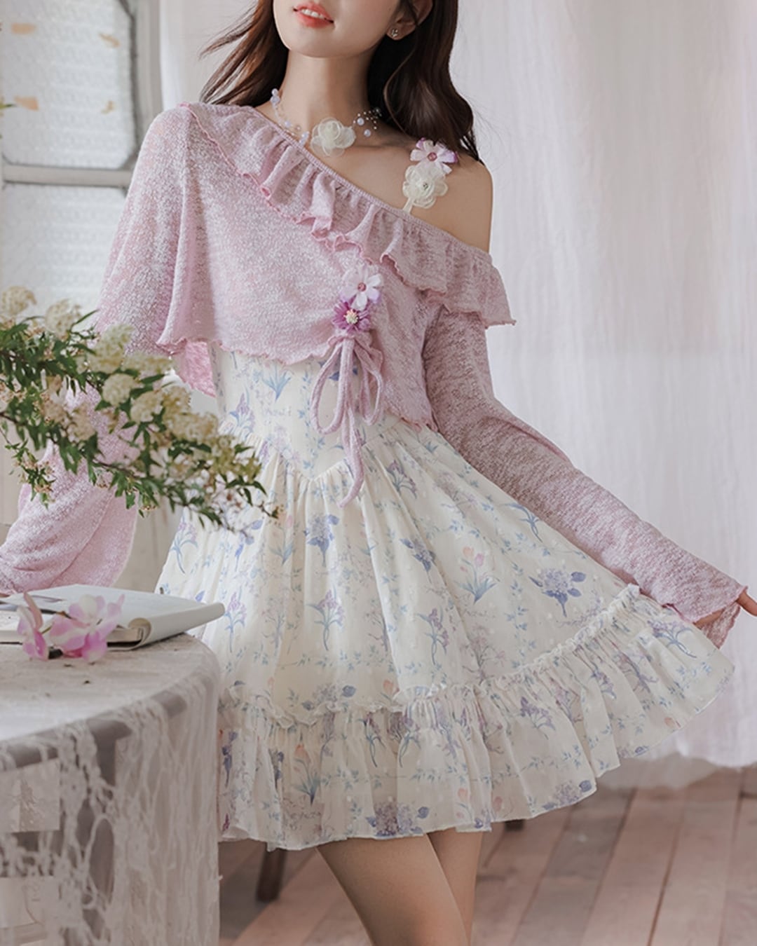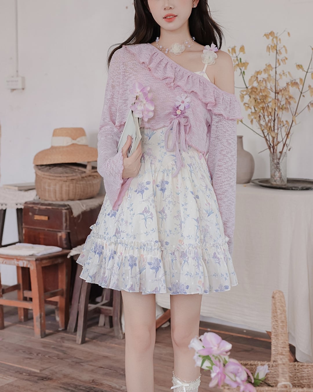 ブルーフラワーワンピース&フリルショートトップスセット 2508024