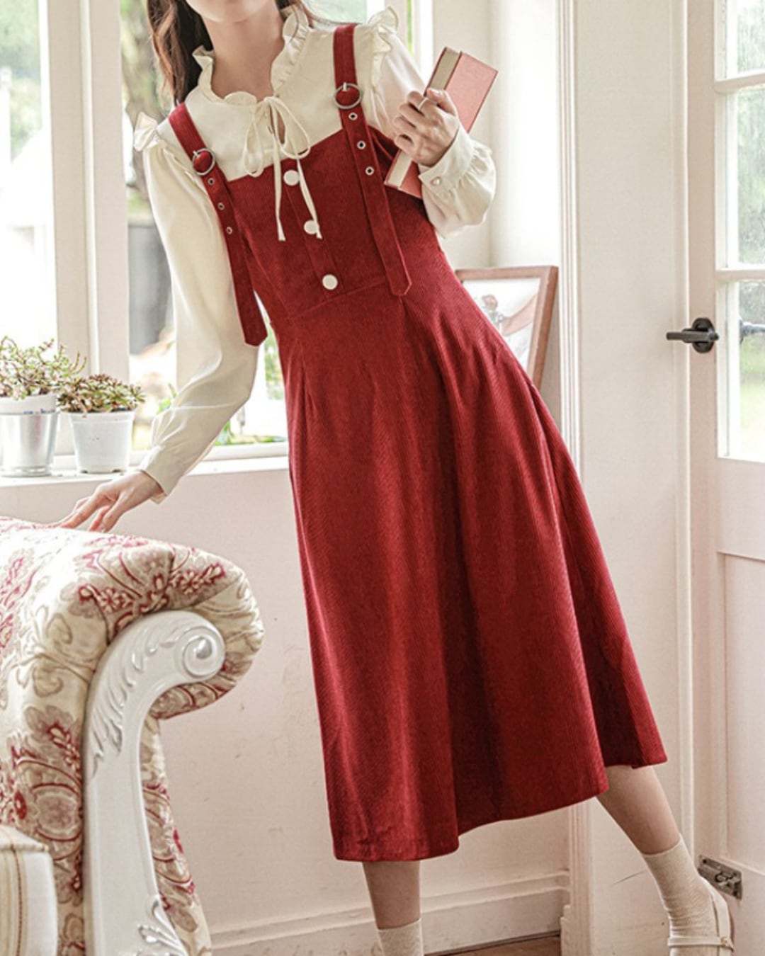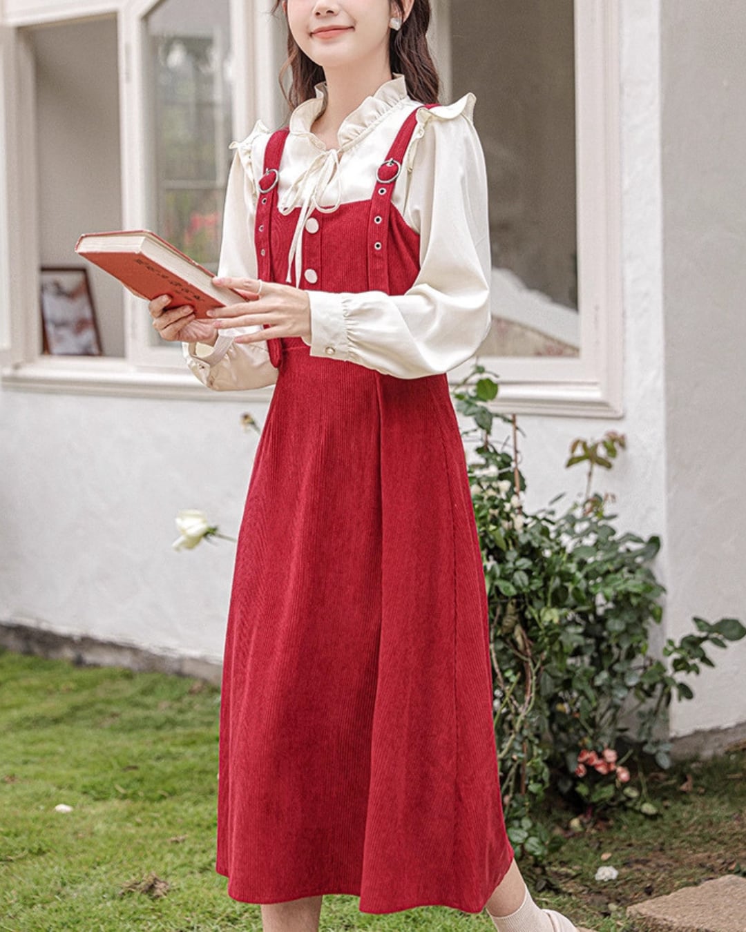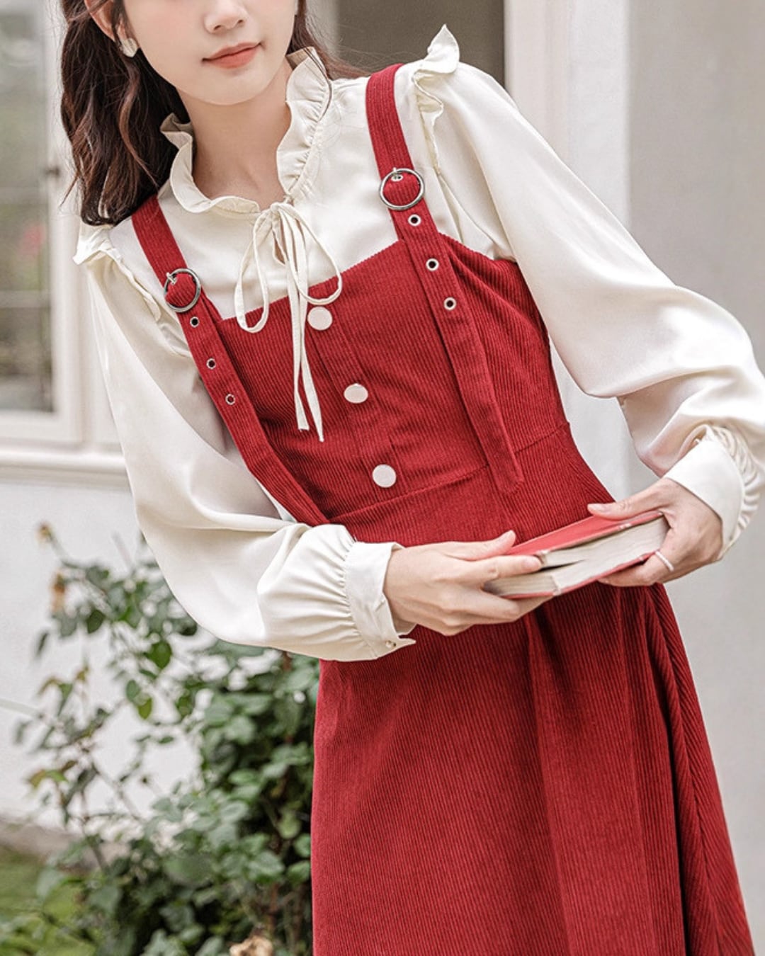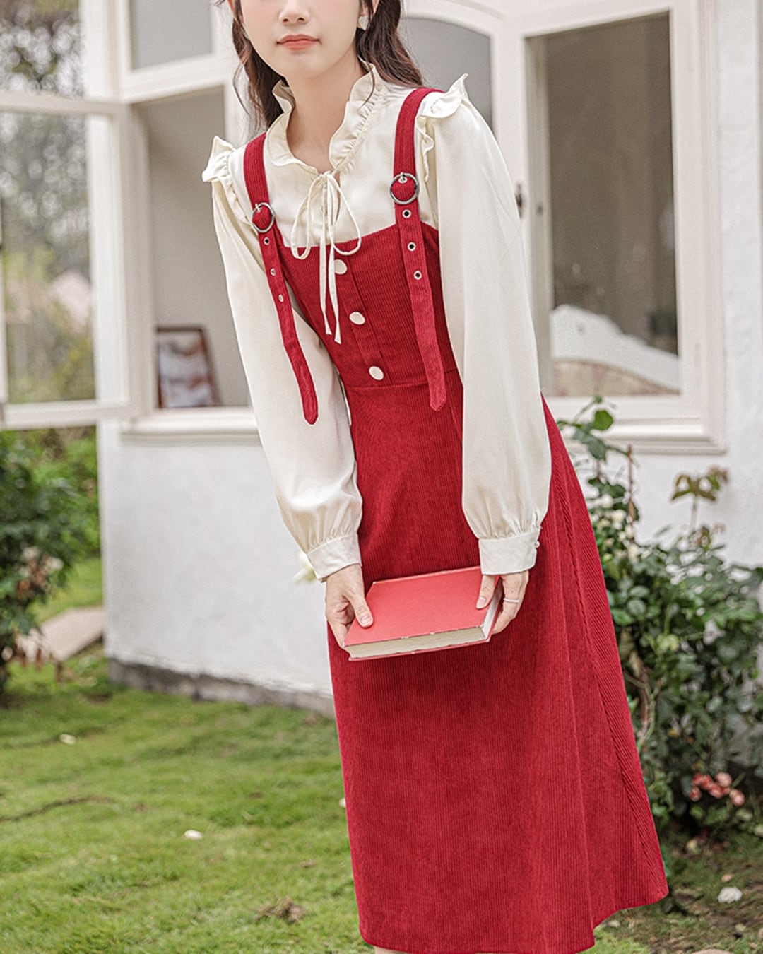 ショルダーフリルブラウス&レッドサスペンダーワンピースセット 25WP08071