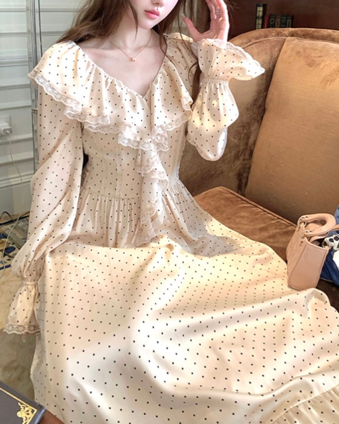 細やかなドット柄に、胸元のフリルとリボンが映えるロングワンピース♡