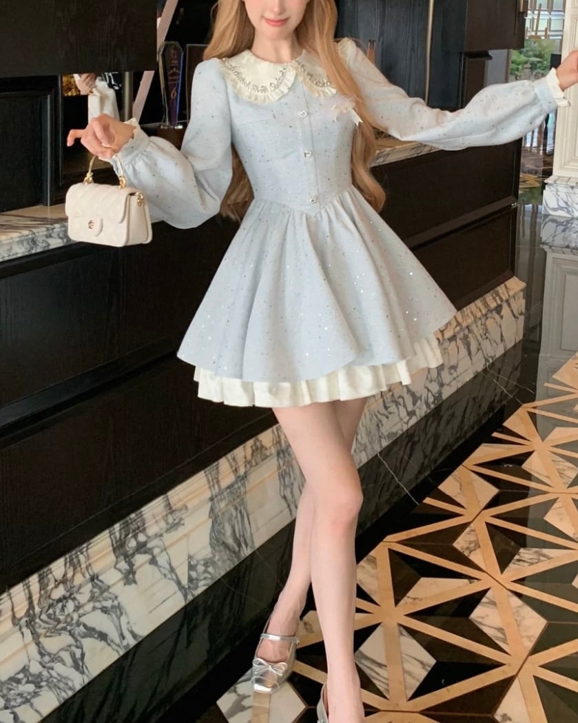 淡いブルーに、襟元のビジューがきらめく華やかなワンピース♡