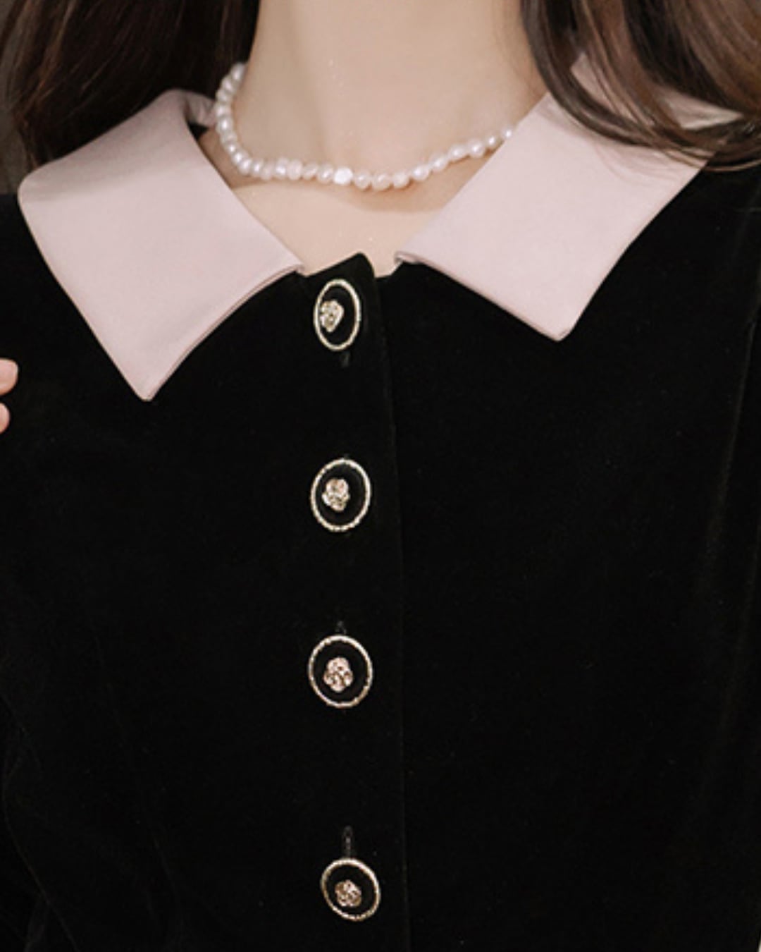大きめの襟とフロントボタンがレトロな可愛さを演出し、ウエスト切替から広がるスカートが女性らしいシルエットを叶えます。