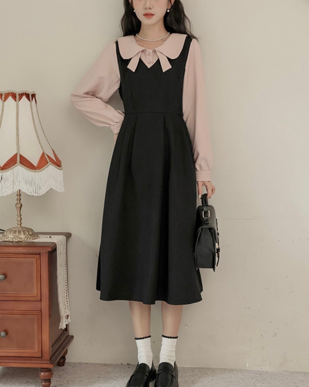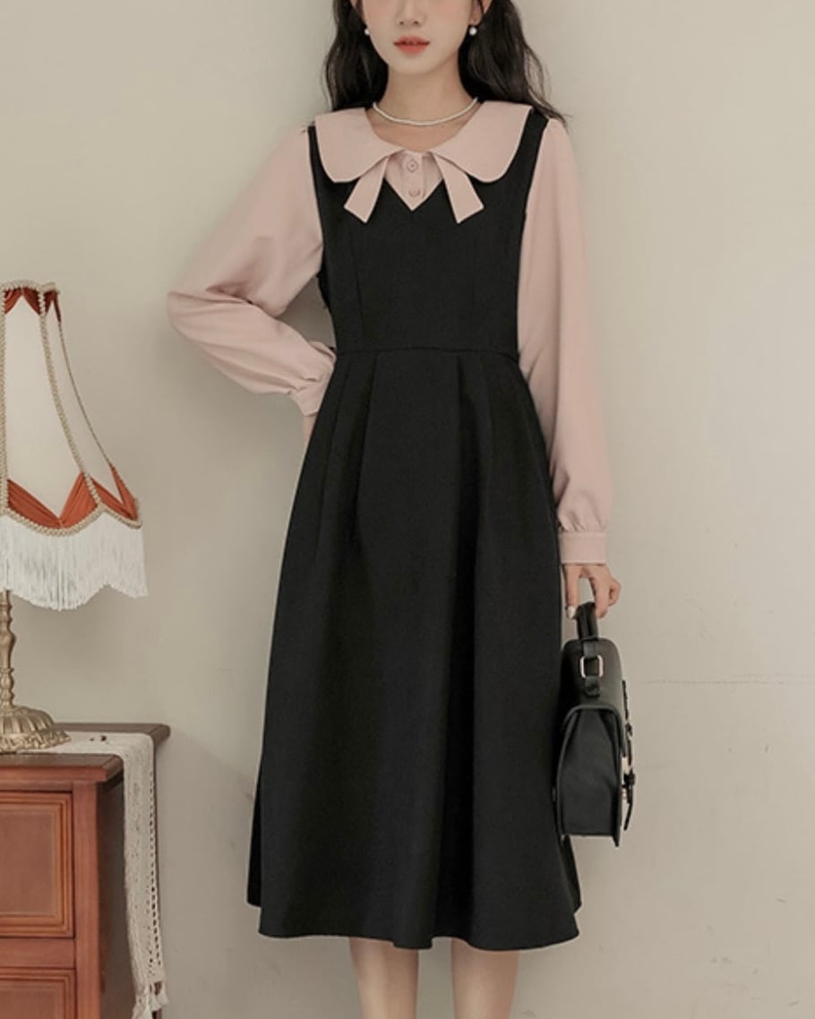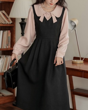 大きめの襟と配色デザインが視線を引くクラシカルワンピース♡