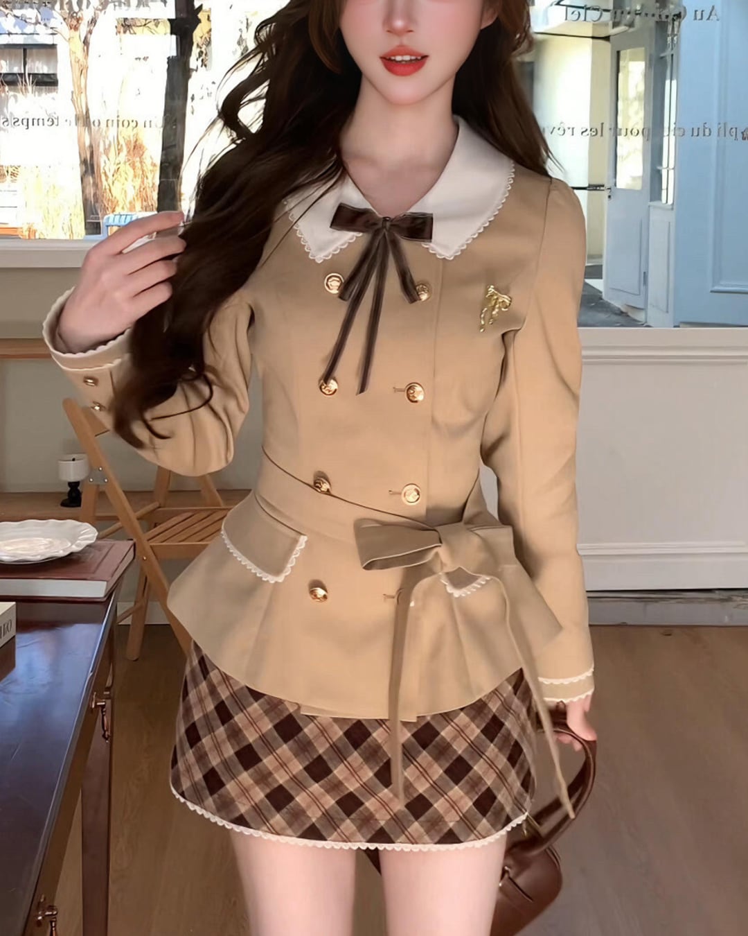 クラシカルなチェック柄に、リボンタイとゴールドボタンが映える上品セットアップ♡