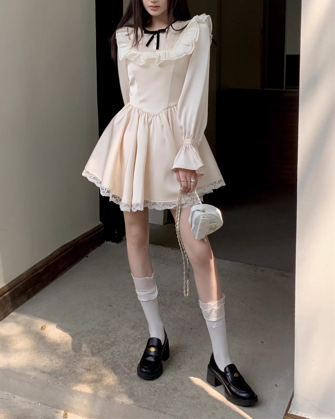 胸元のリボンタイとパフスリーブが甘さを引き立ててくれるデザイン