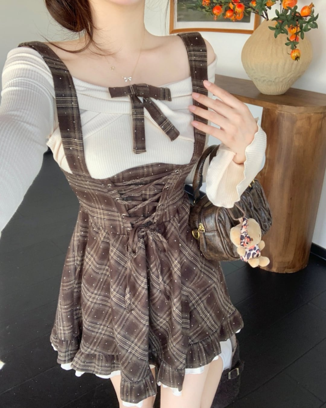 ガーリーチェックブラウンスカートセットアップ 25W08129