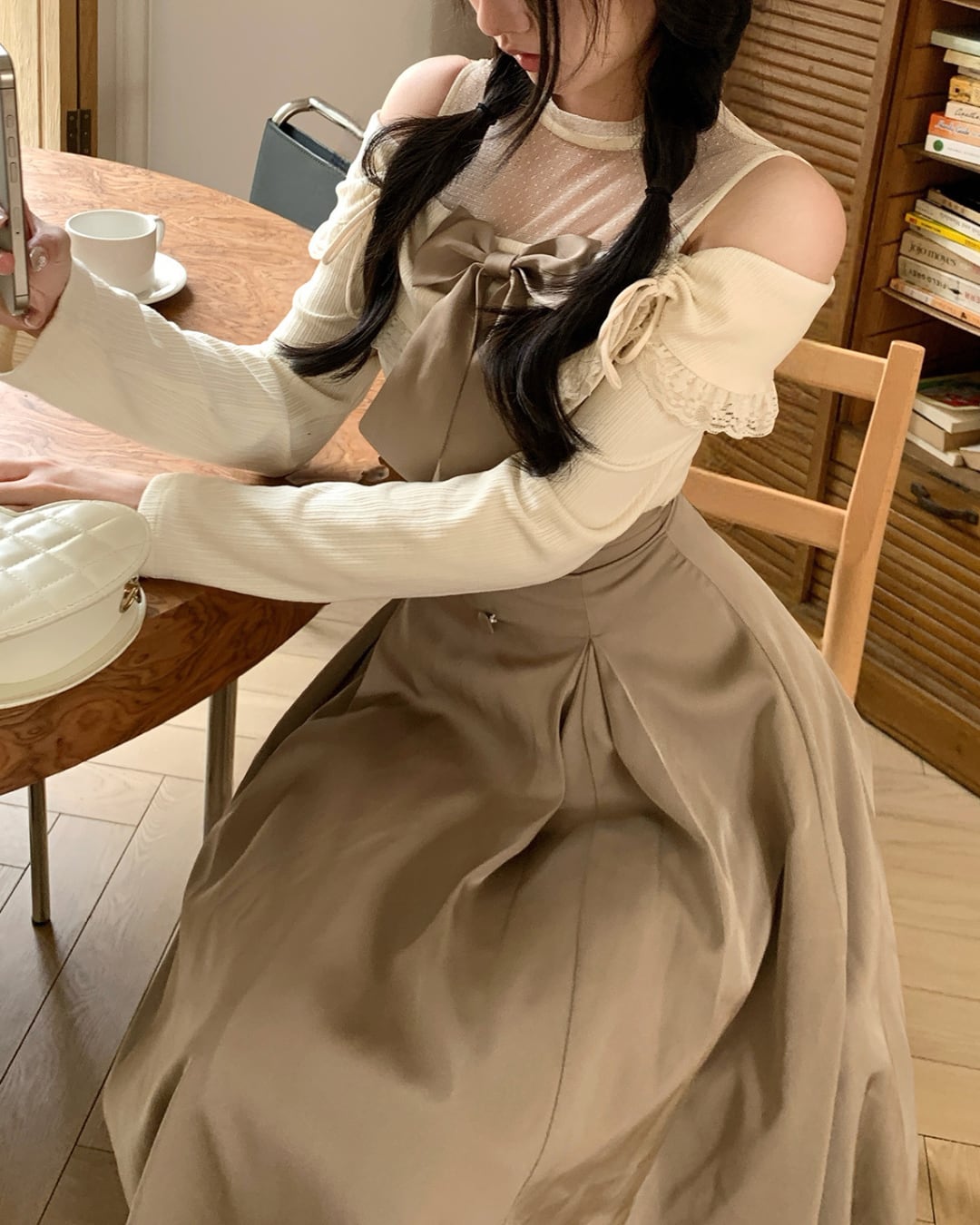 肩まわりのフリルとオフショルデザインが華奢見えを叶える