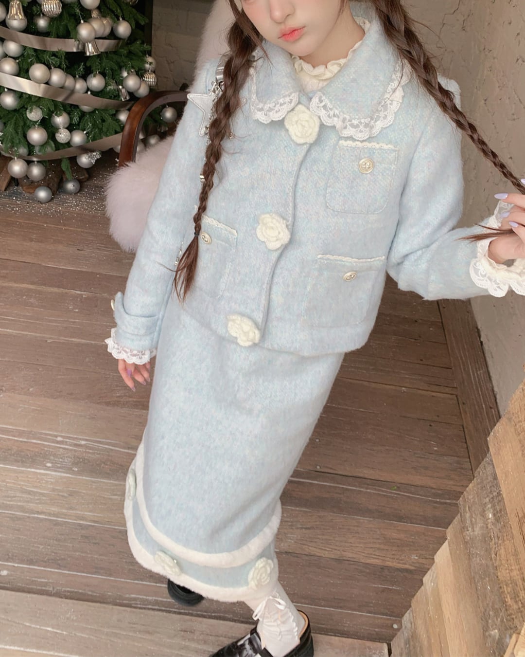 軽やかなミルキーブルーのツイード素材で、冬のフェミニンコーデを格上げ