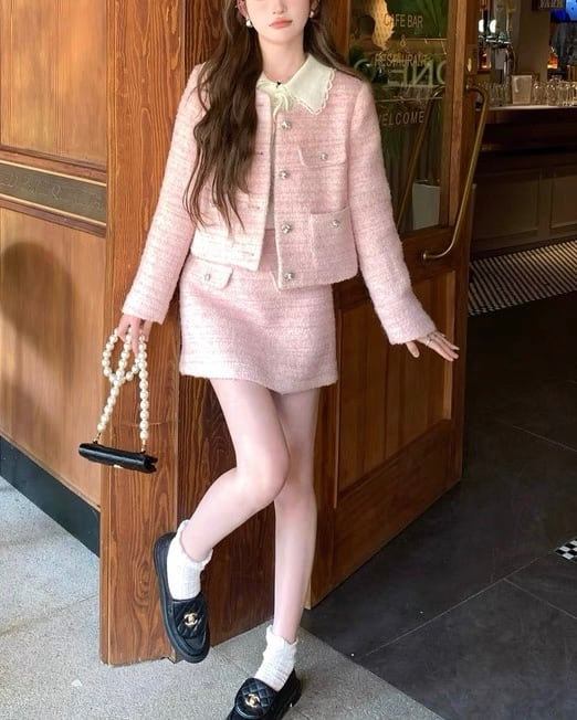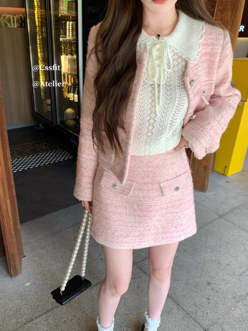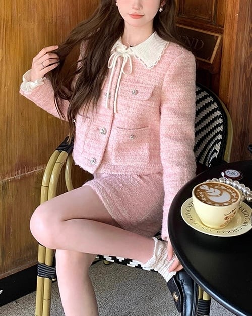 やわらかなピンクツイード素材で仕立てたセットアップです♡