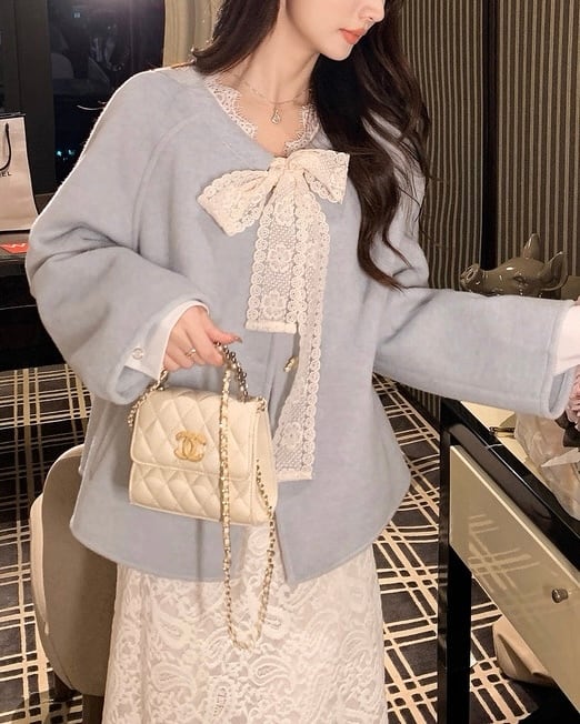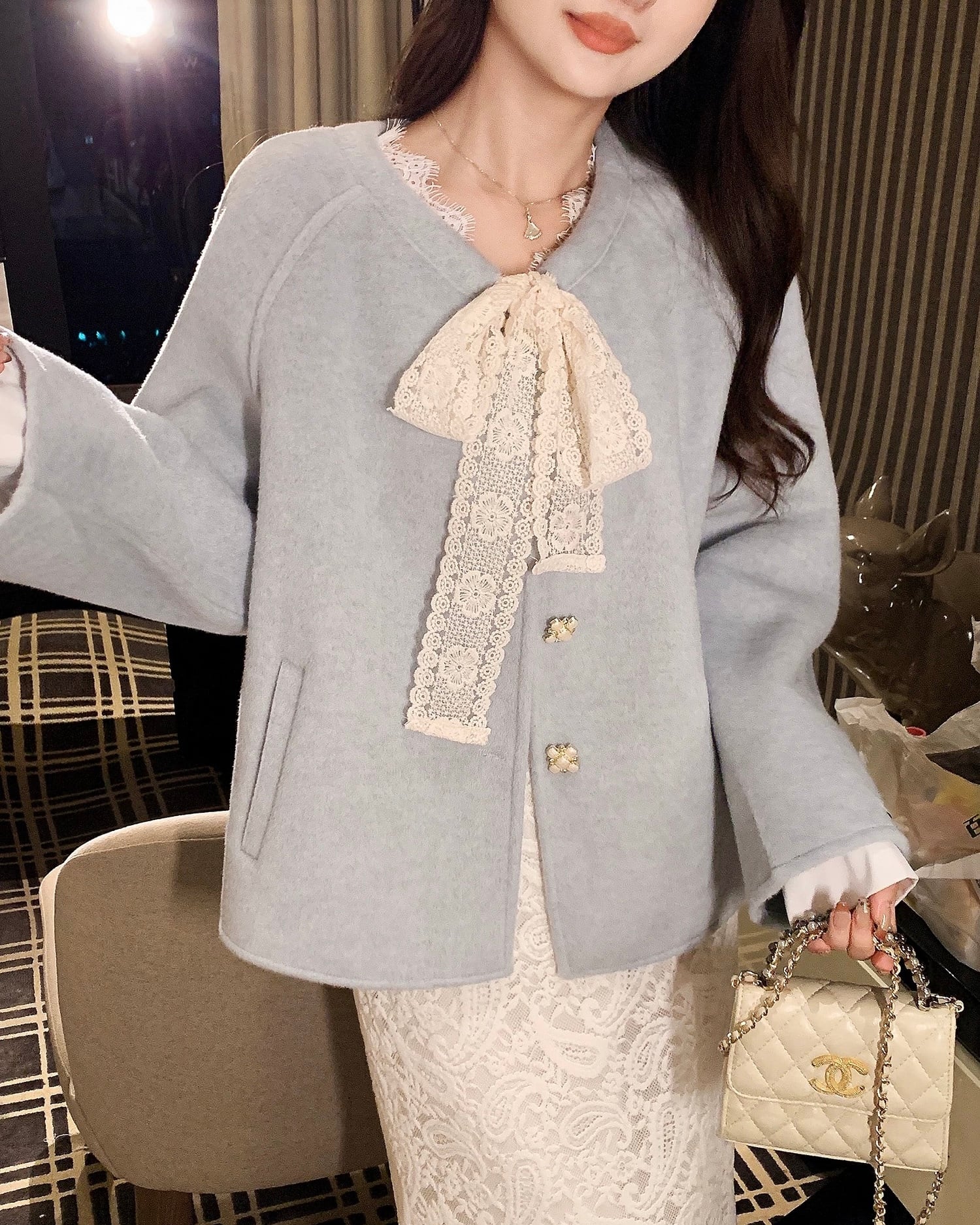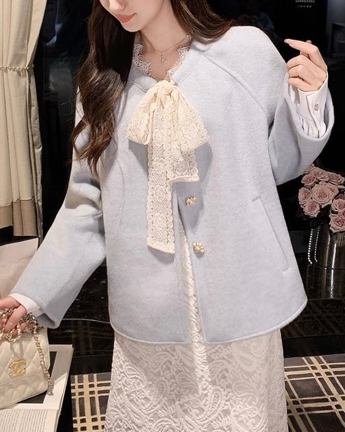 上品なノーカラー&レースリボンがアクセントになったハーフコートです♡