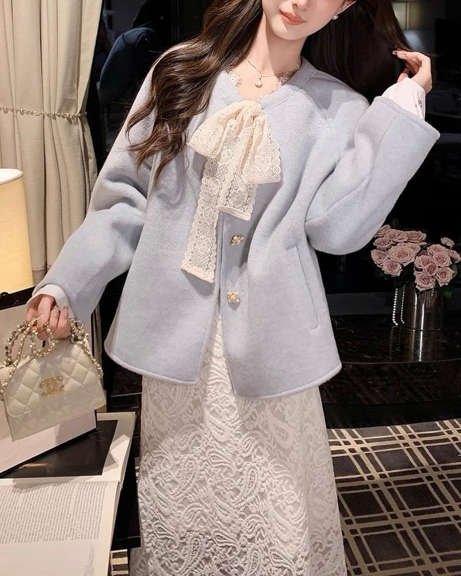 ノーカラーレースリボンハーフコート(2 colors) 25W08196