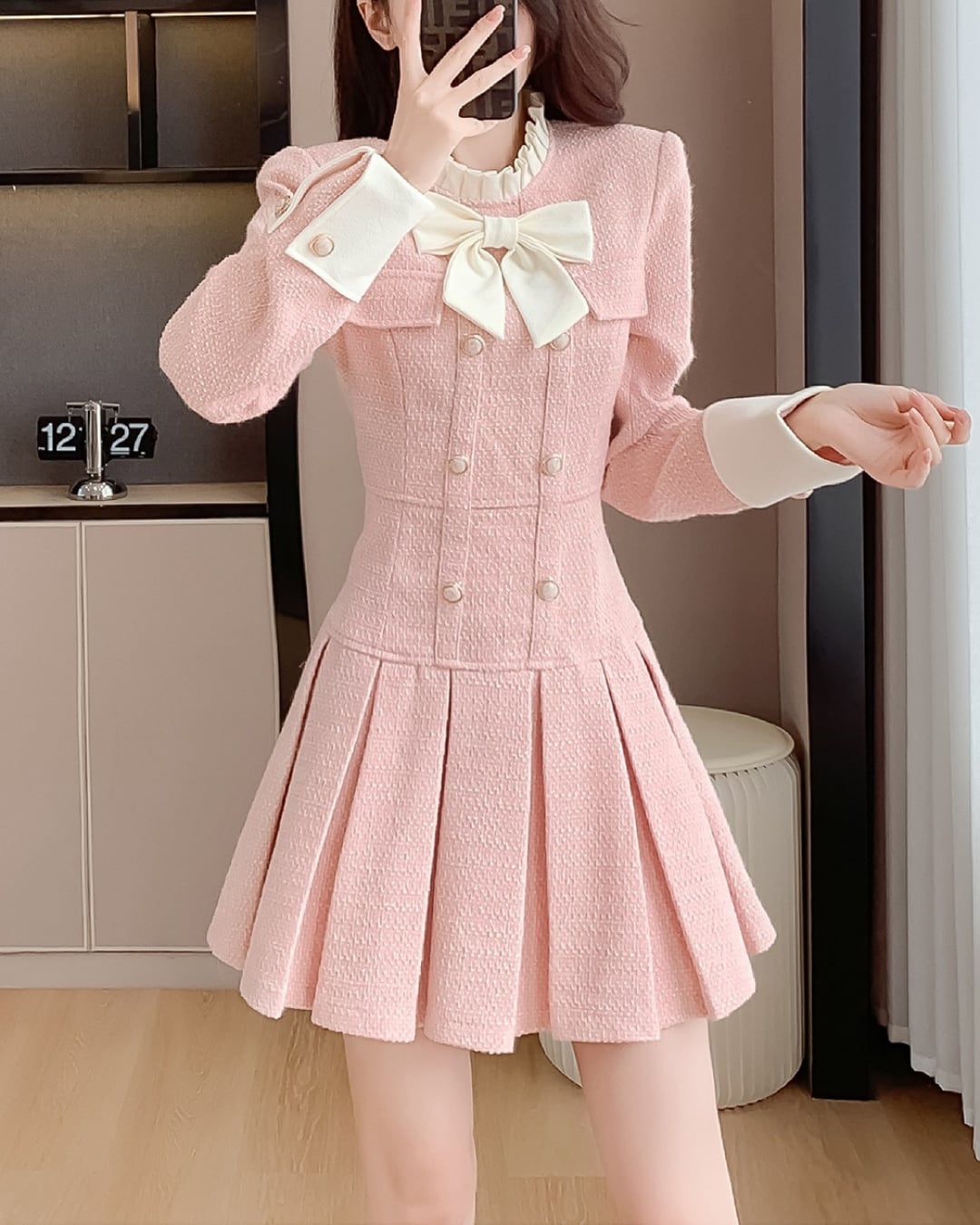 プリーツリボンピンクツイードワンピース 25W08229