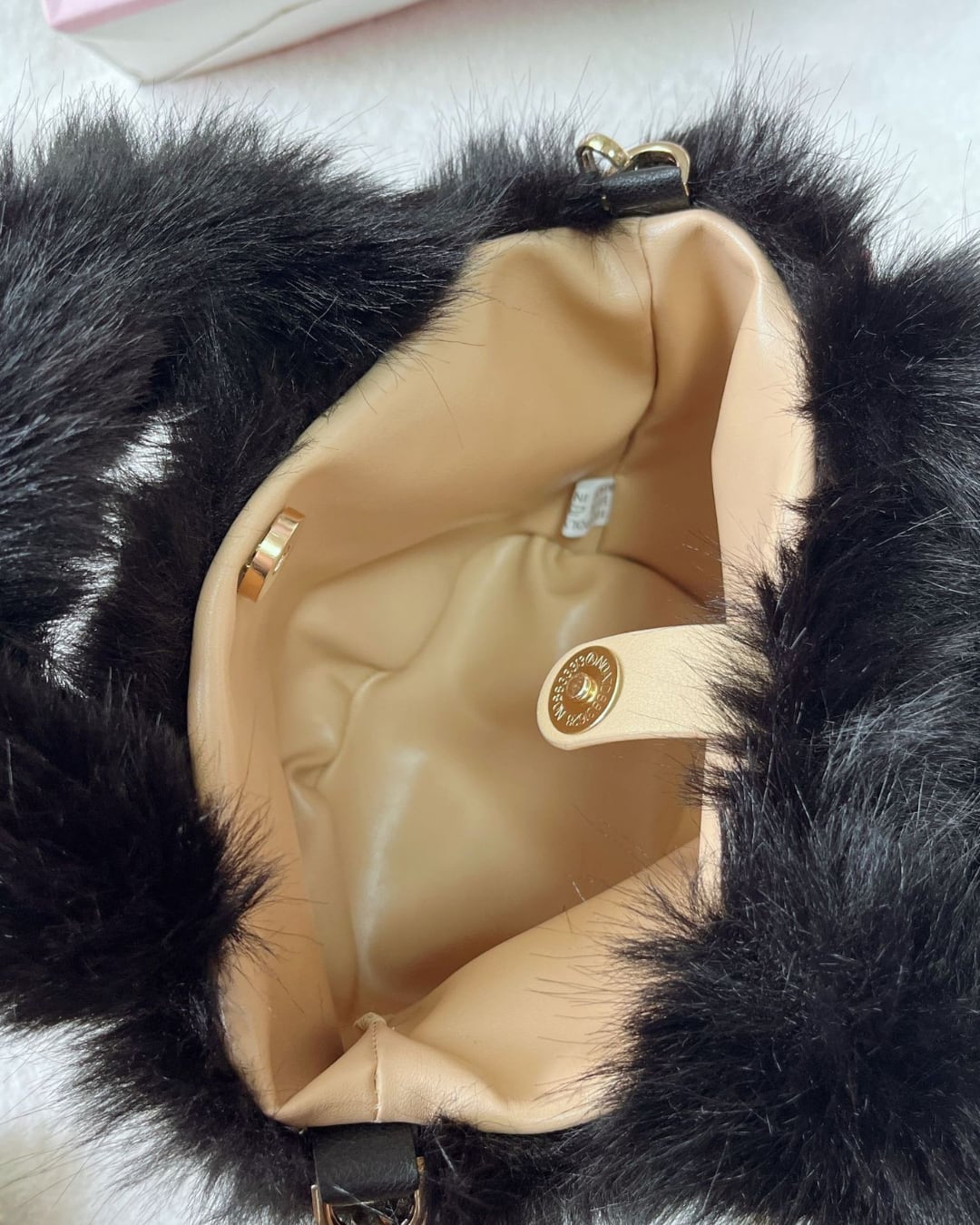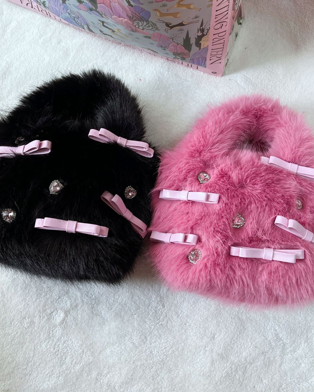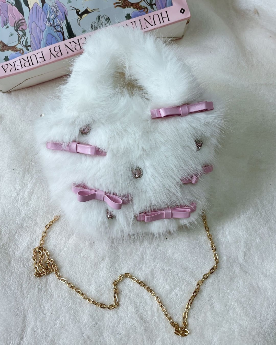 ふわふわのファーにピンクのリボンとビジューがちりばめられた甘めバッグ♡