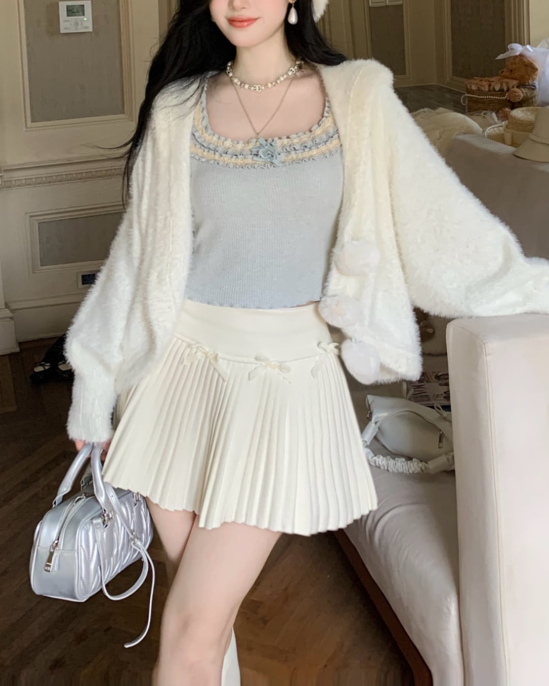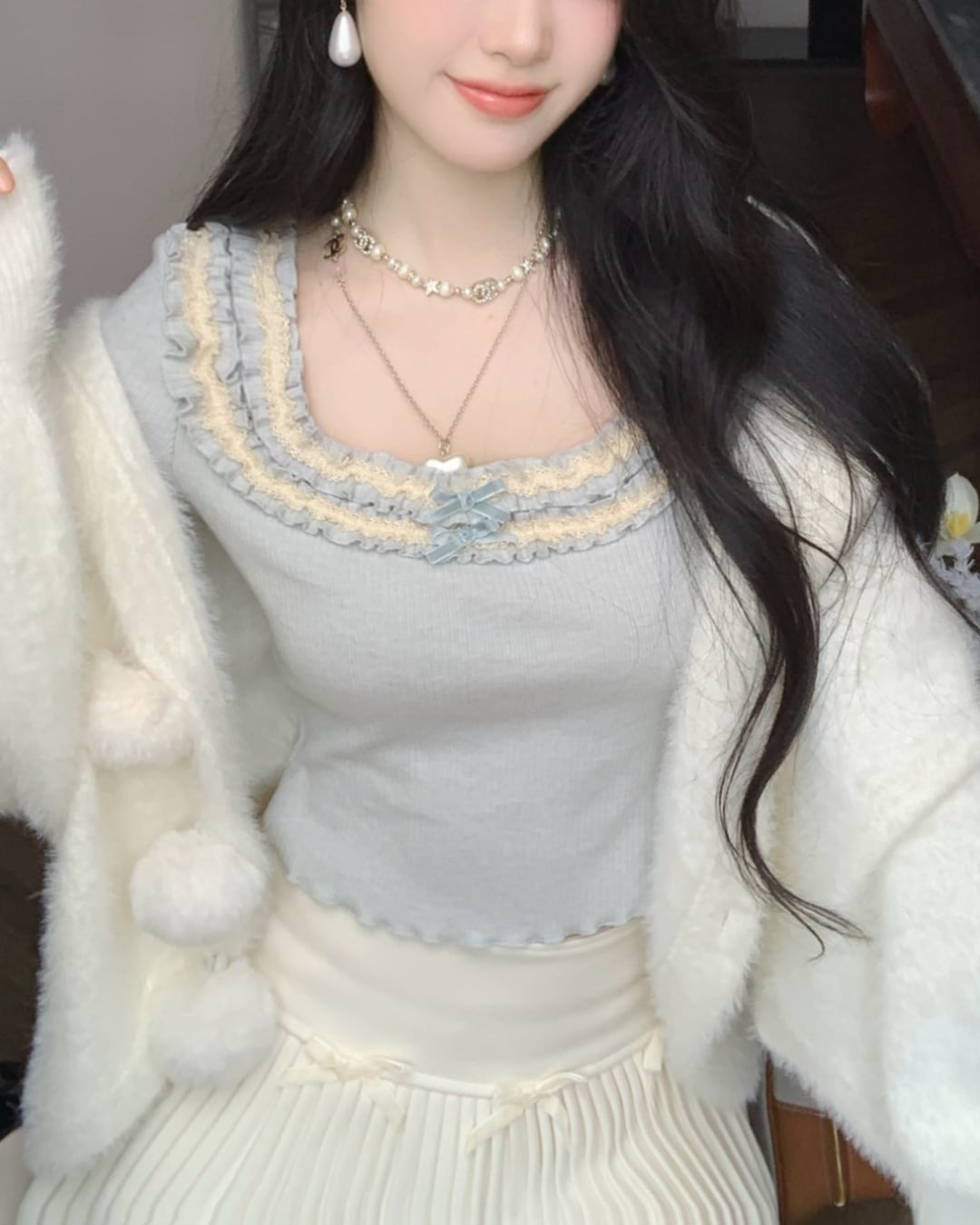 ふわふわ質感のシャギーニットに、ころんと揺れるボンボンがポイント♡