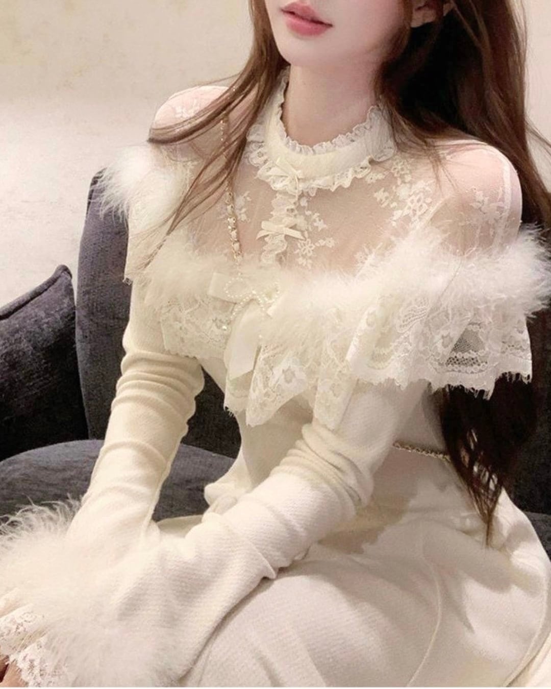 ふんわりファーと繊細なレースをあしらった、上品ムード漂うオフショルデザイン♡