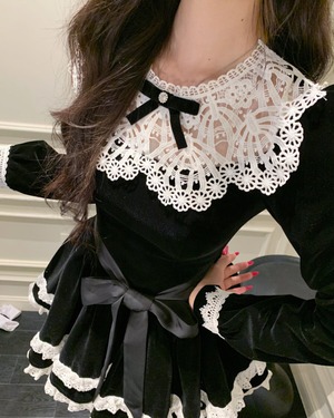 クラシカルなレース襟と光沢感のあるベルベットが上品な印象のワンピース♡