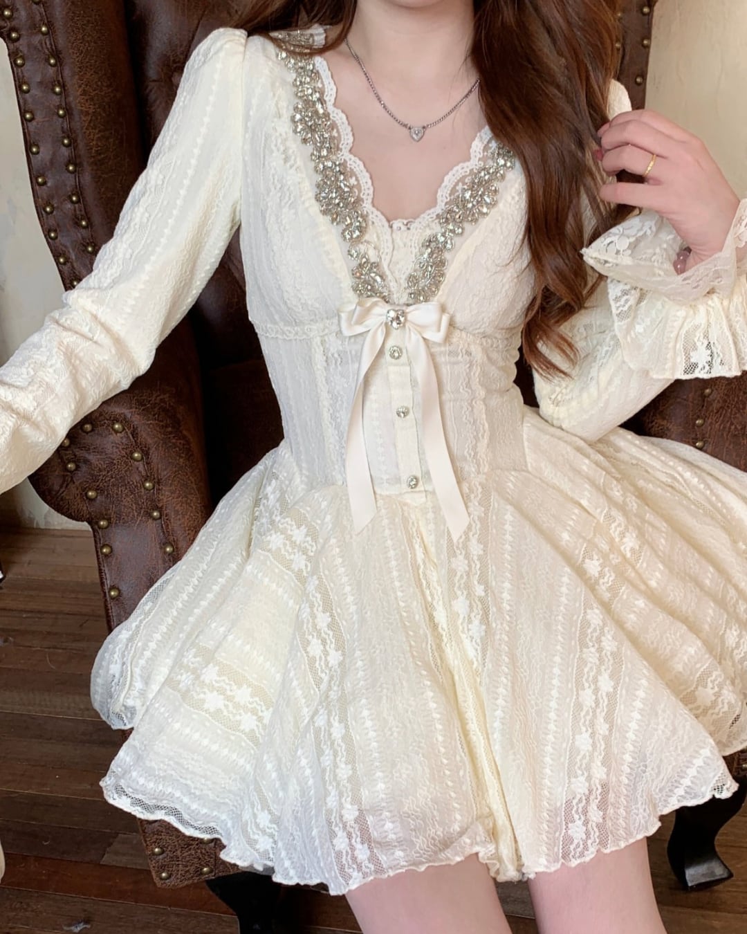 胸元にきらめくビジューとリボンをあしらった、華やかなホワイトワンピース♡