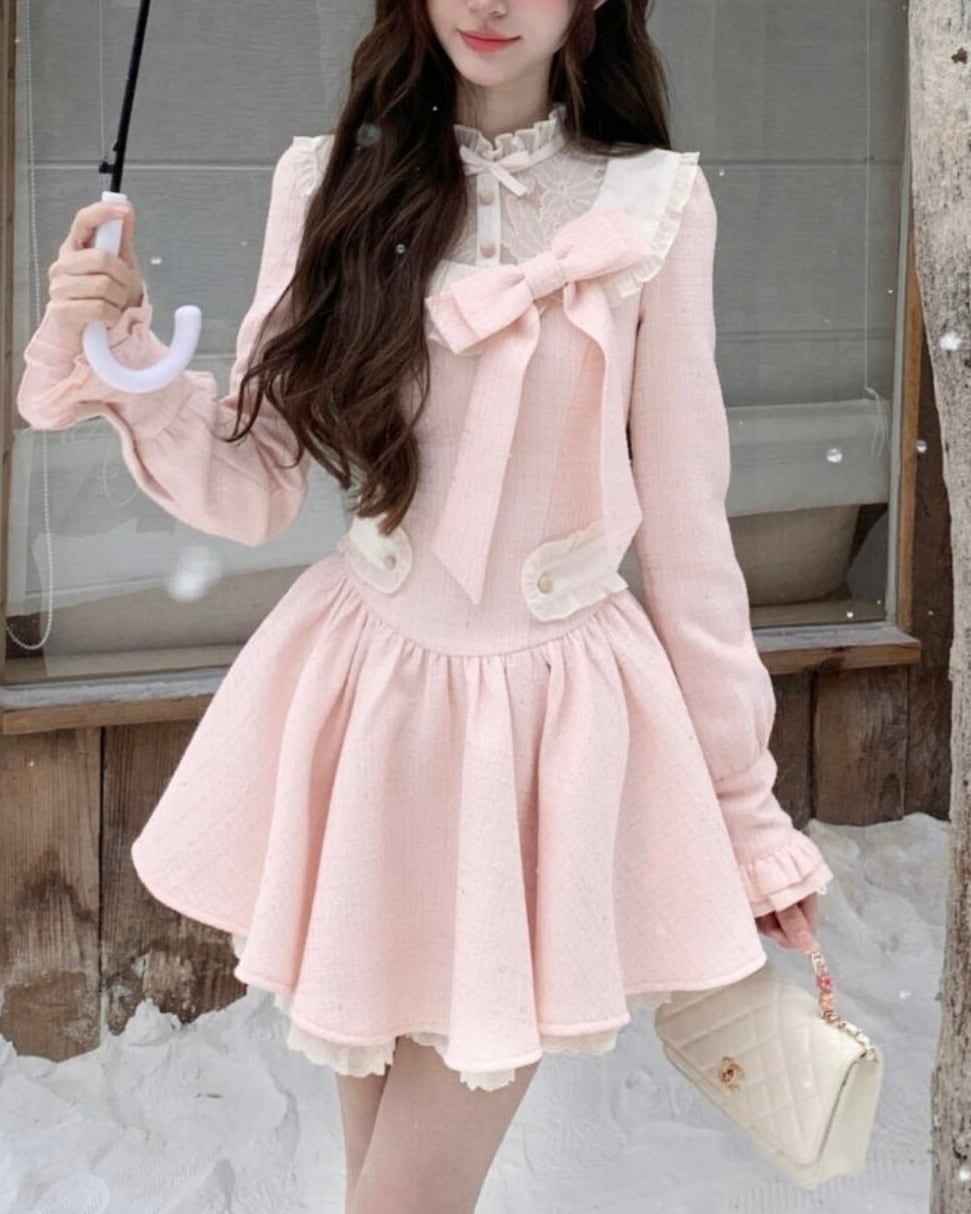ツイード素材に大きめリボンを添えた、甘めなフレアシルエットワンピース♡