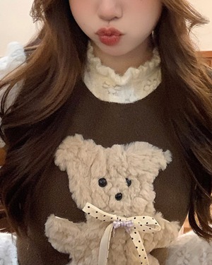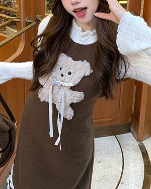 モコモコくまモチーフが目を引く、甘めデザインのフェイクツーピースワンピース♡
