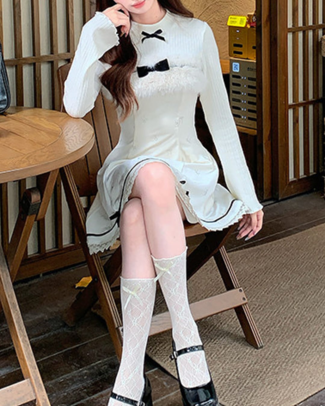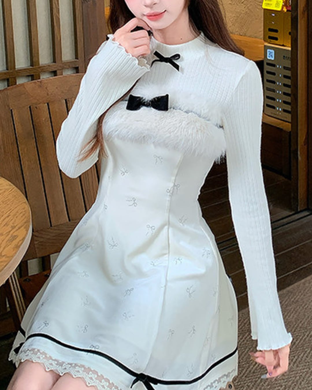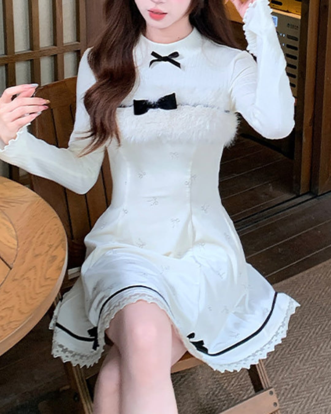 真っ白のホワイトカラーに、ブラックリボンと胸元のファーがポイントのワンピース♡
