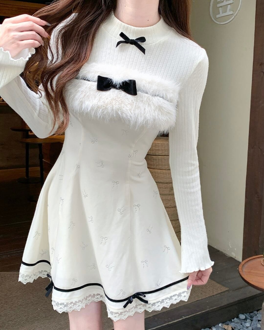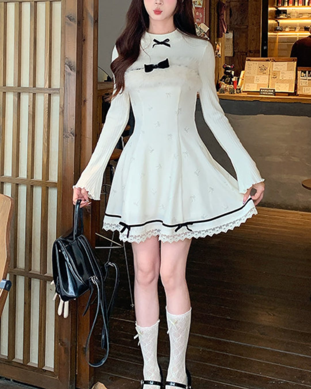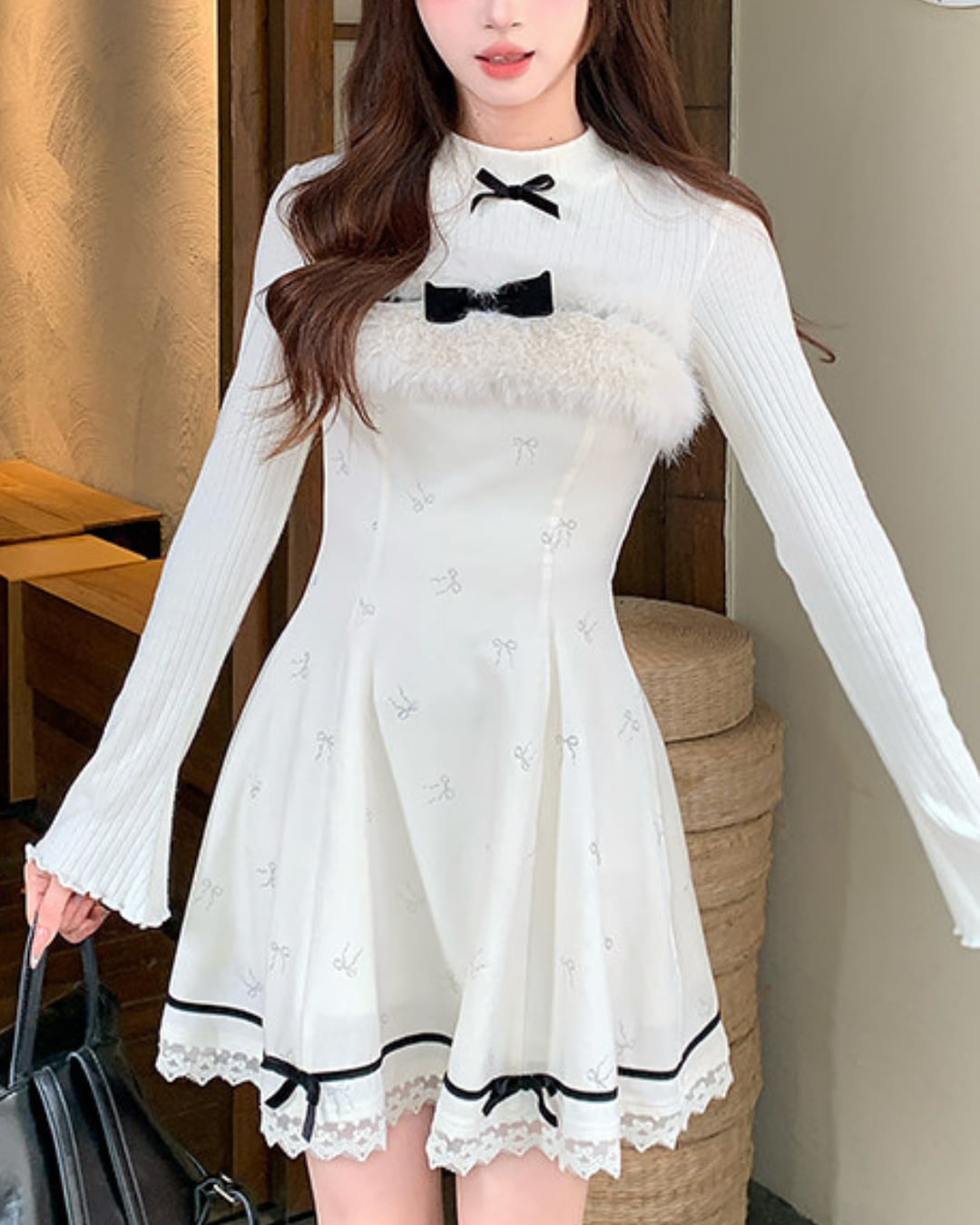 真っ白のホワイトカラーに、ブラックリボンと胸元のファーがポイントのワンピース♡