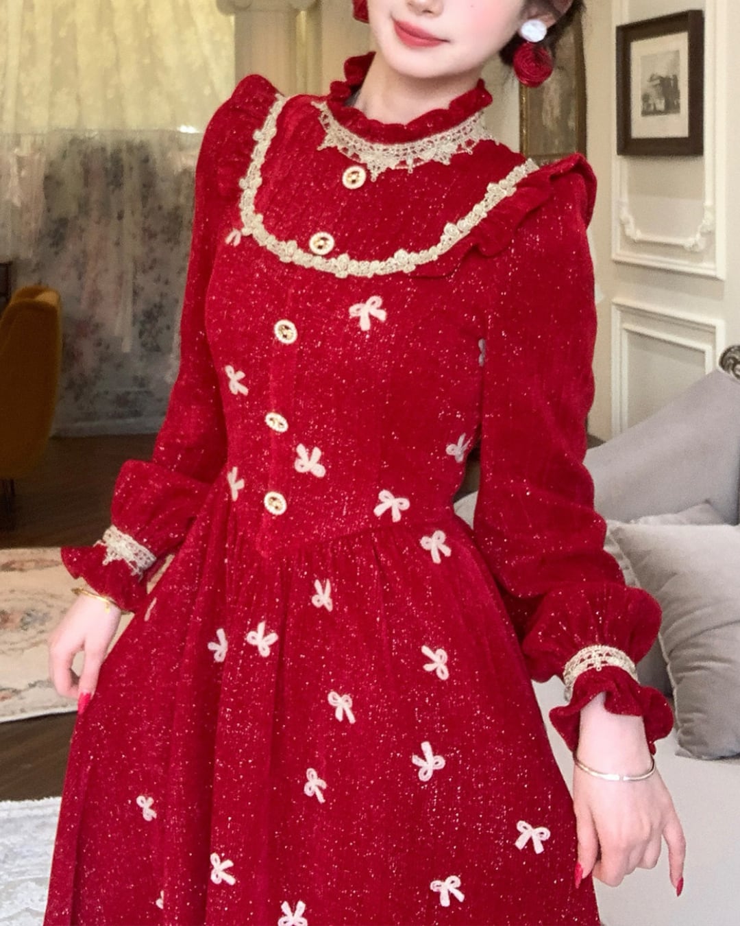 ロマンチックレッドリボンパターンワンピース 25W08349