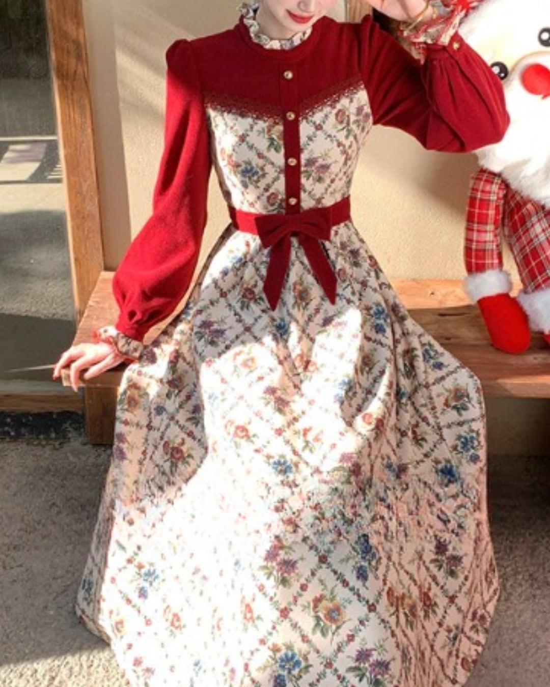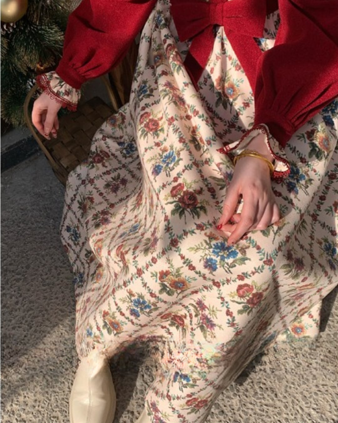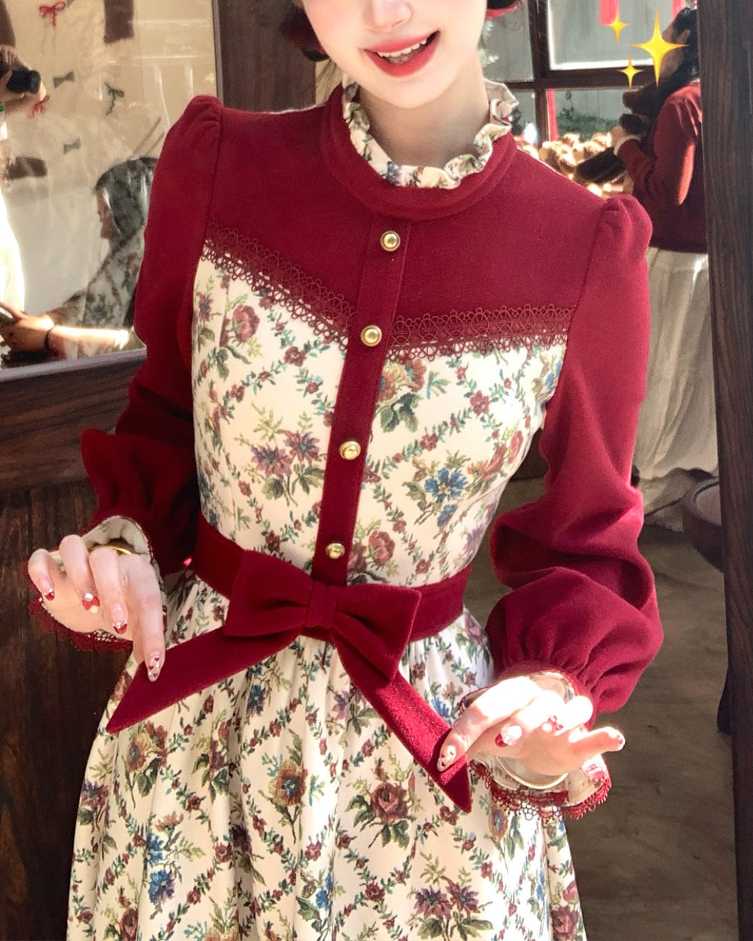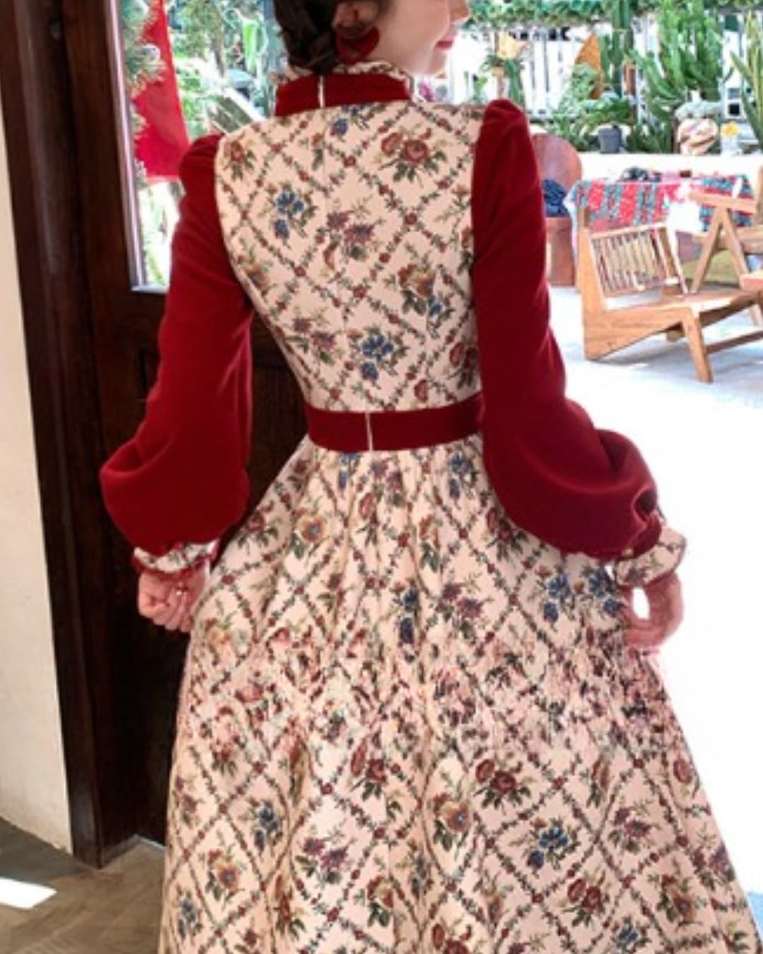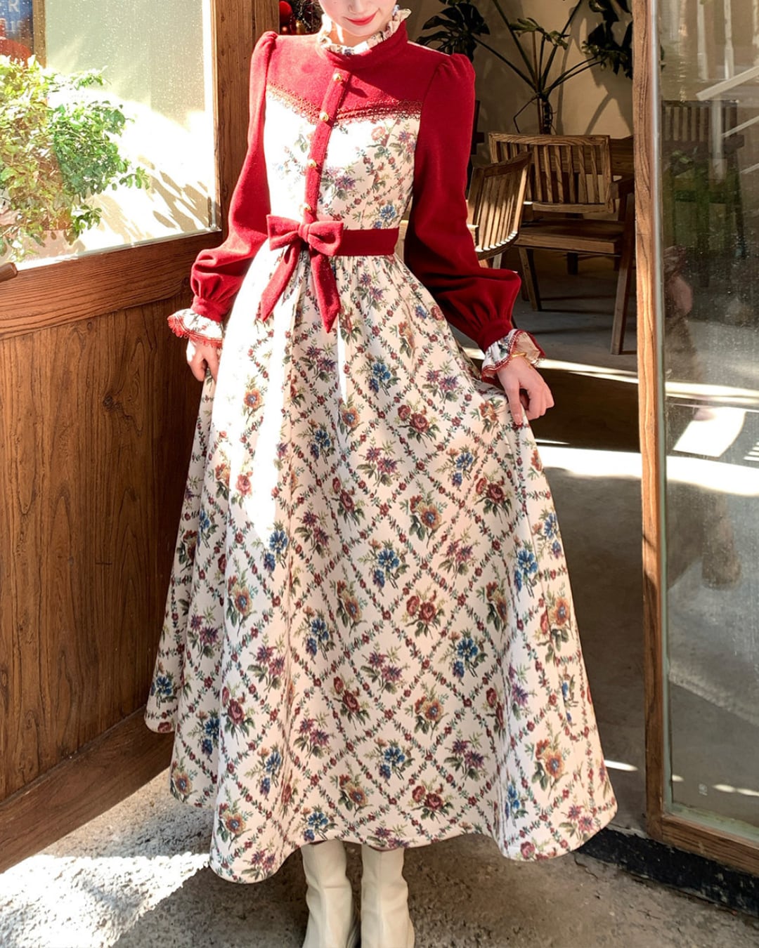 クラシカルな花柄と赤のコントラストが映えるレトロワンピース♡