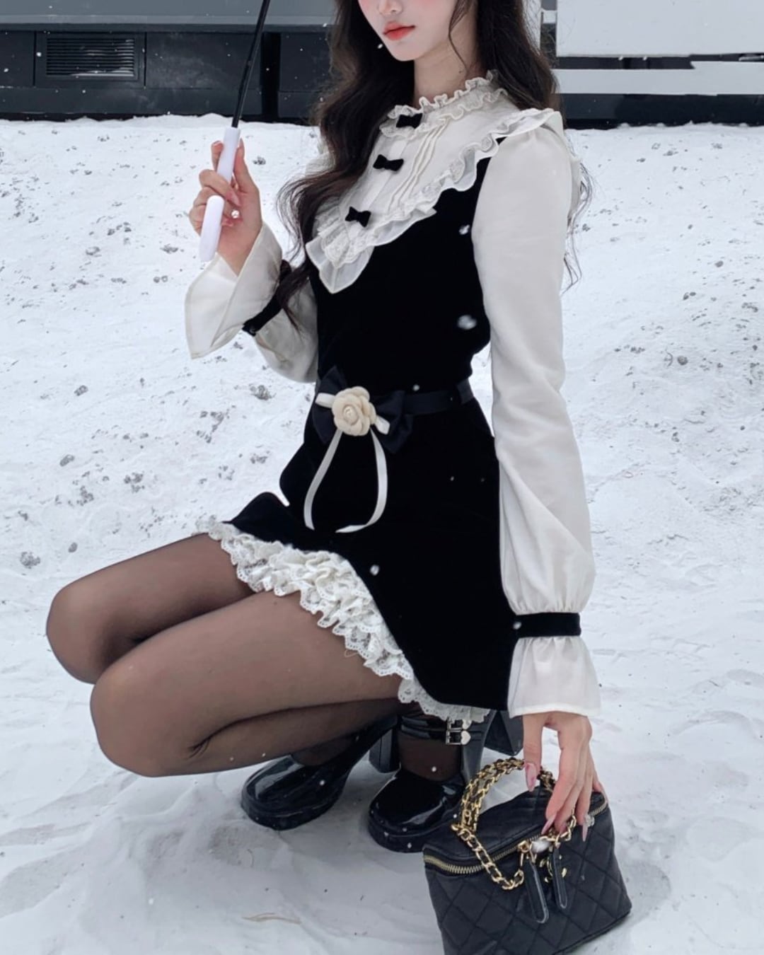 コントラストカラーの配色と甘めディテールでフレンチガーリーな印象に