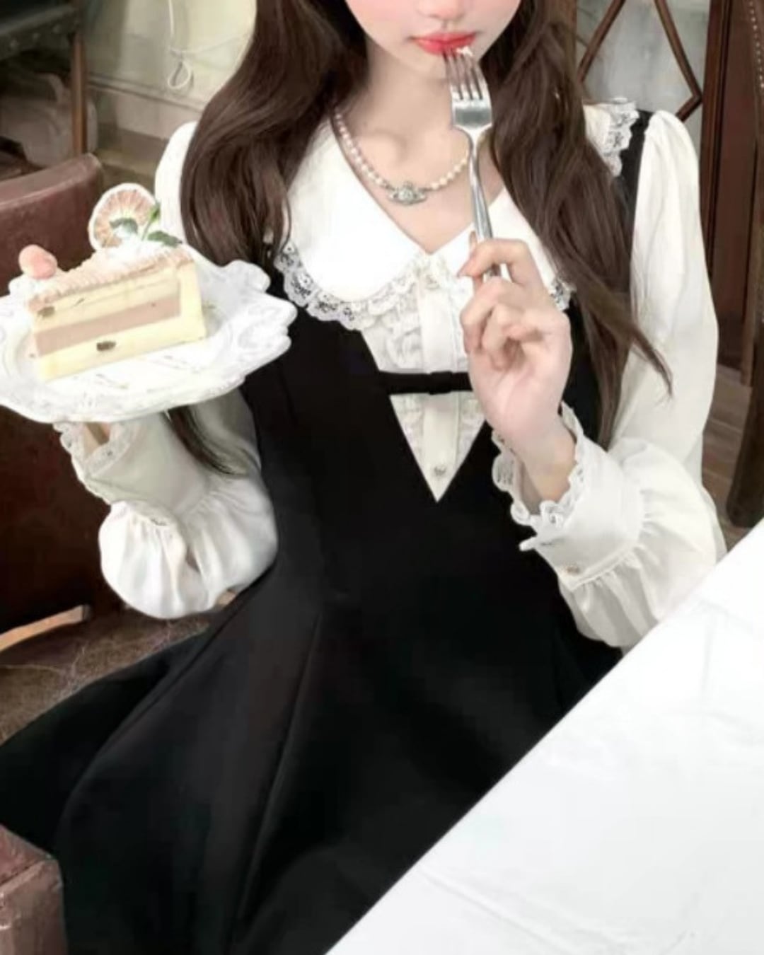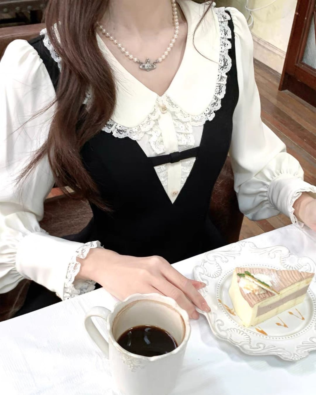 レース付きのガーリーシャツにVネックラインが映えるワンピースを重ねたワンピース♡
