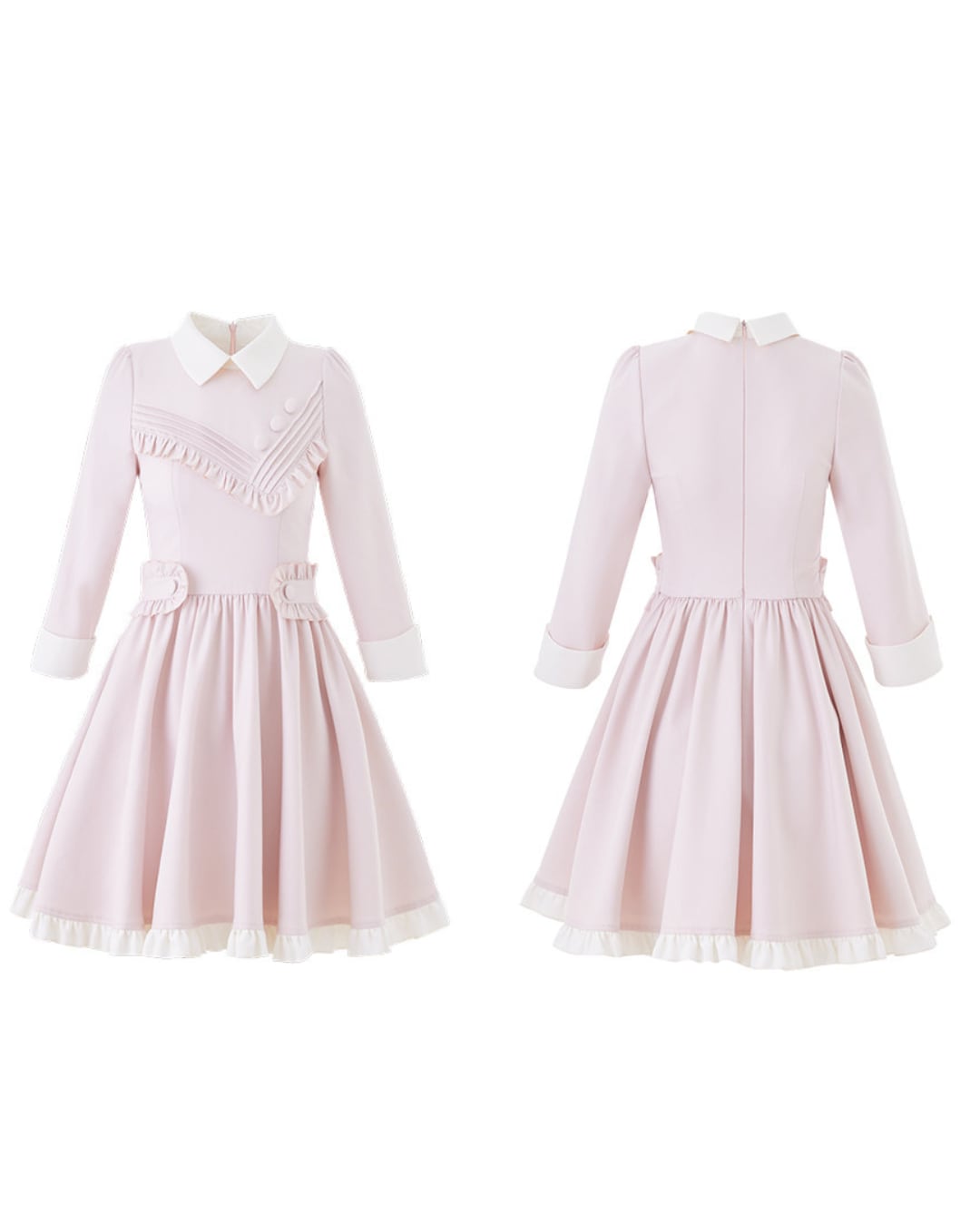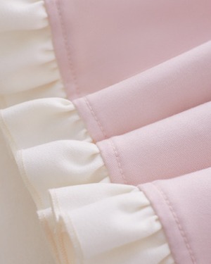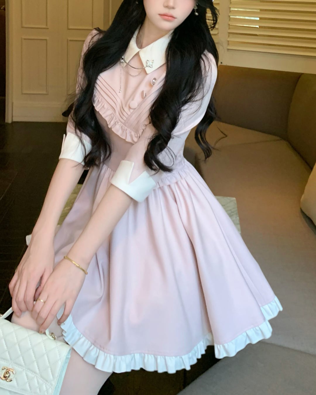 胸元にあしらわれたVラインのフリルが目を惹くフレアワンピース♡