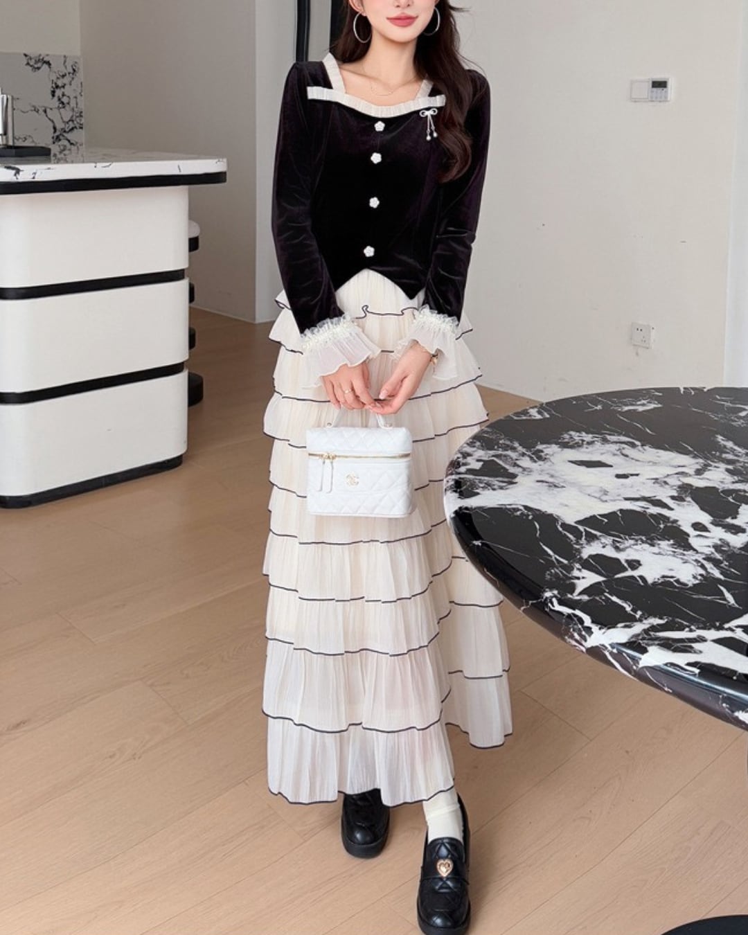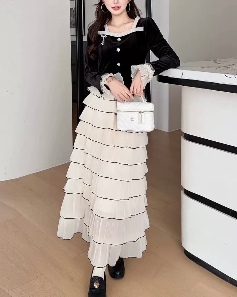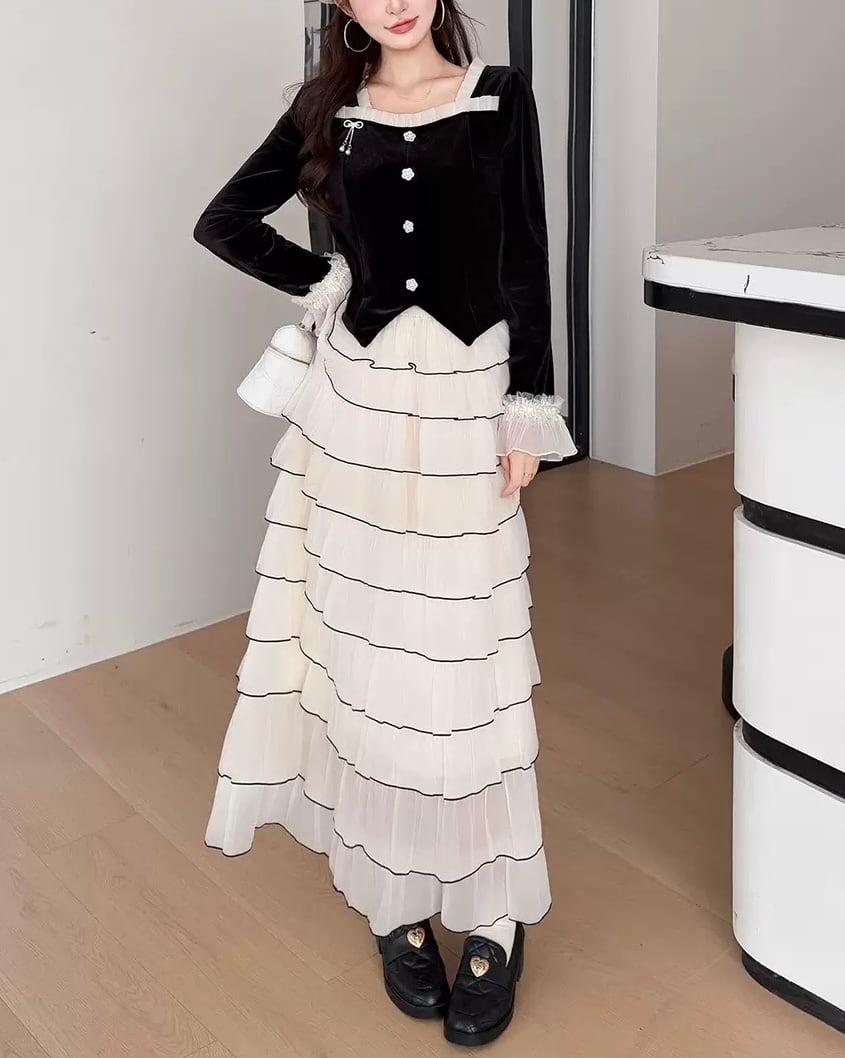 ベルベットトップス&ティアードスカートセット 25W08403