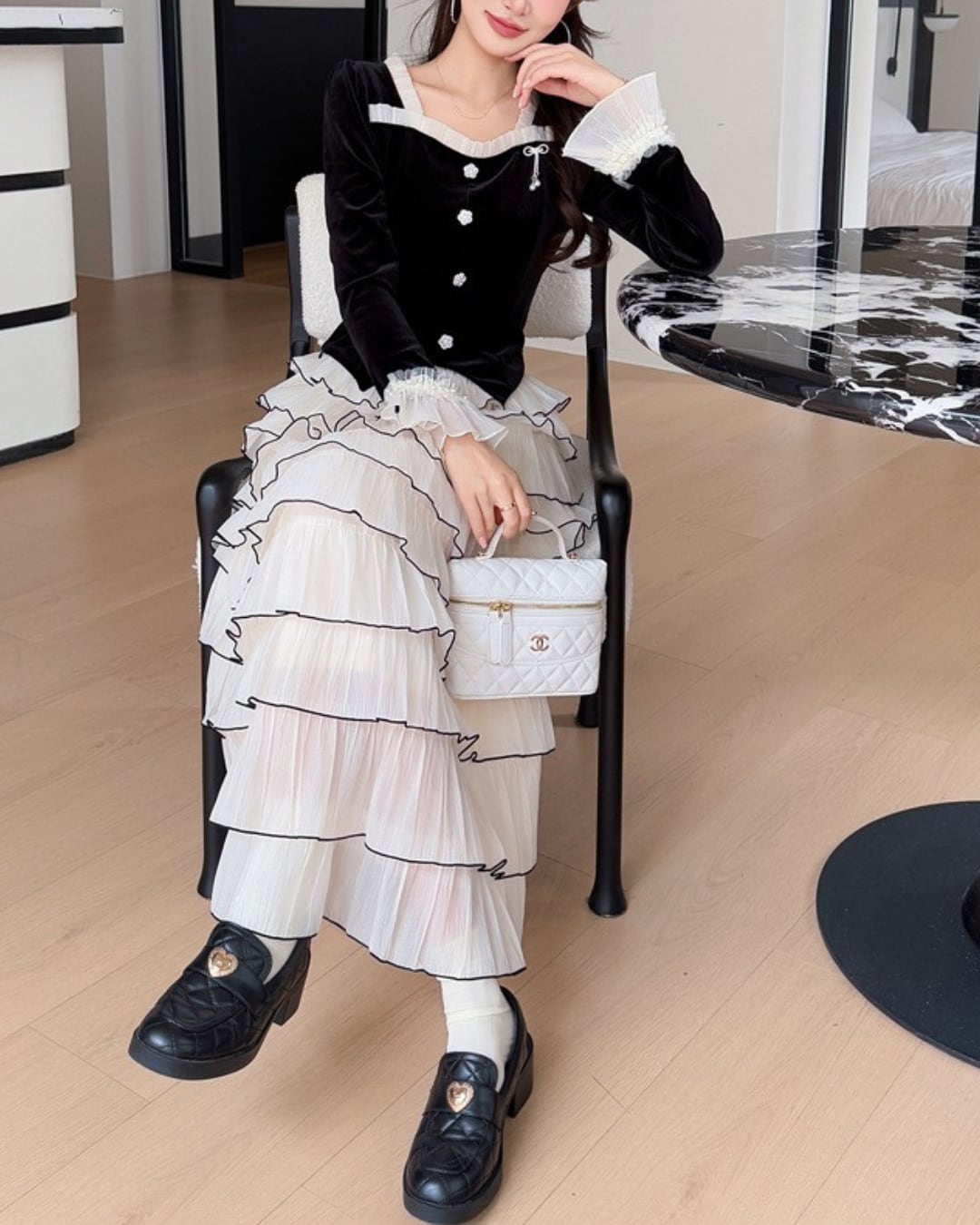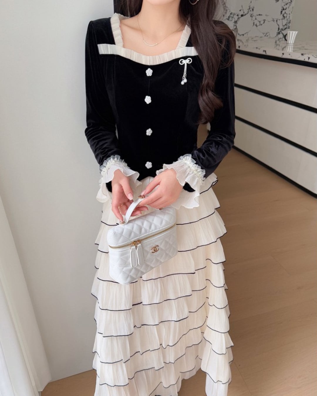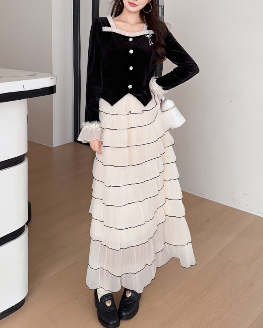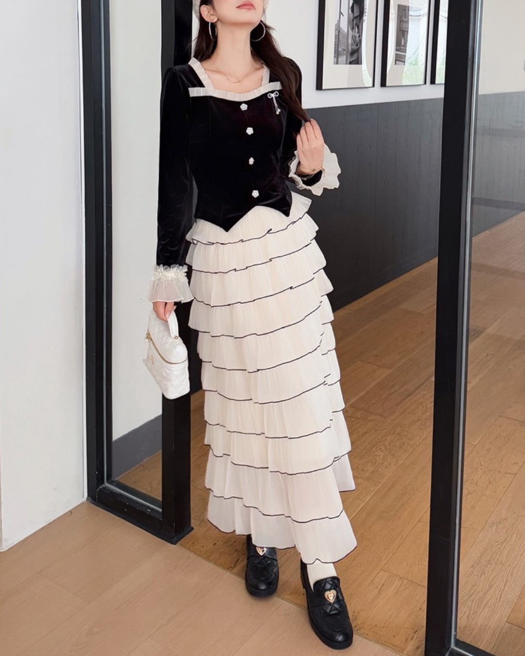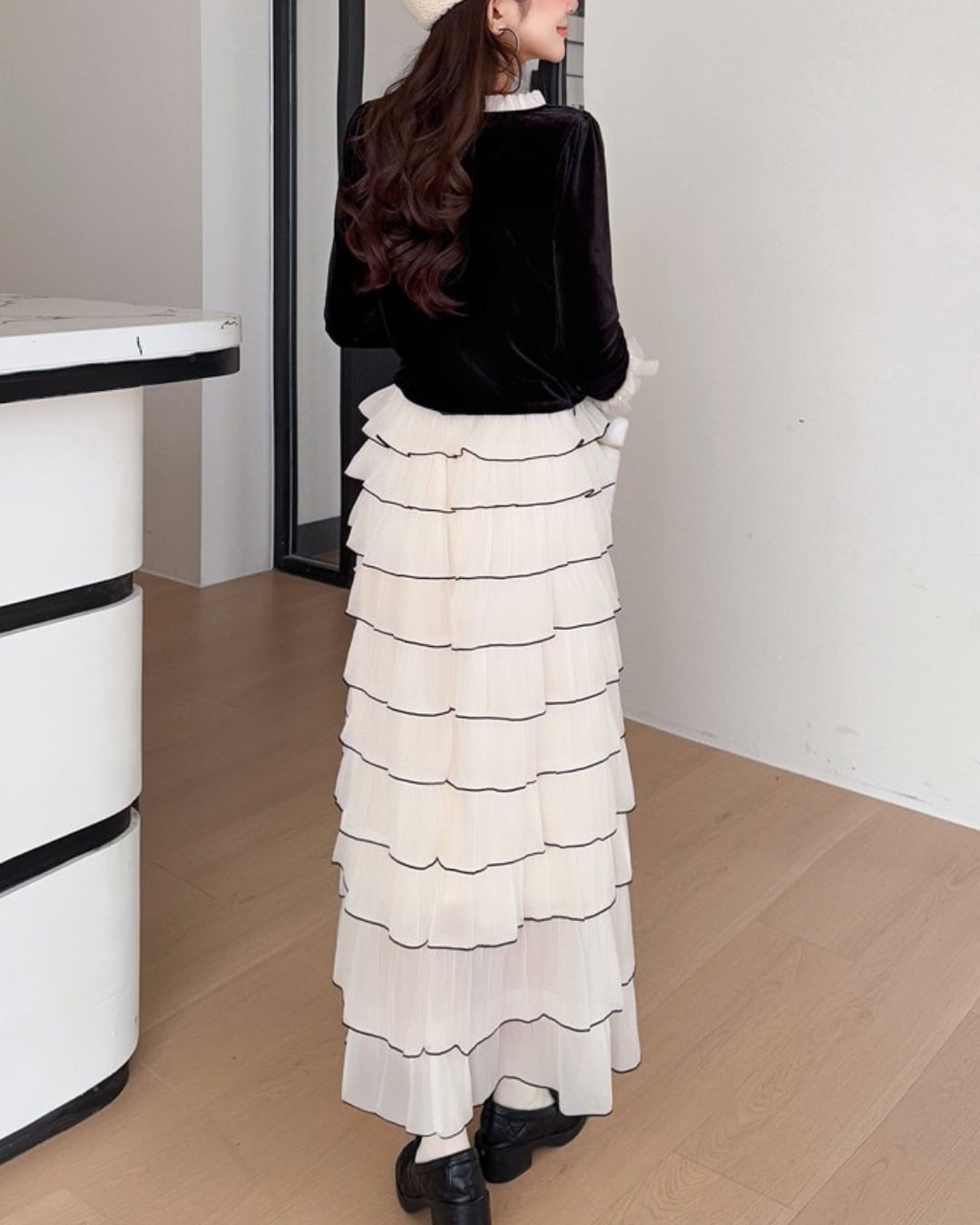 軽やかに揺れるティアードスカートが、女性らしい佇まいを引き立てます⑅⃛