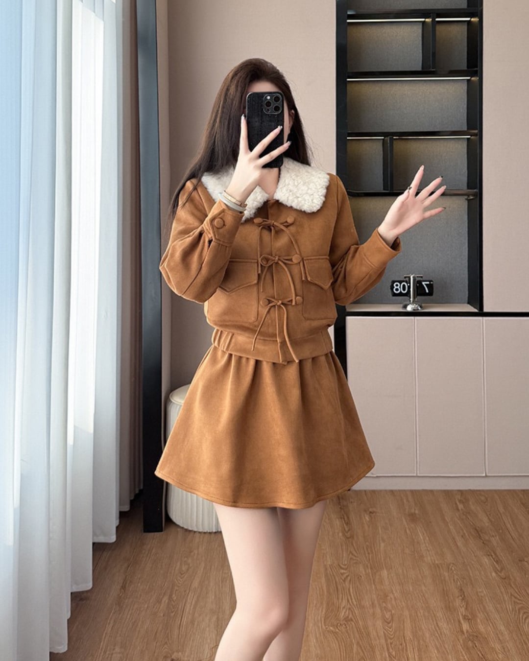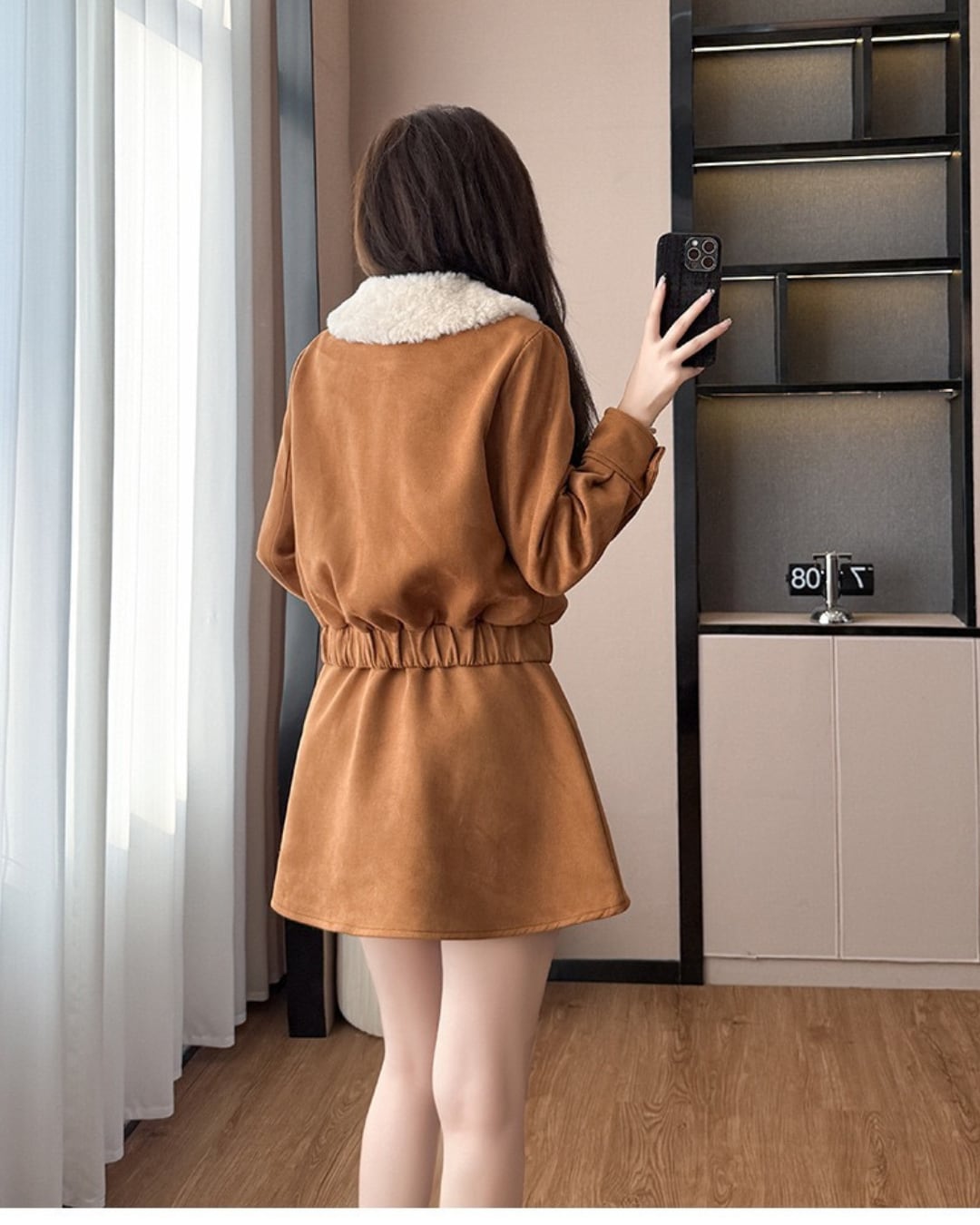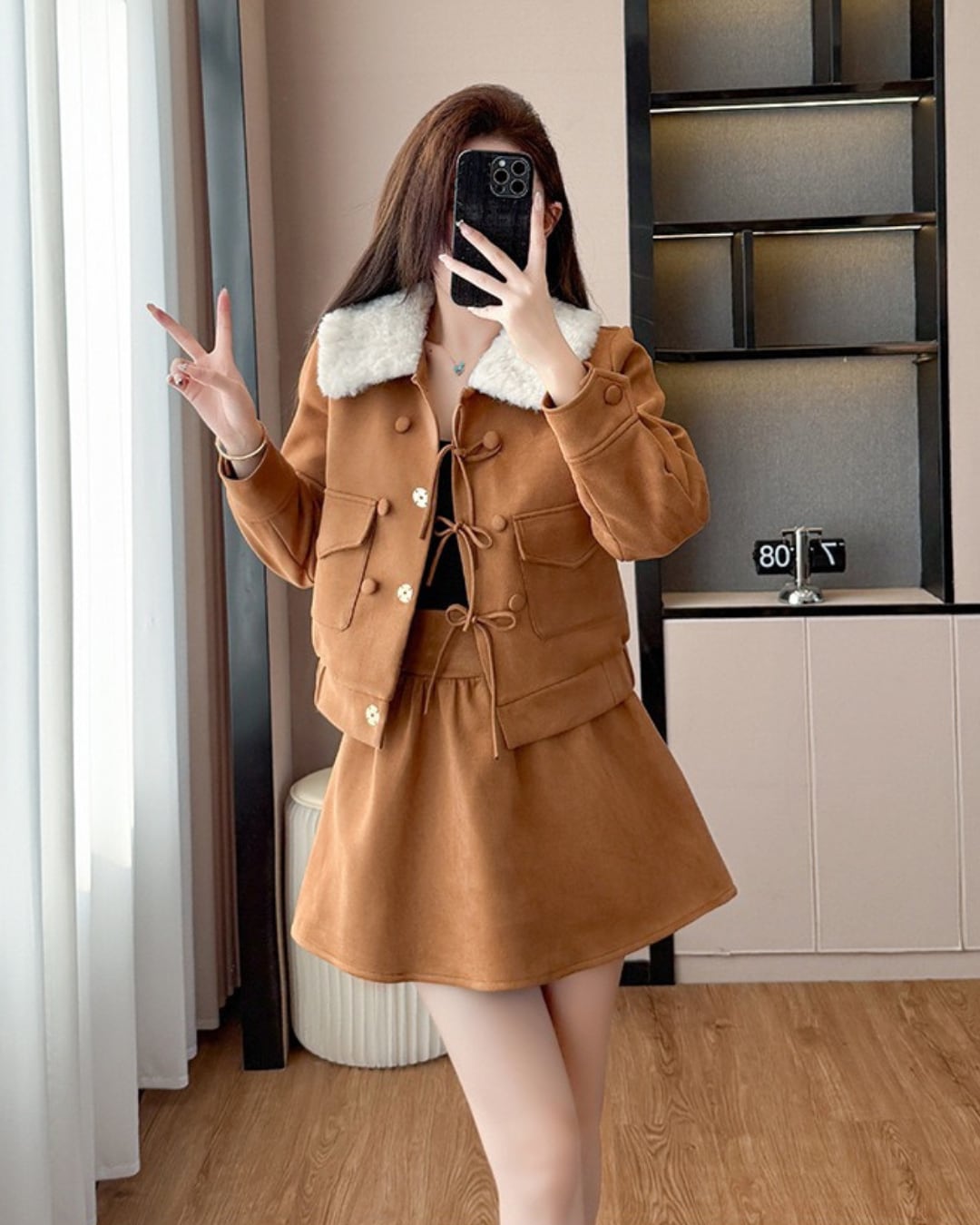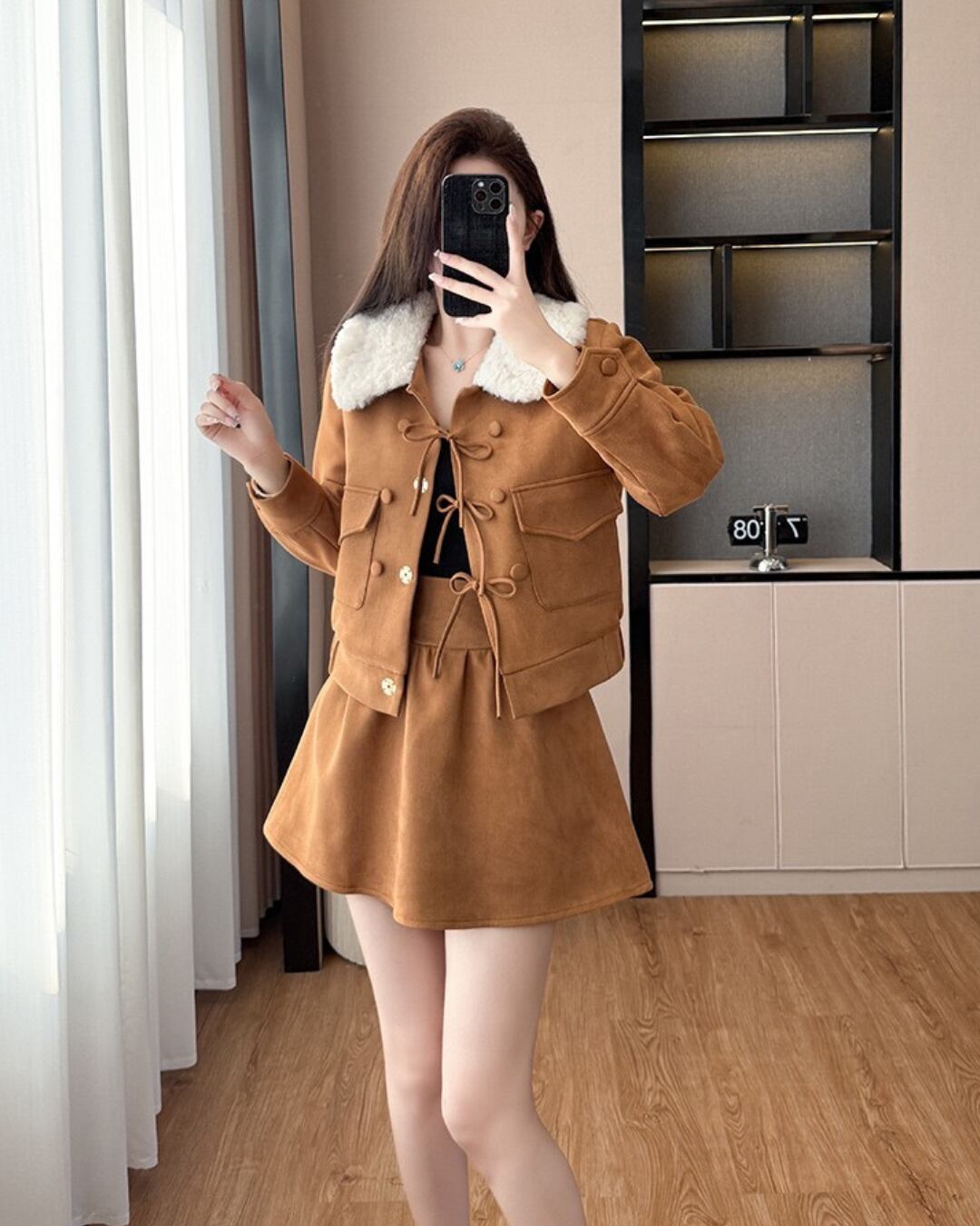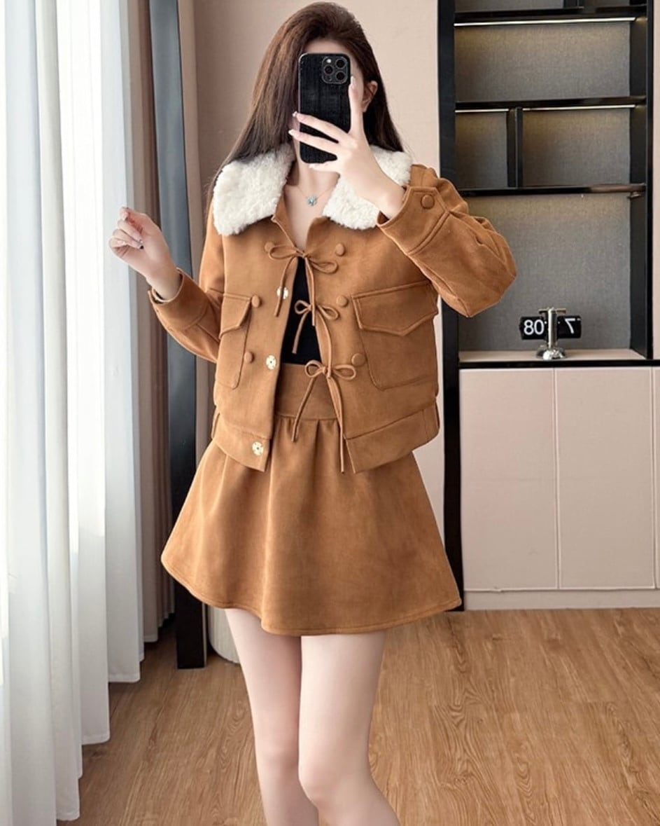 ふわふわのファー襟が映えるセットアップ♡