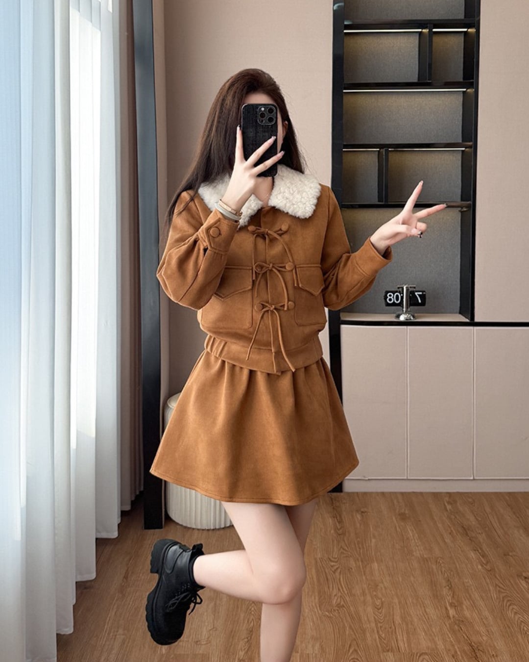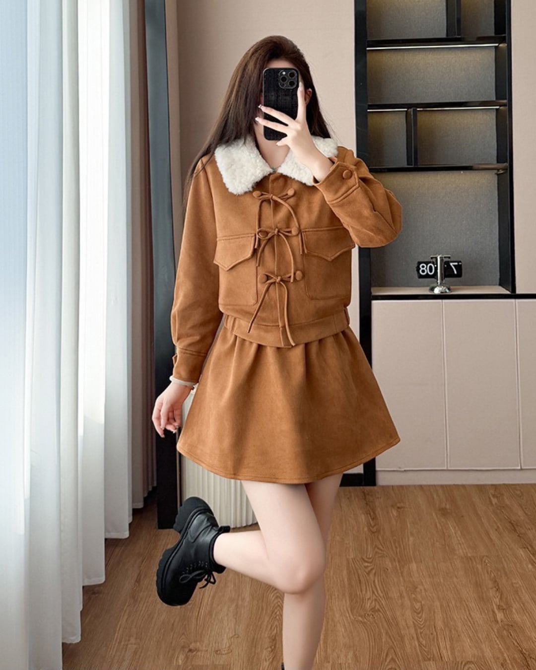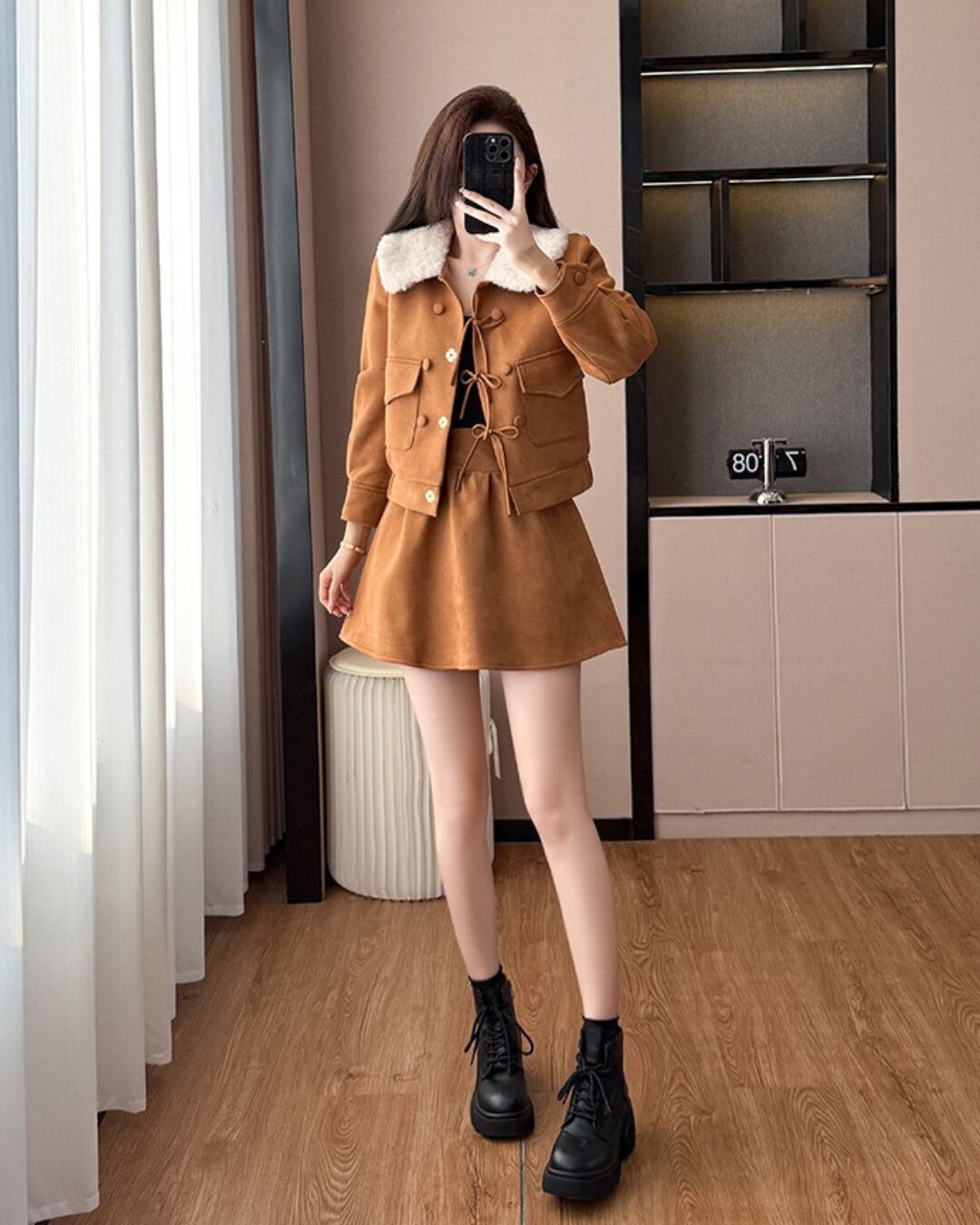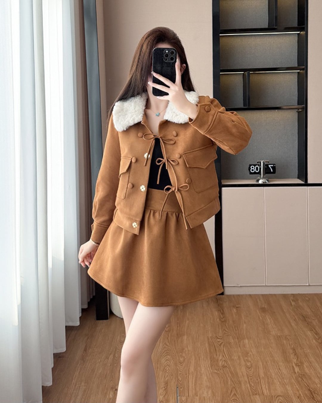 ふわふわのファー襟が映えるセットアップ♡