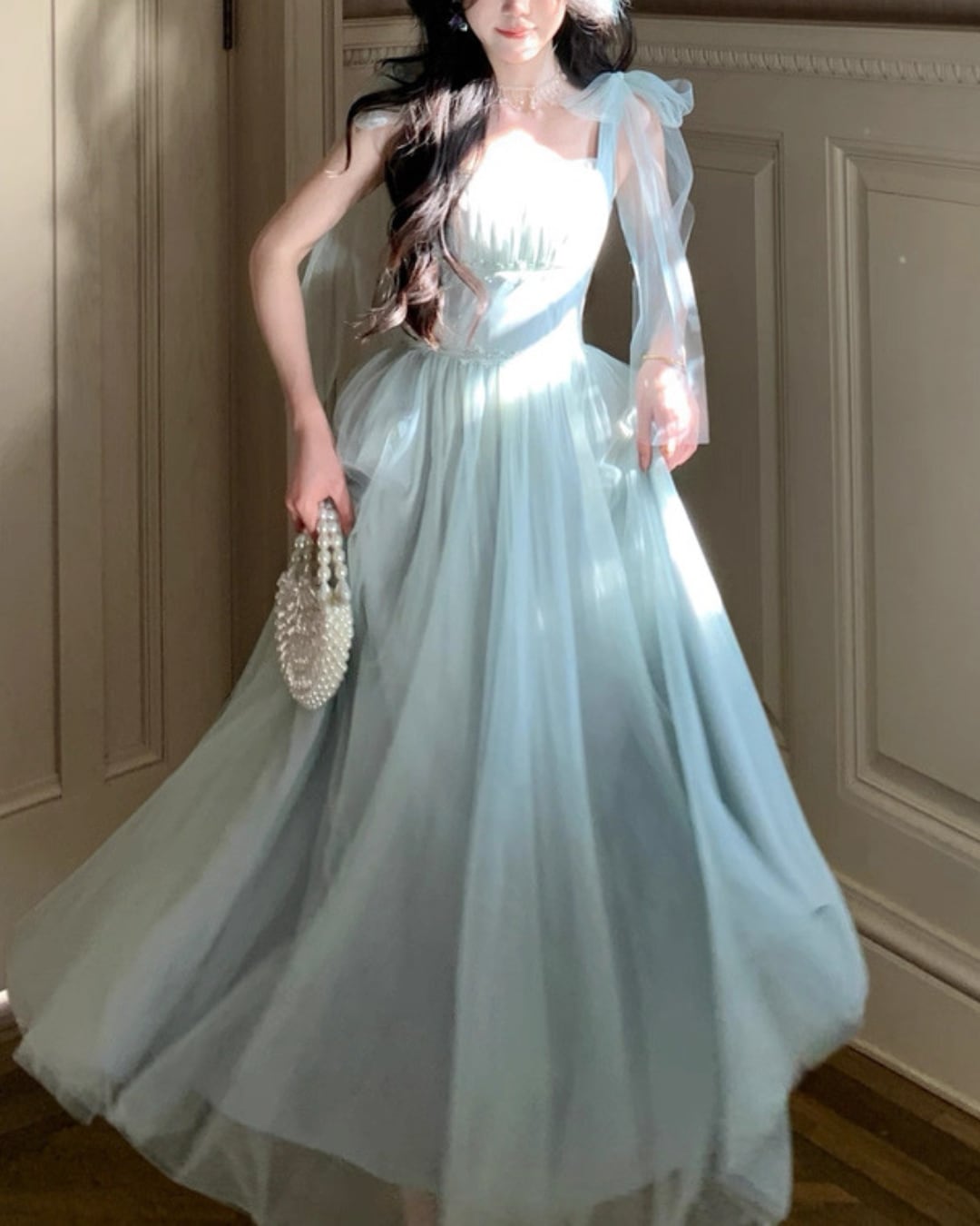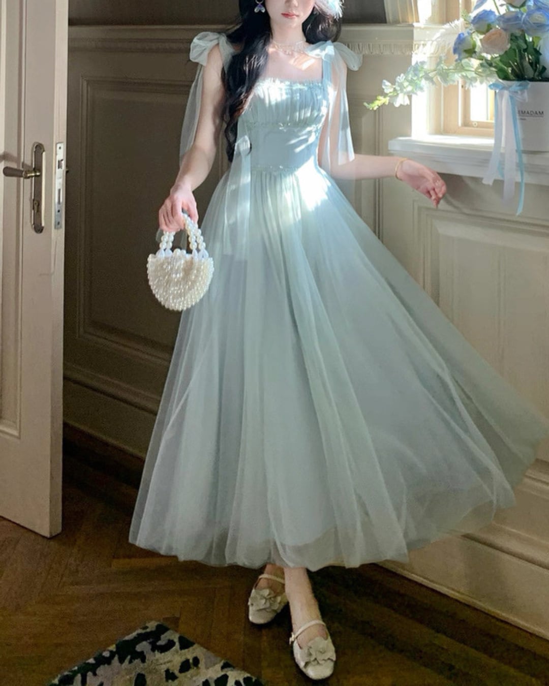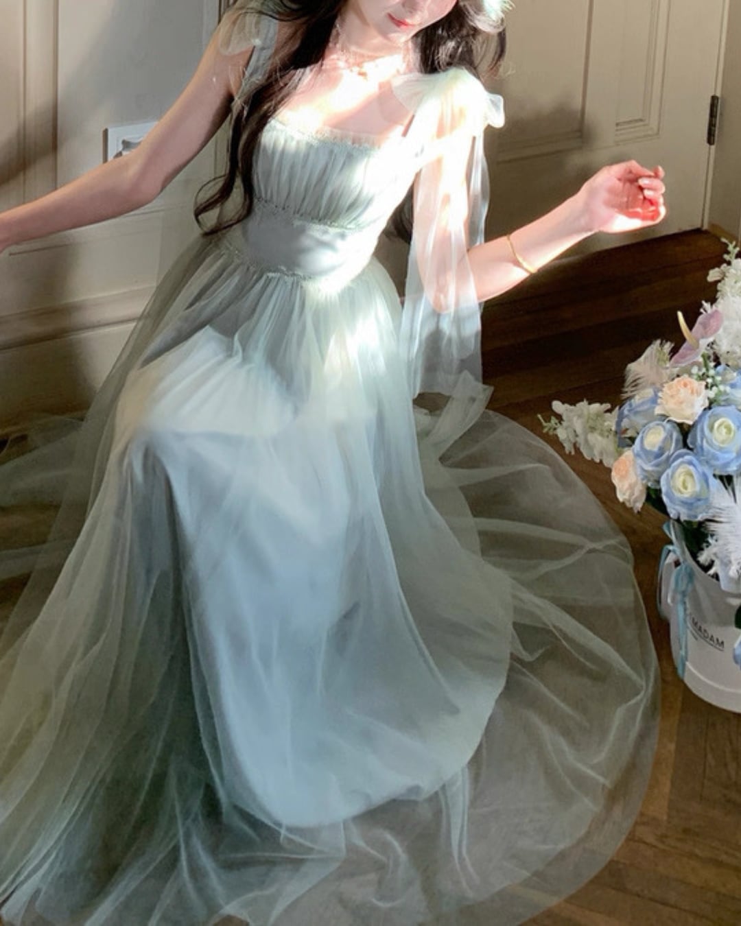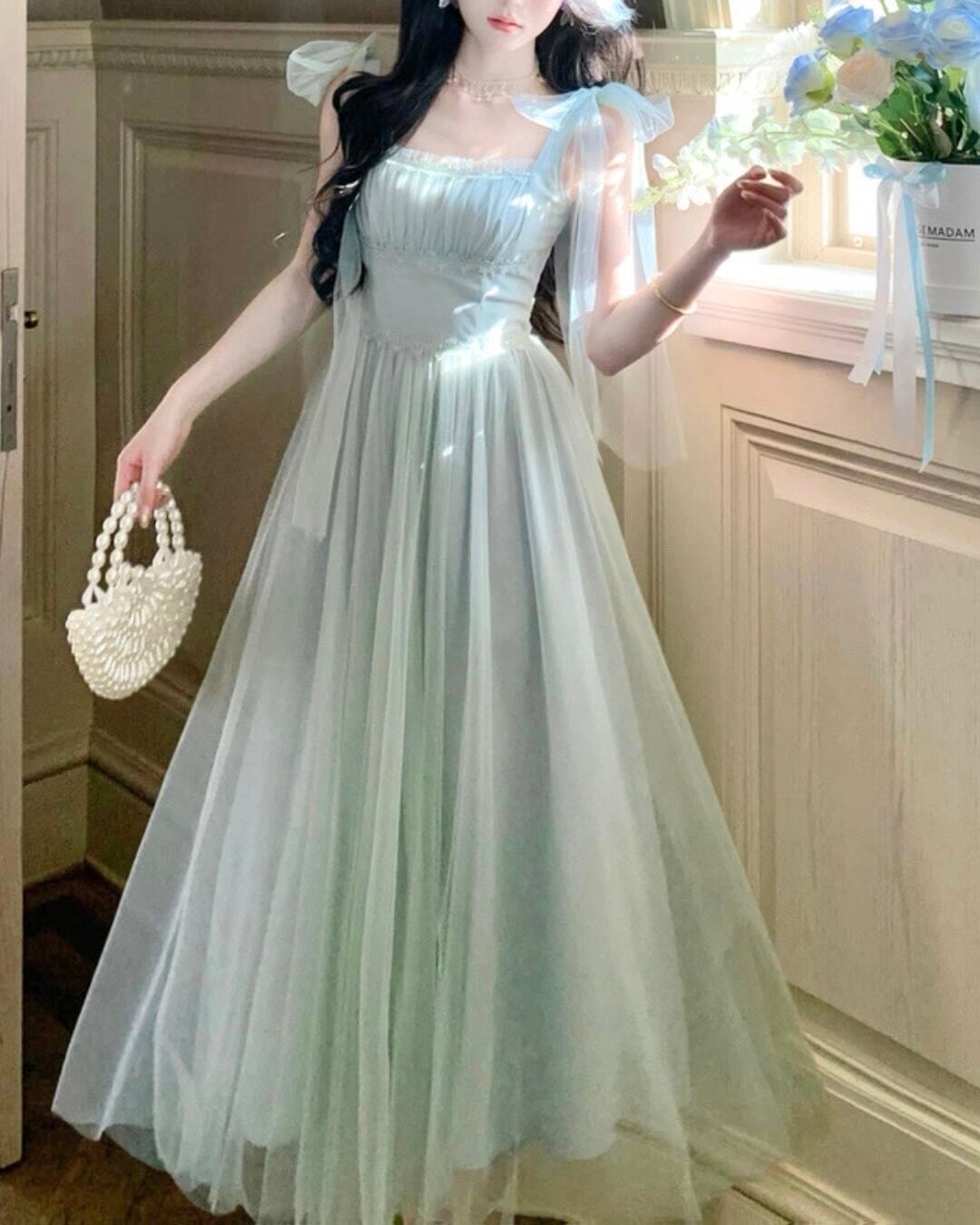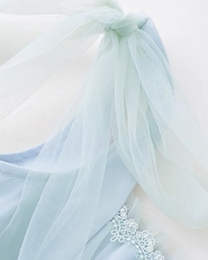 肩のリボンデザインが儚くロマンティックな雰囲気を演出します.*・゚