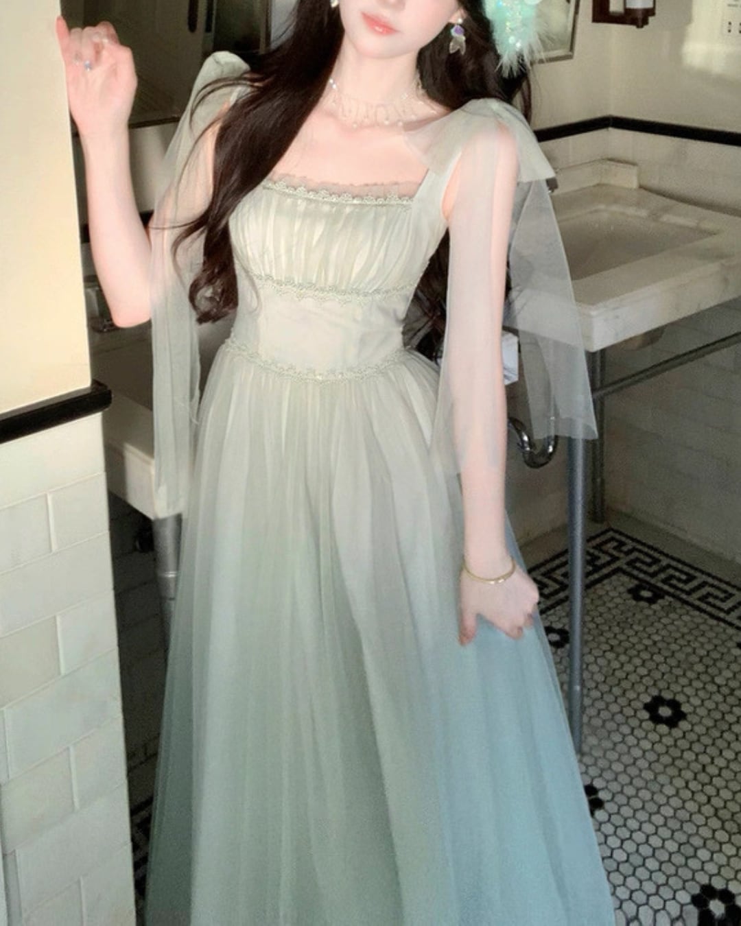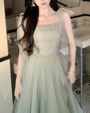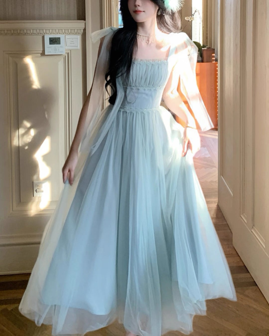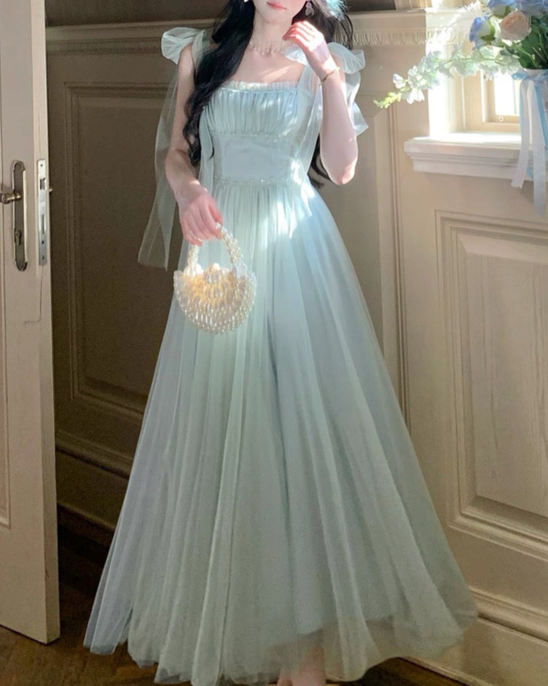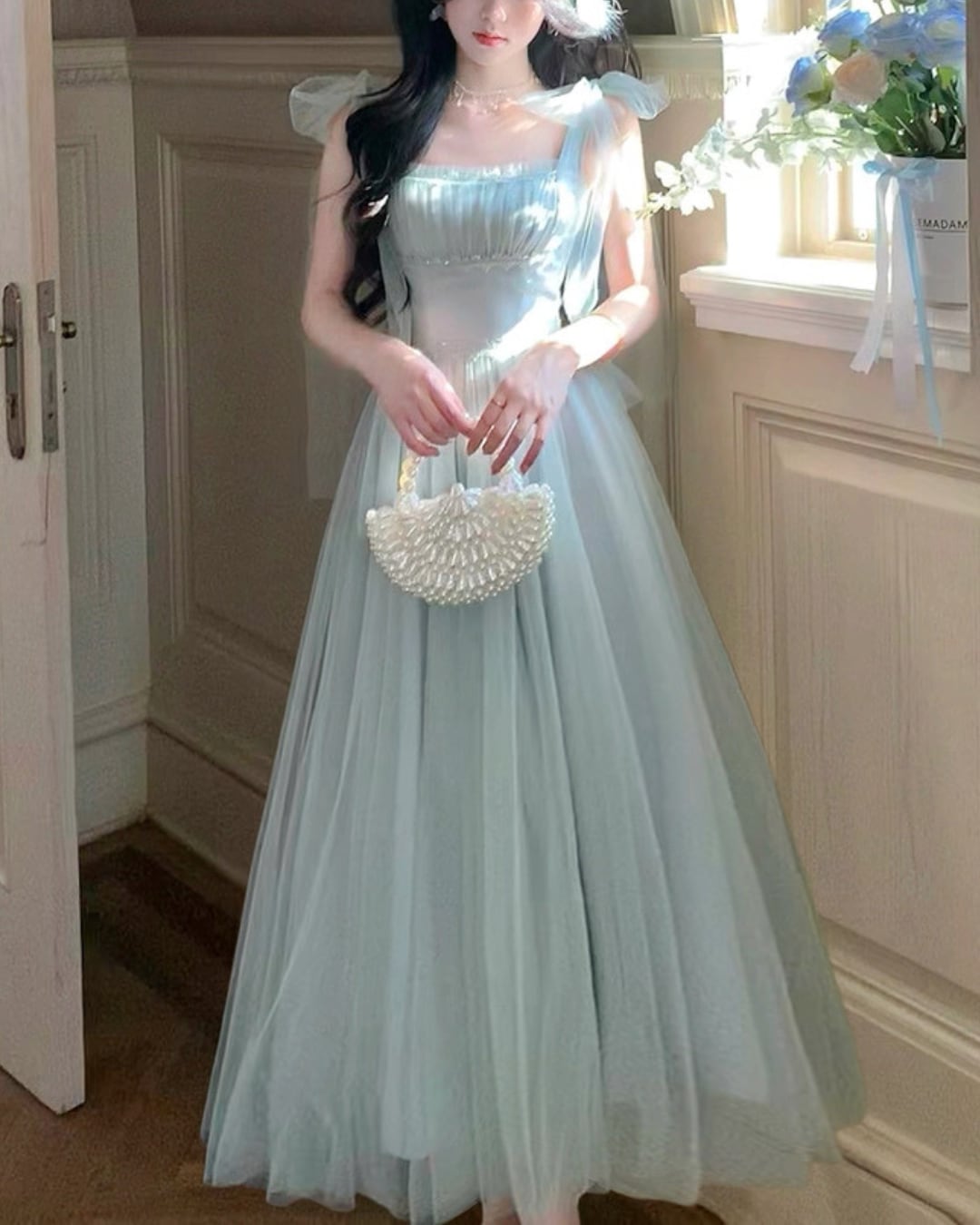肩のリボンデザインが儚くロマンティックな雰囲気を演出します.*・゚