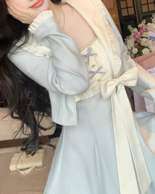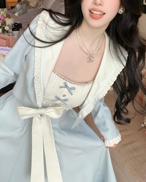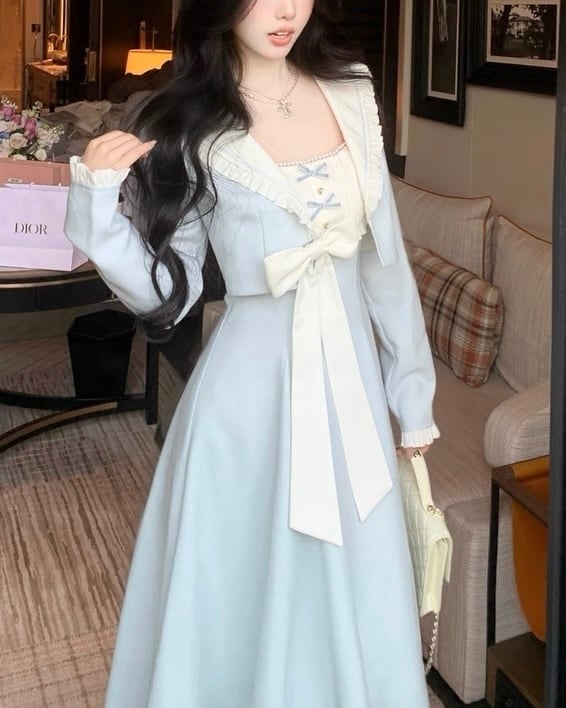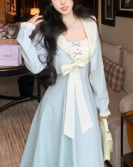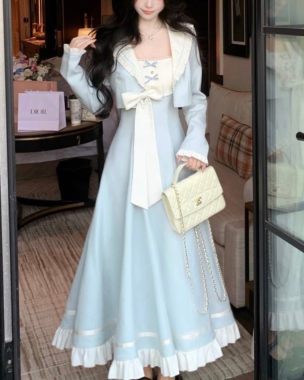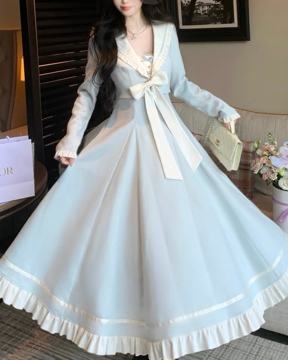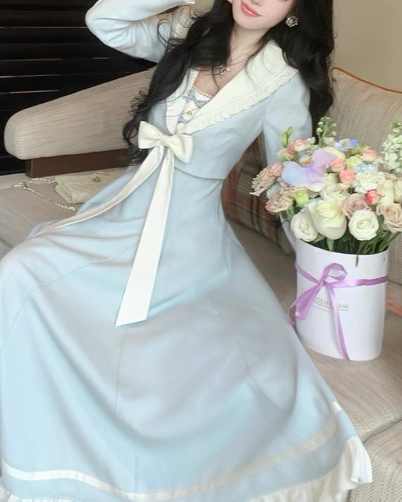 フリル襟とリボンが上品なロングワンピース♡