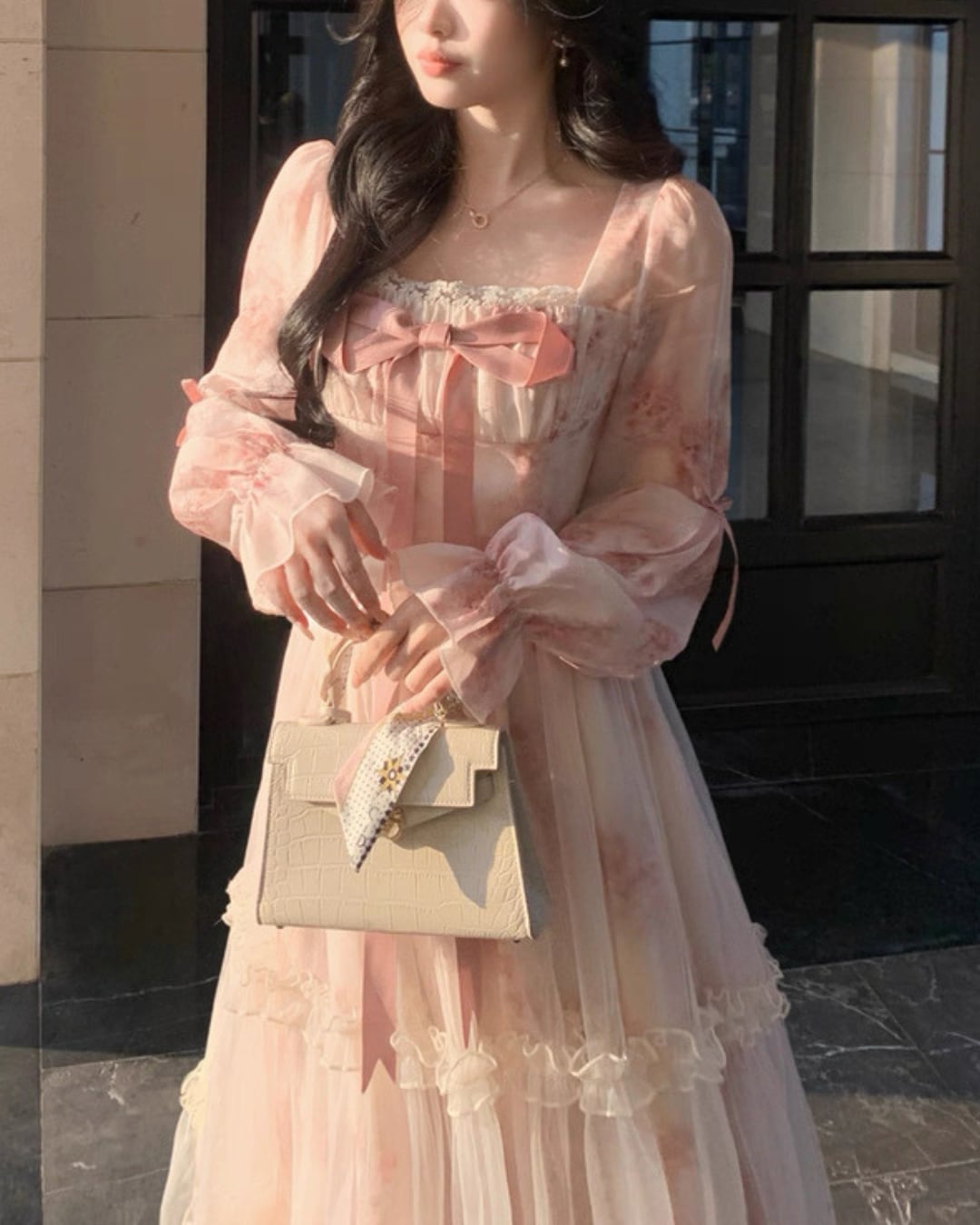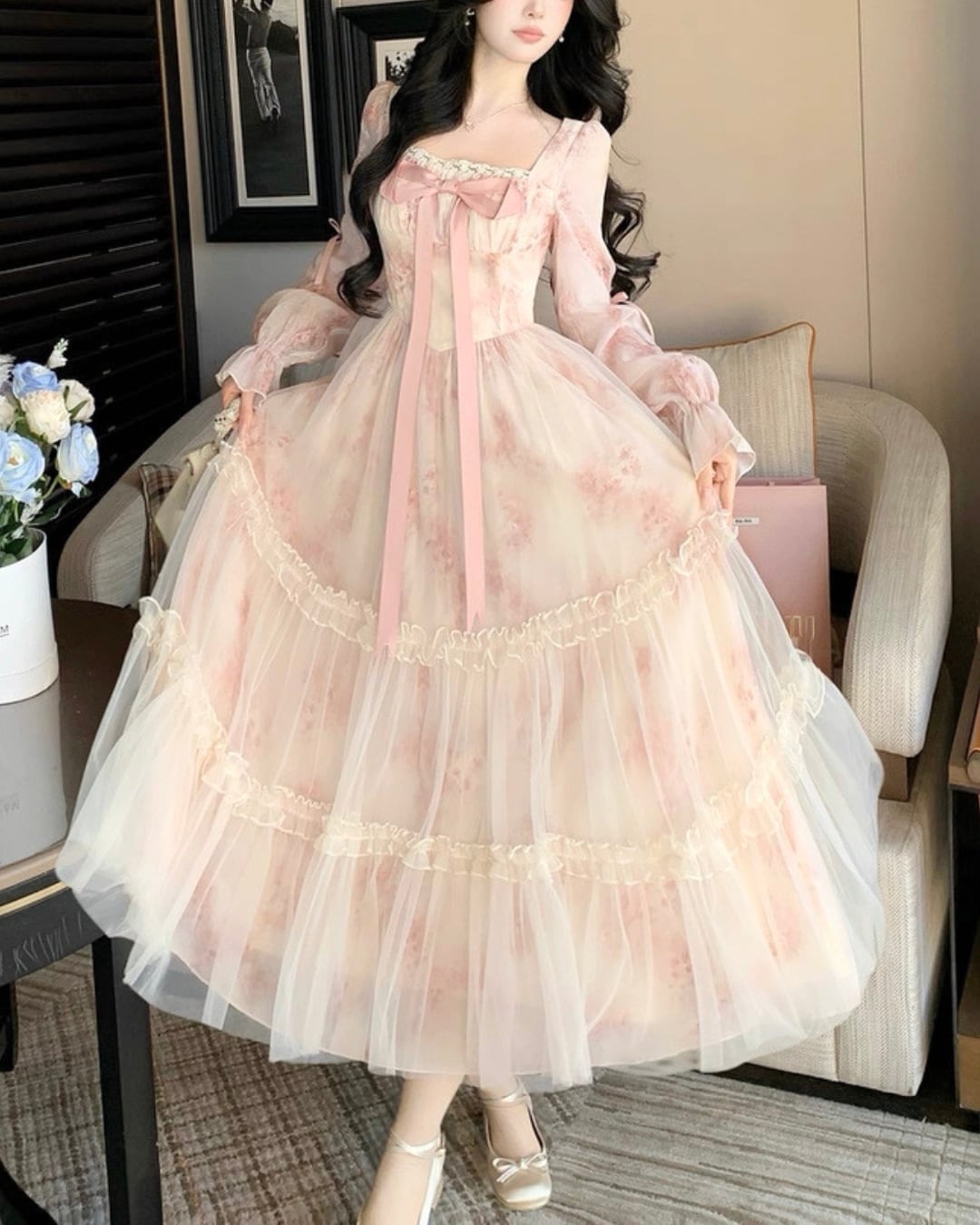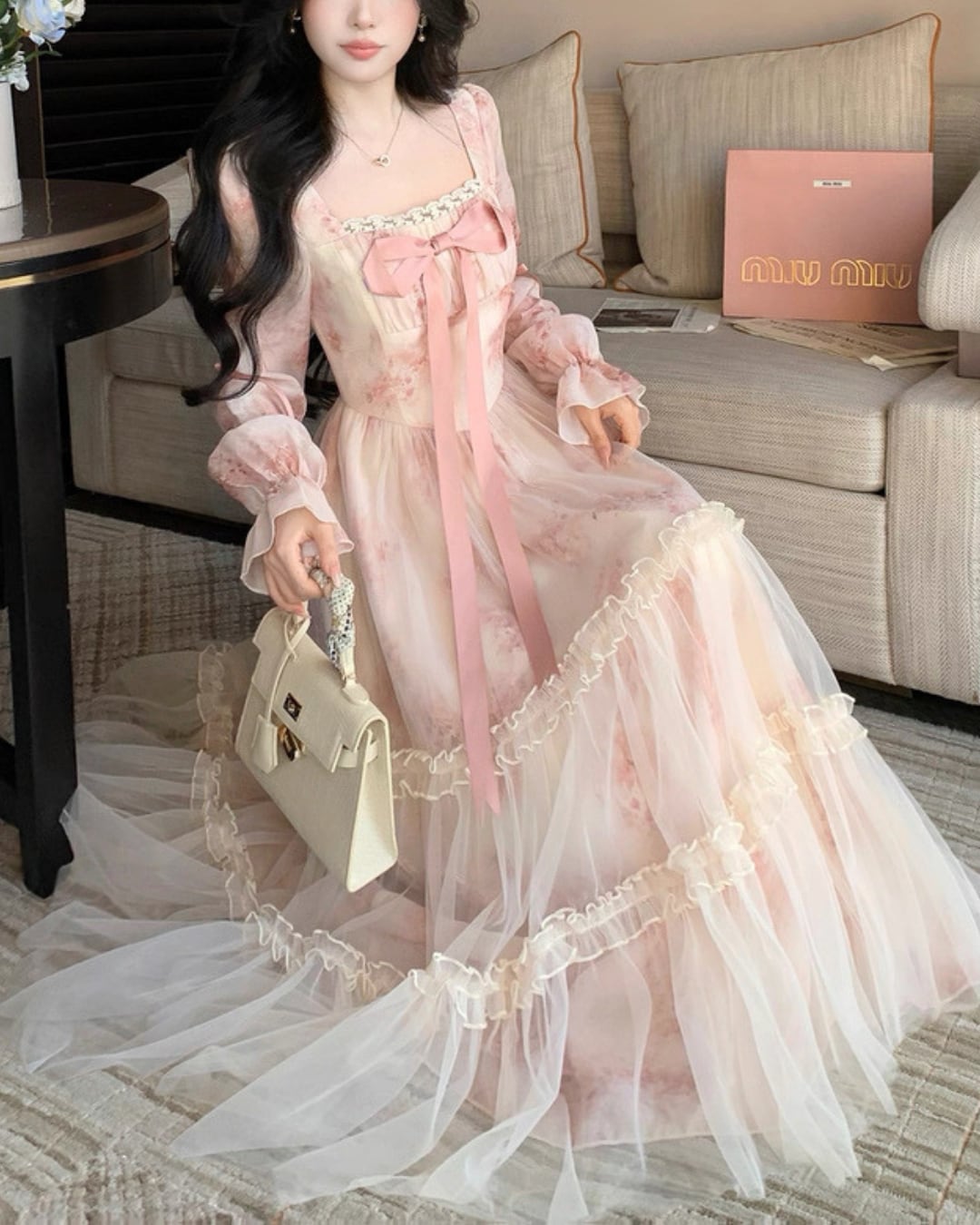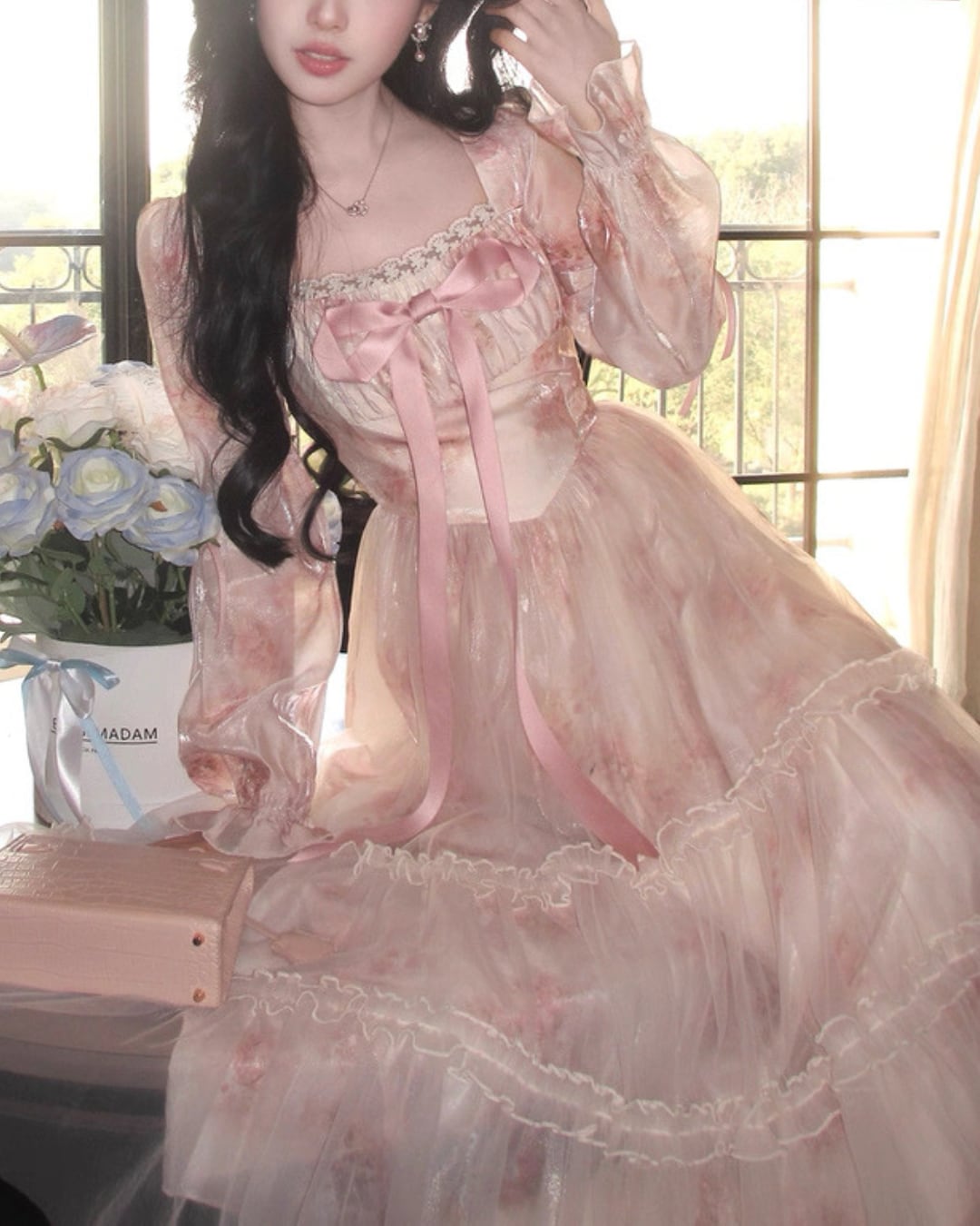 胸元リボンが存在感を放ち、お姫様のような気分にさせてくれる一着です.*・゚