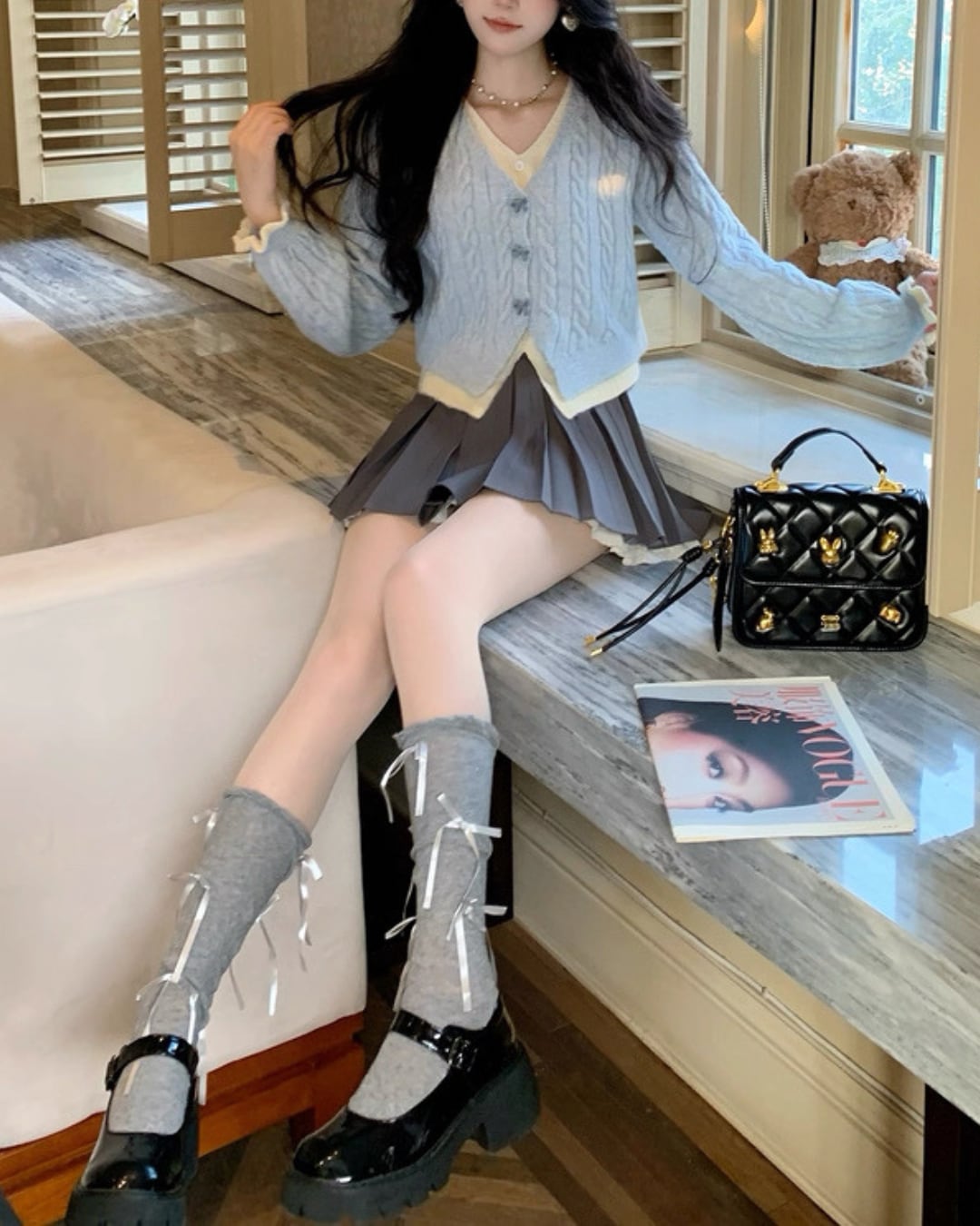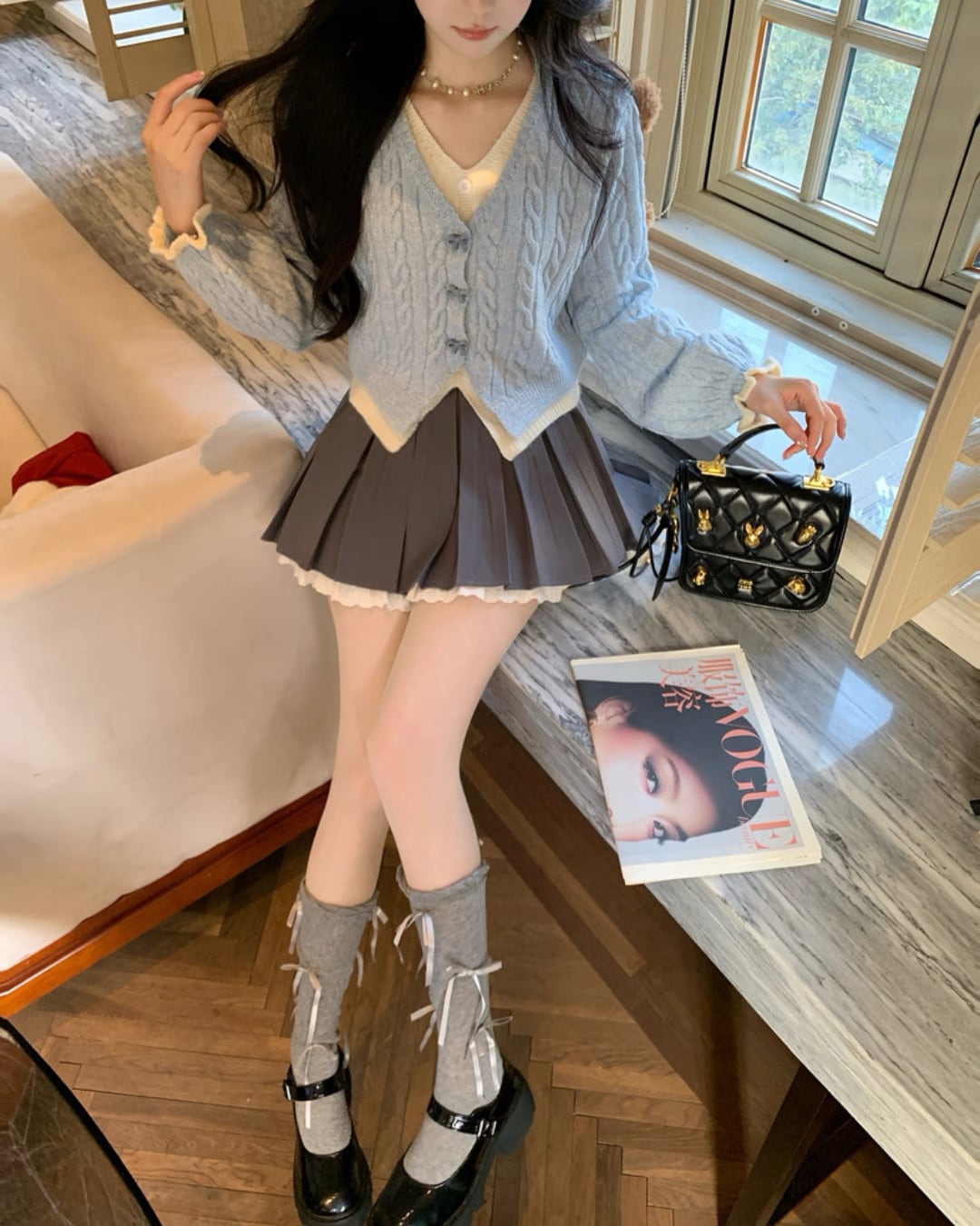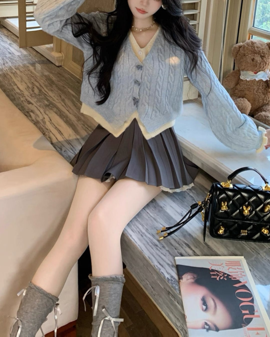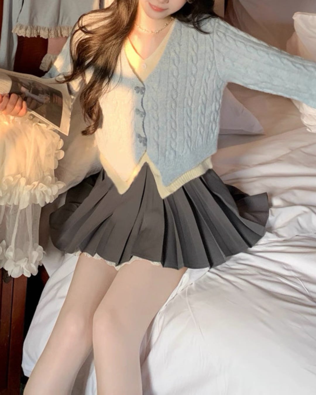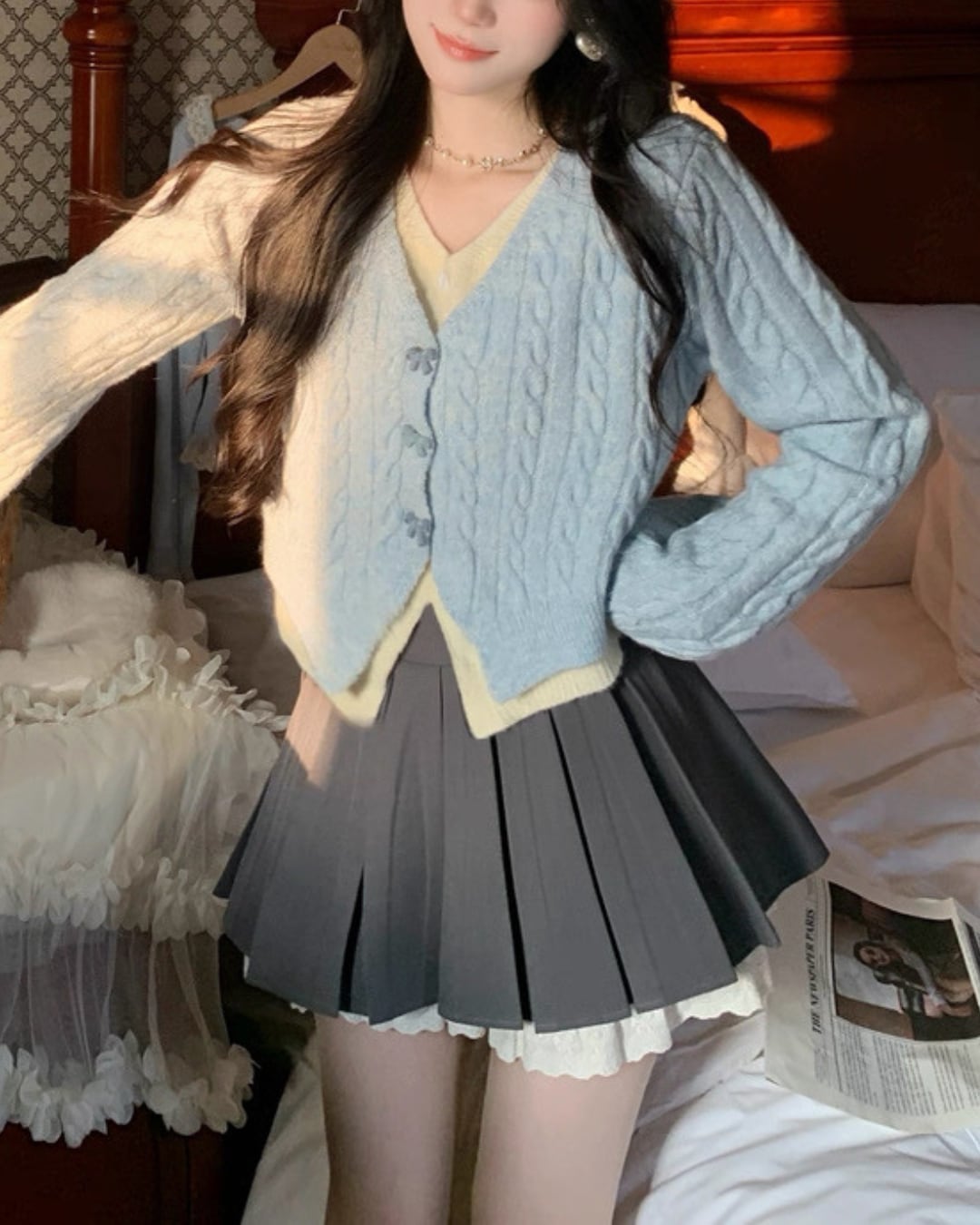 淡いブルーのケーブル編みが可愛らしいカーディガン♡