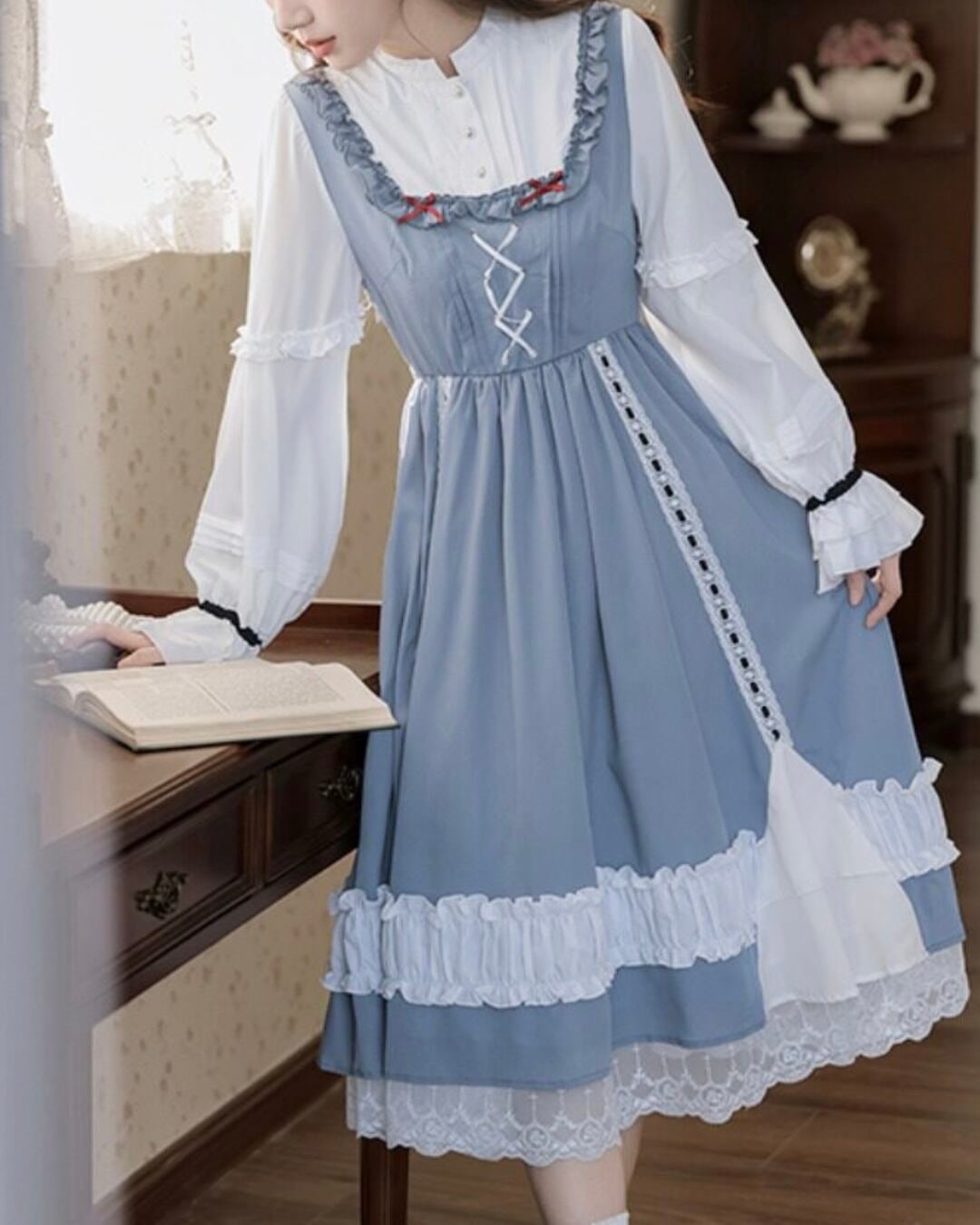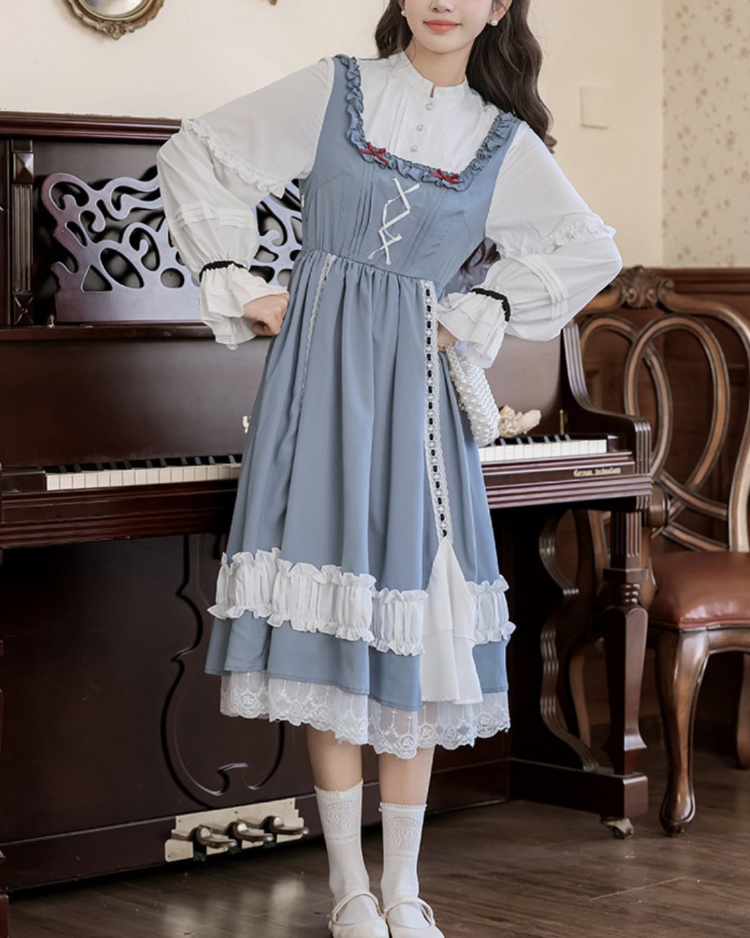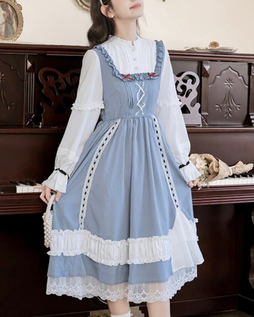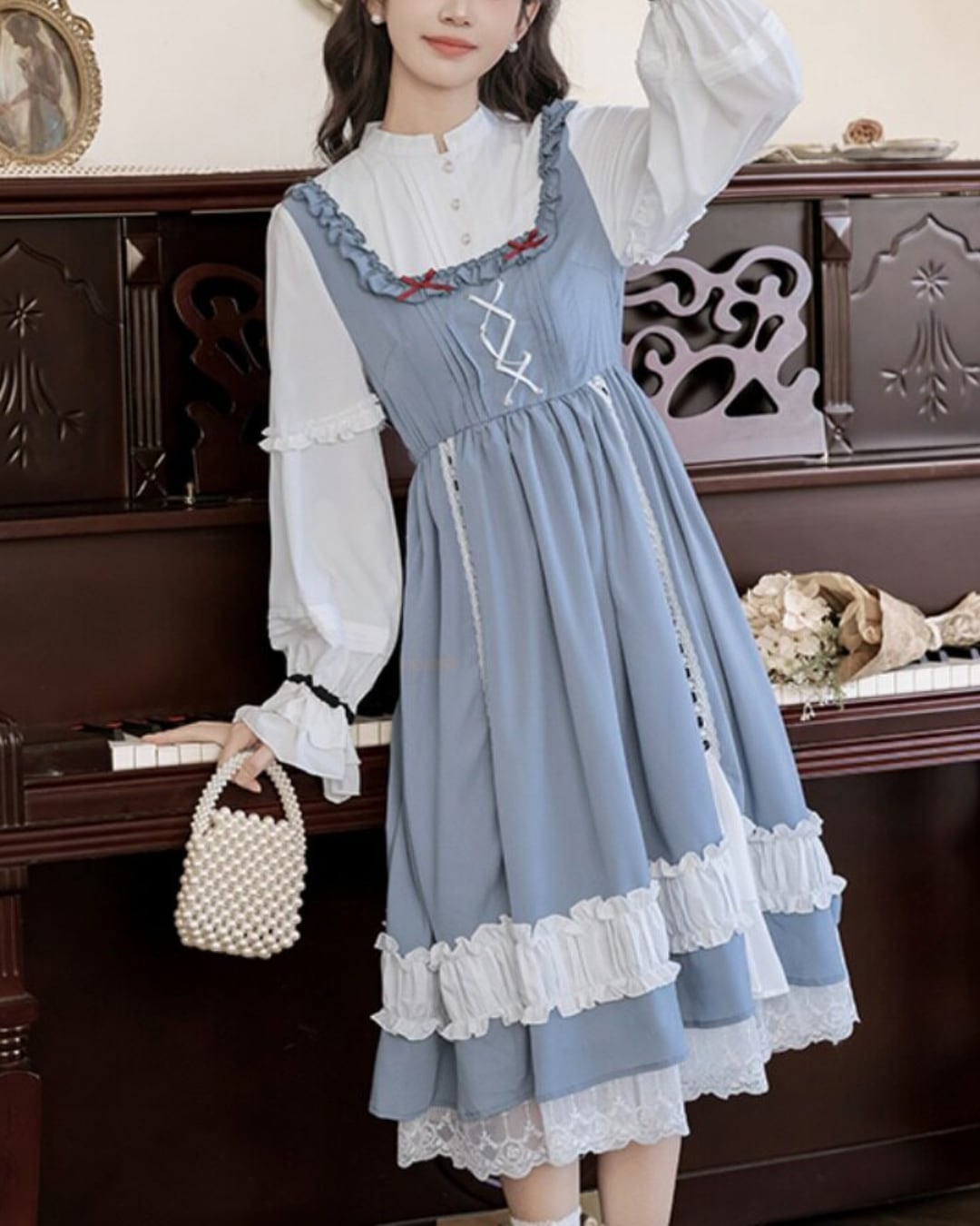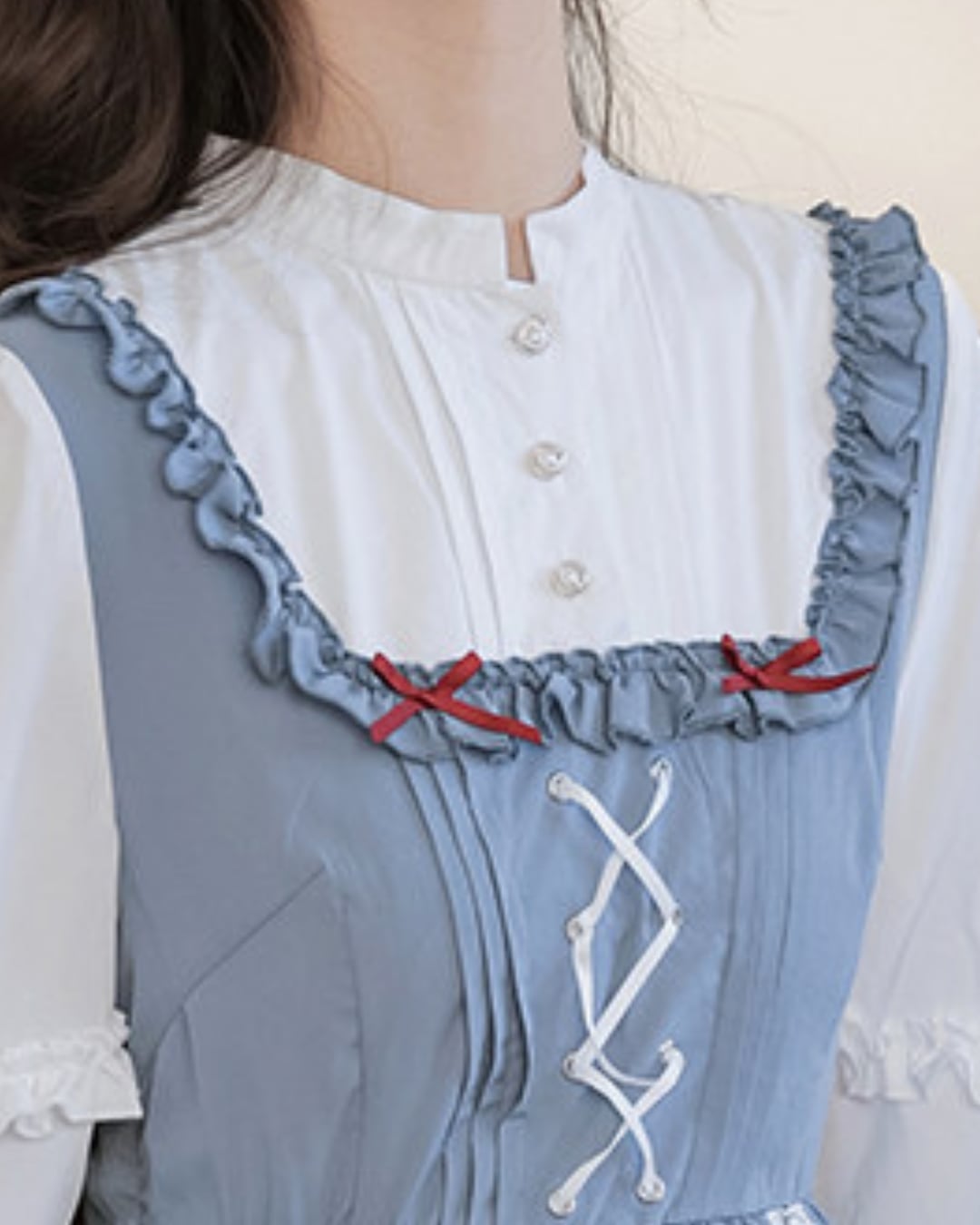 フロントのレースアップと胸元のレッドカラーのリボンがアクセントになり、上品で可憐な印象を演出してくれます*・゜゜