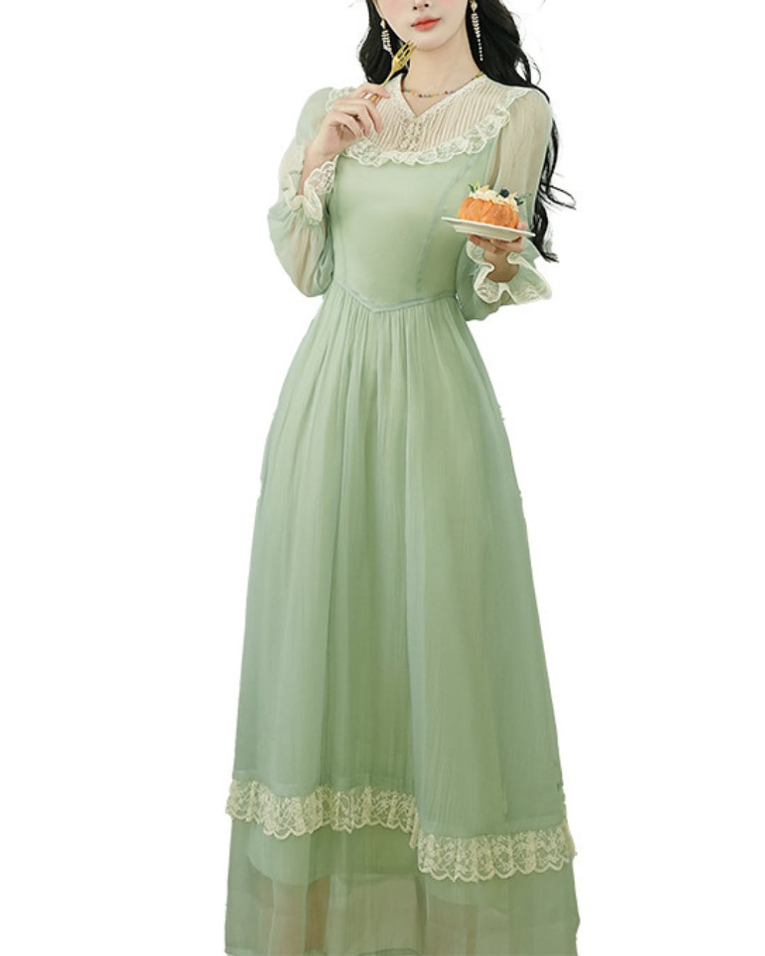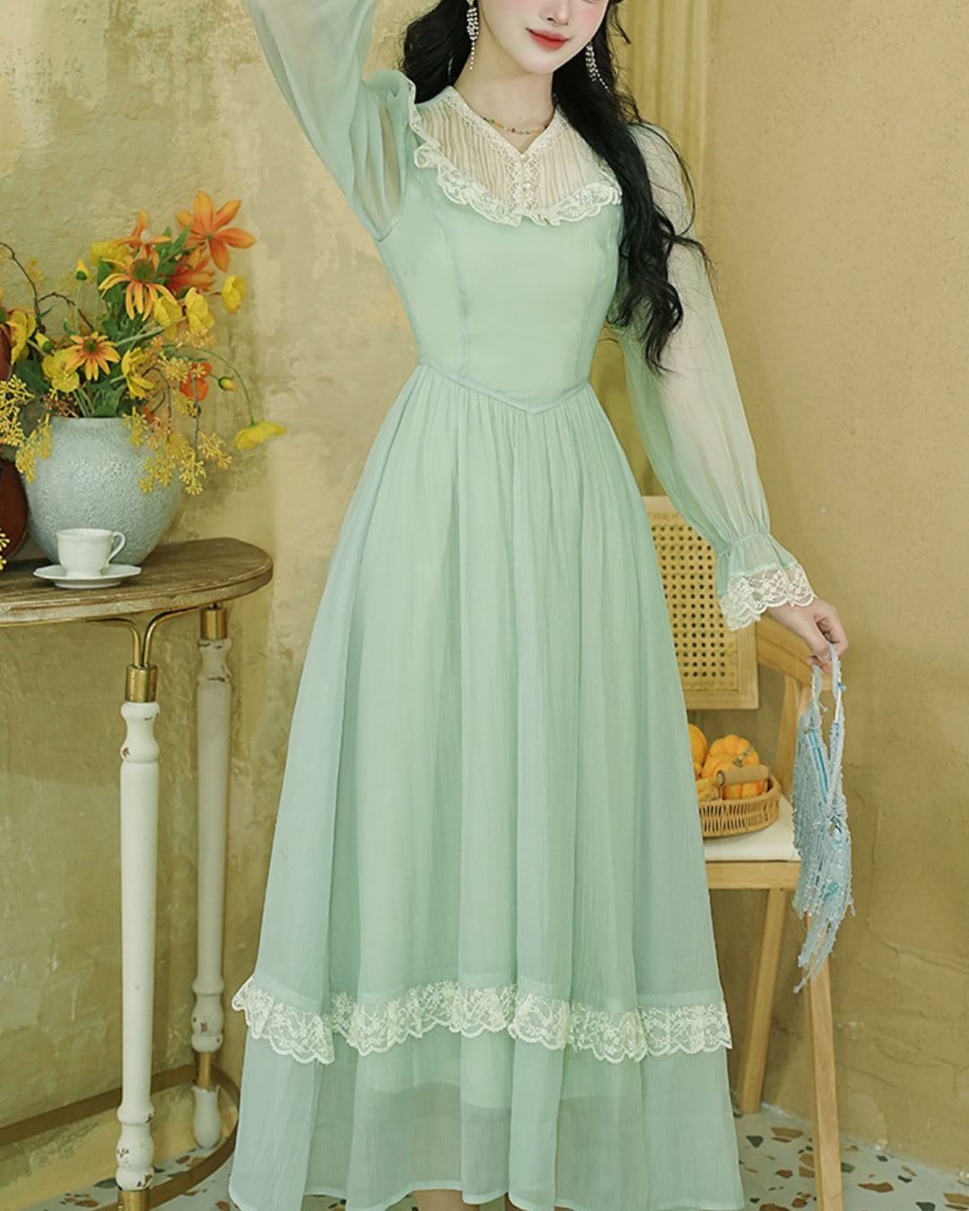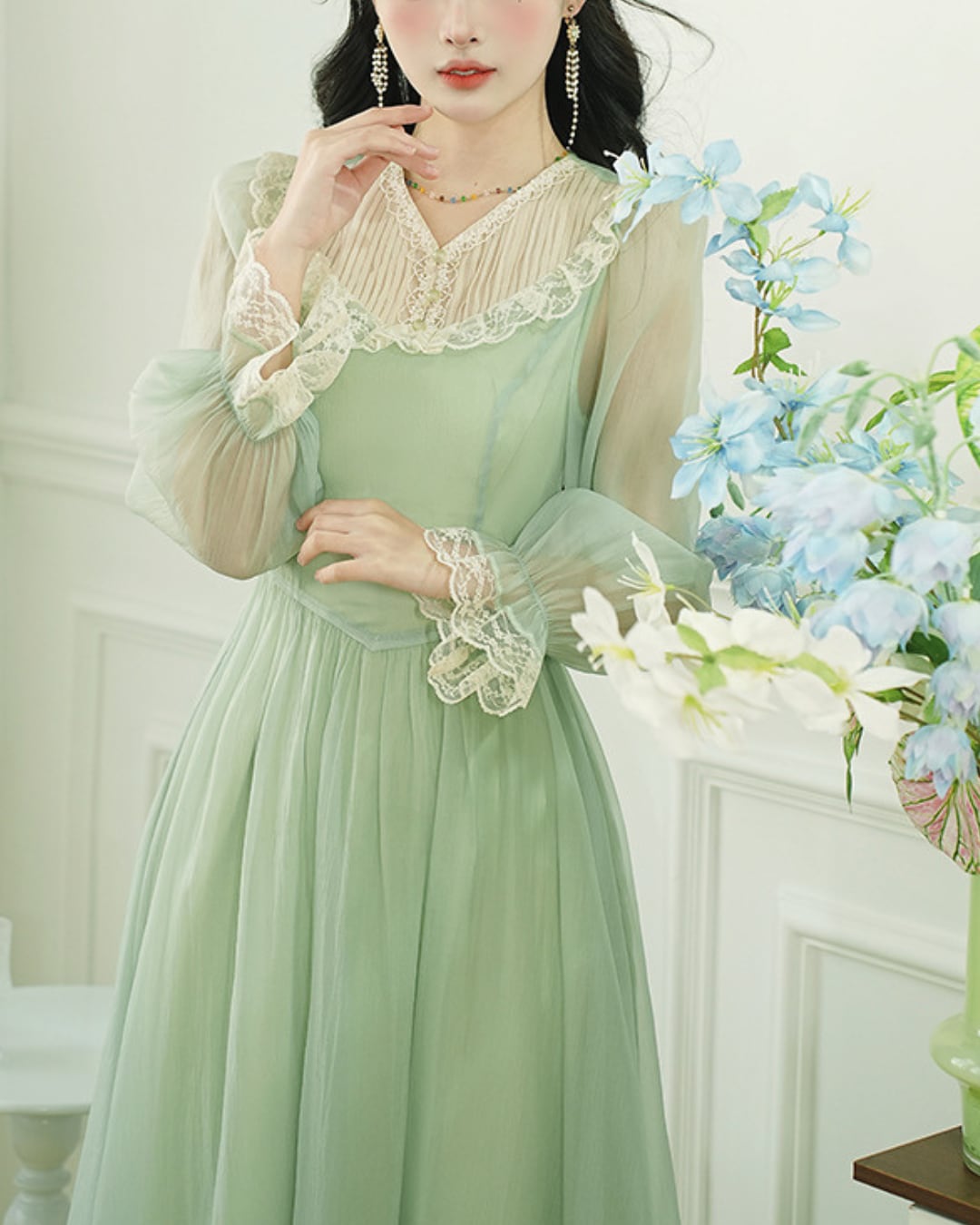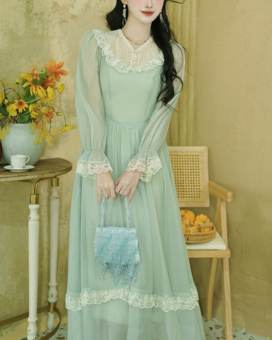 ミントグリーンにレースをあしらった上品なロングワンピース♡