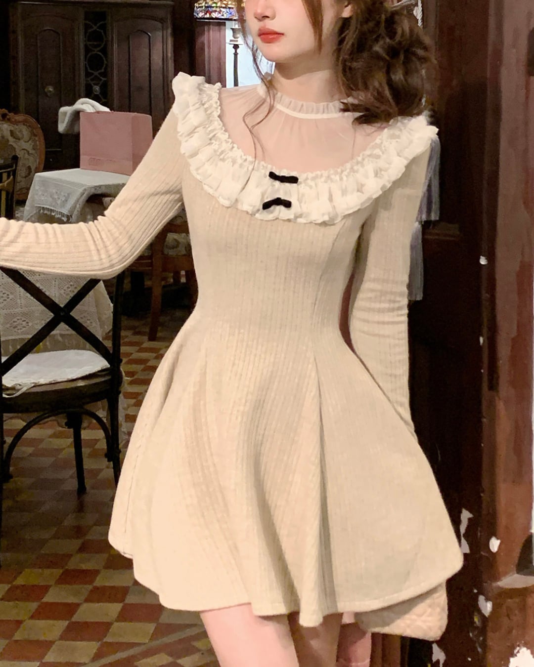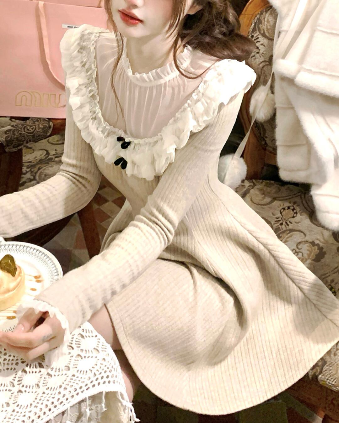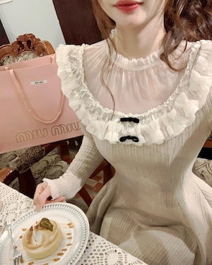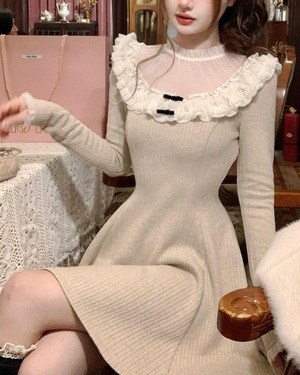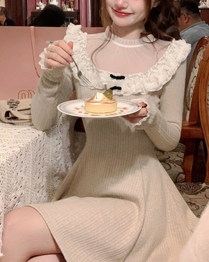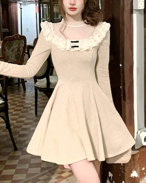 ラウンドレースベージュニットワンピース 25W08474