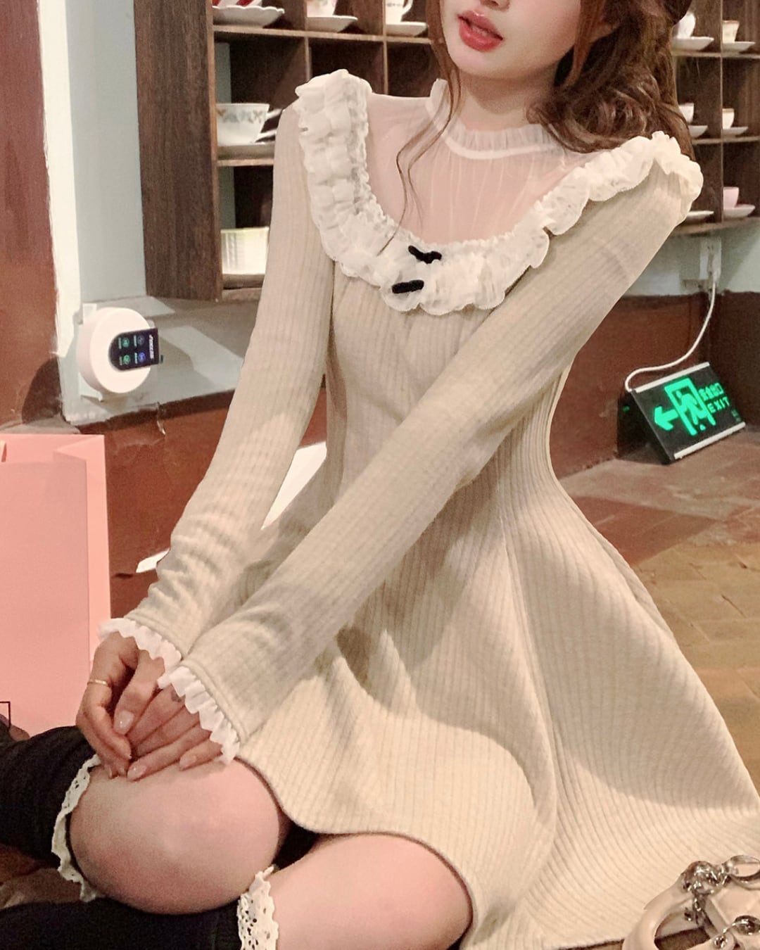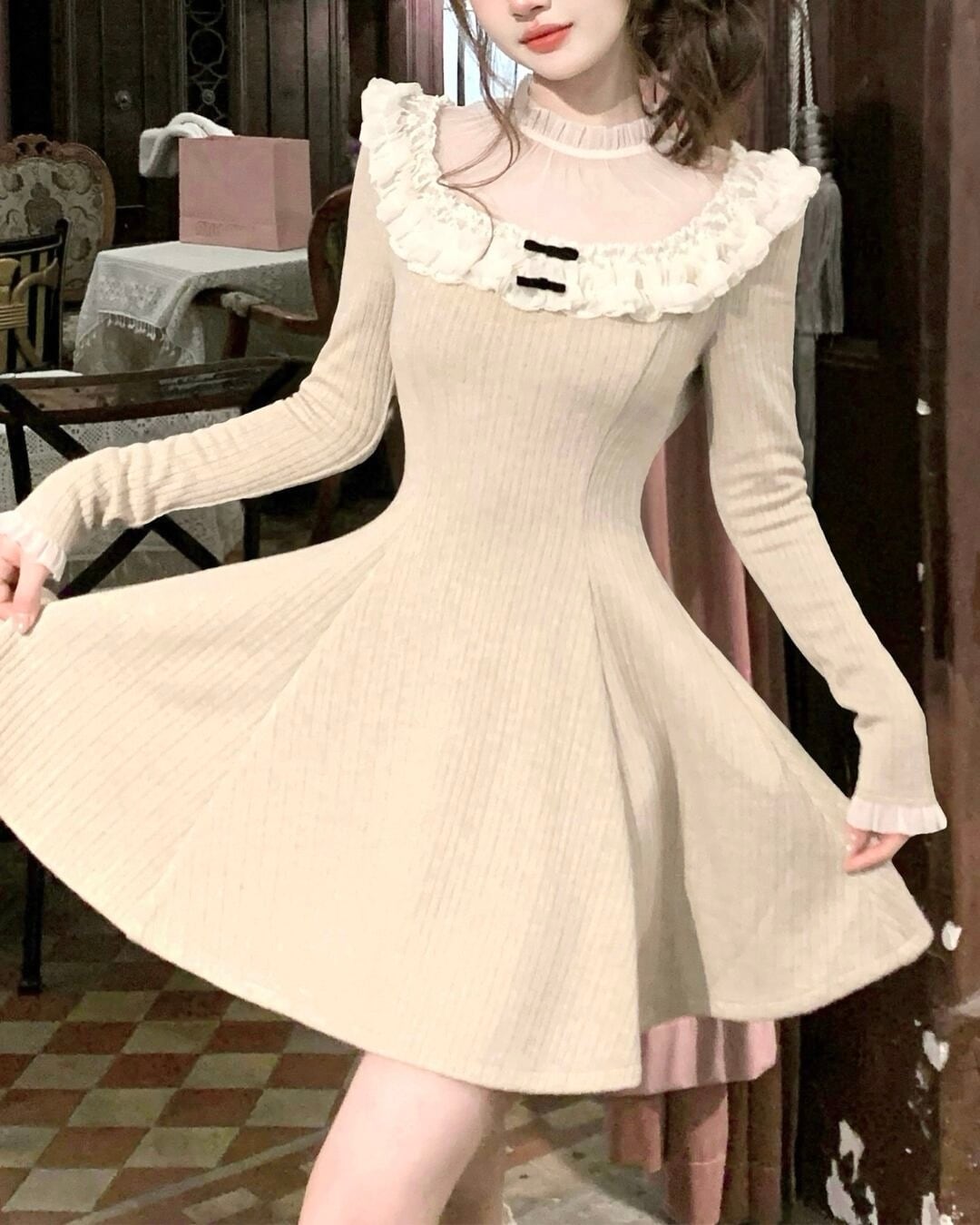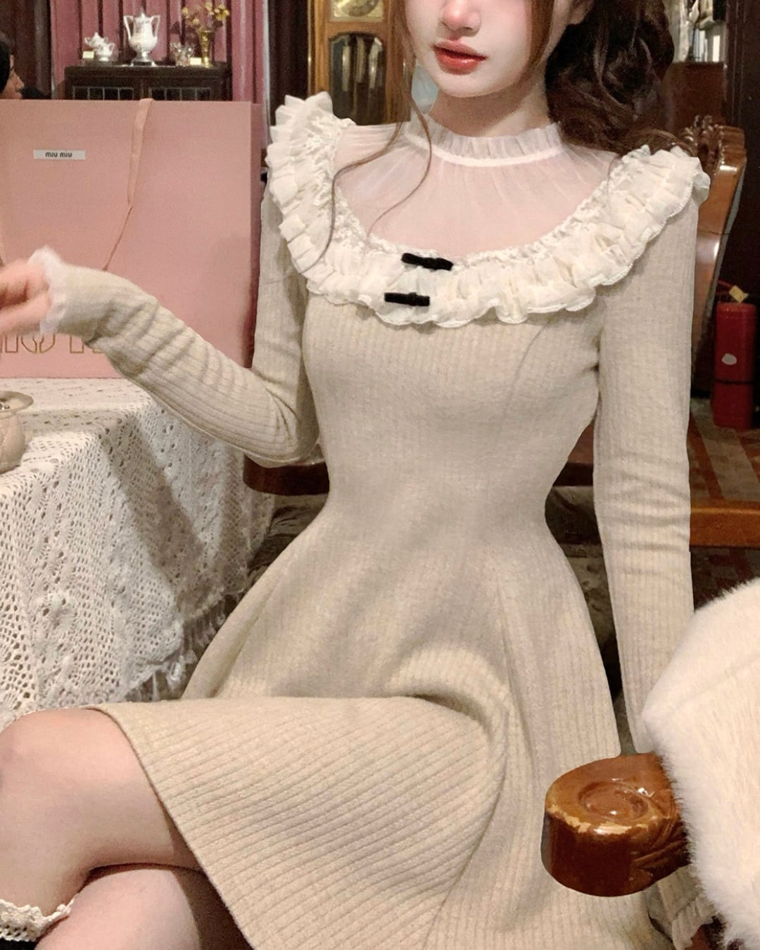 ラウンドレースベージュニットワンピース 25W08474