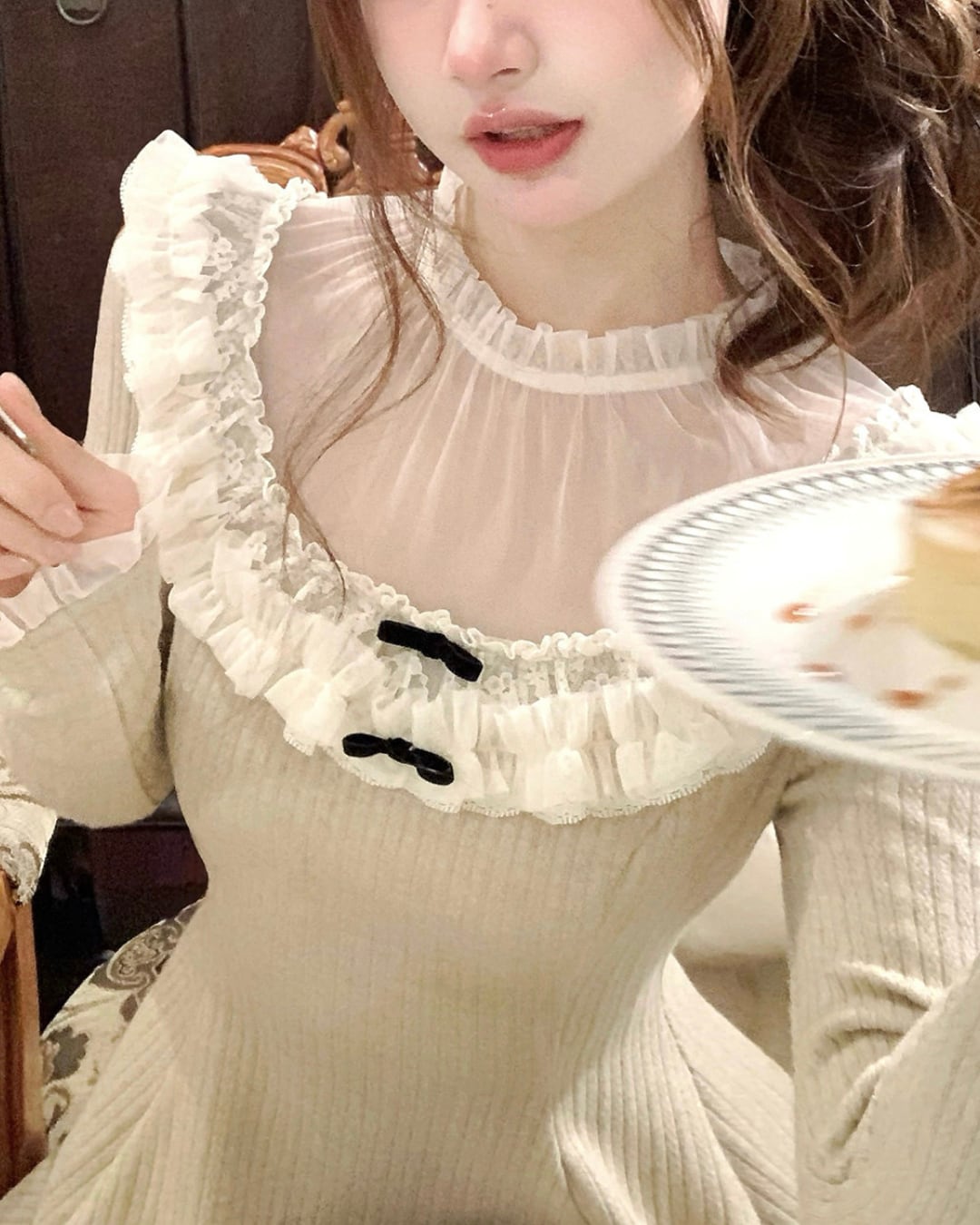 やわらかなニット素材にレースフリルをあしらった