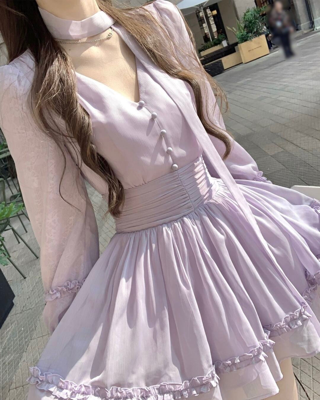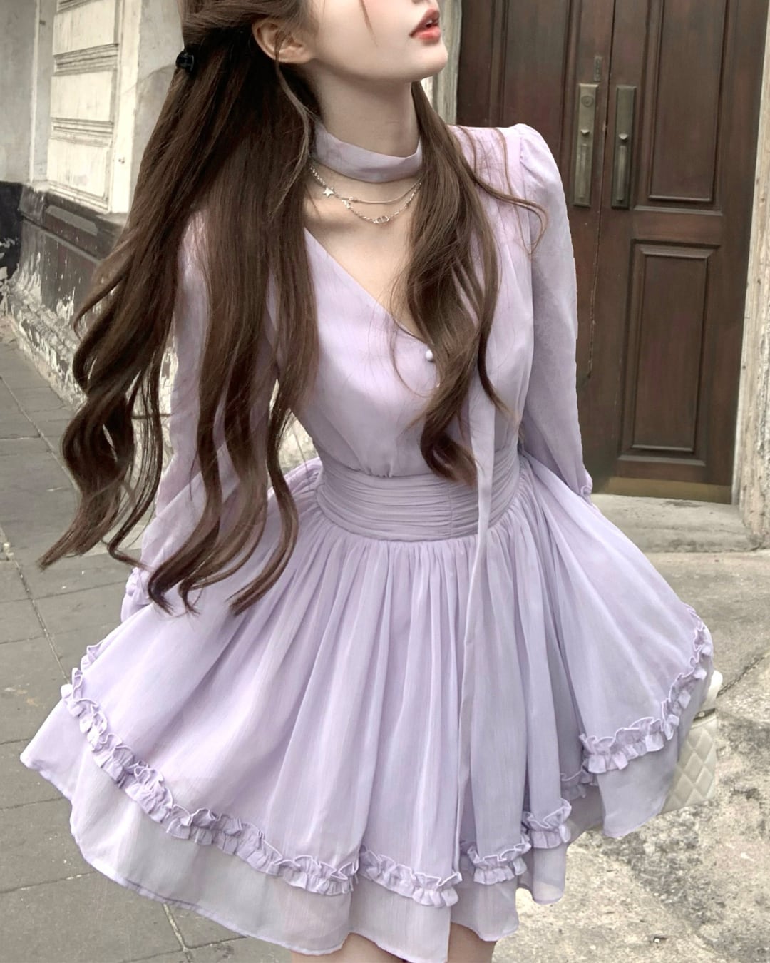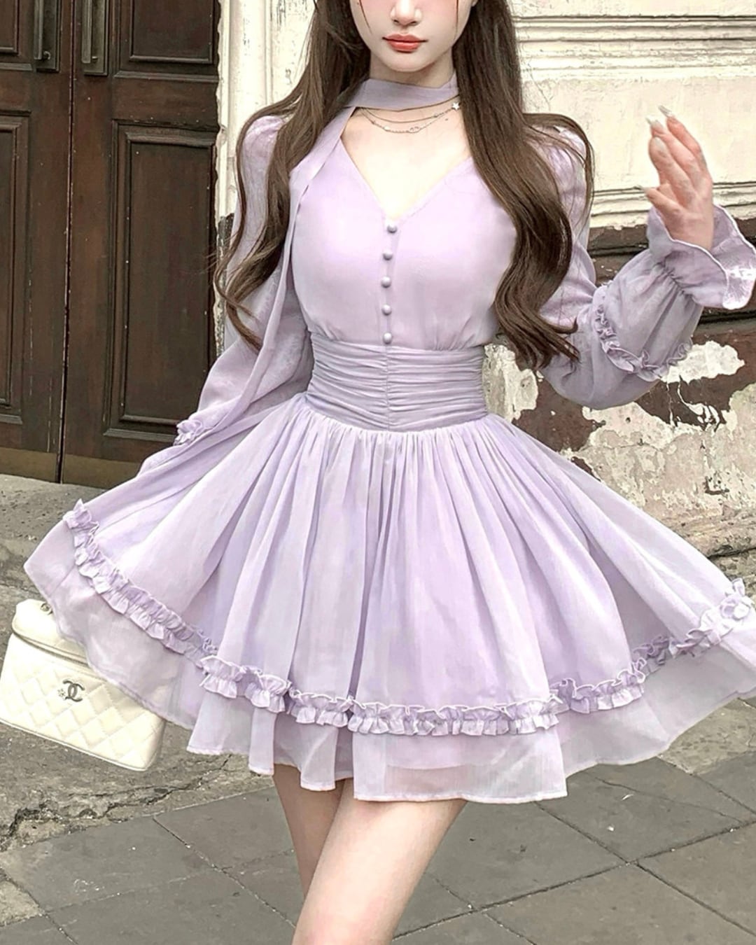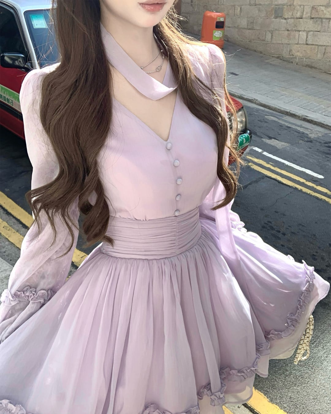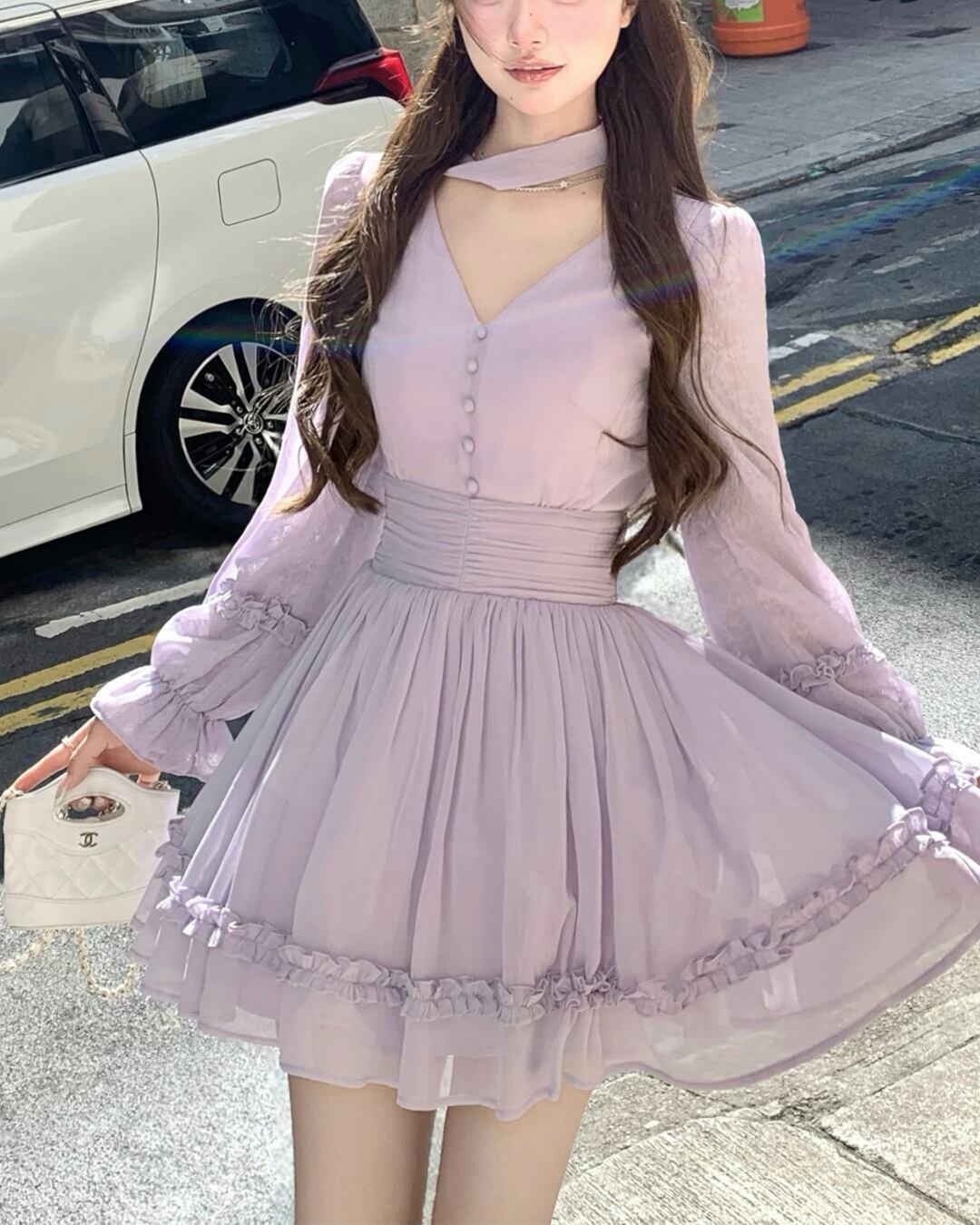 Vネックフェアリーパープルフリルワンピース 25W08480