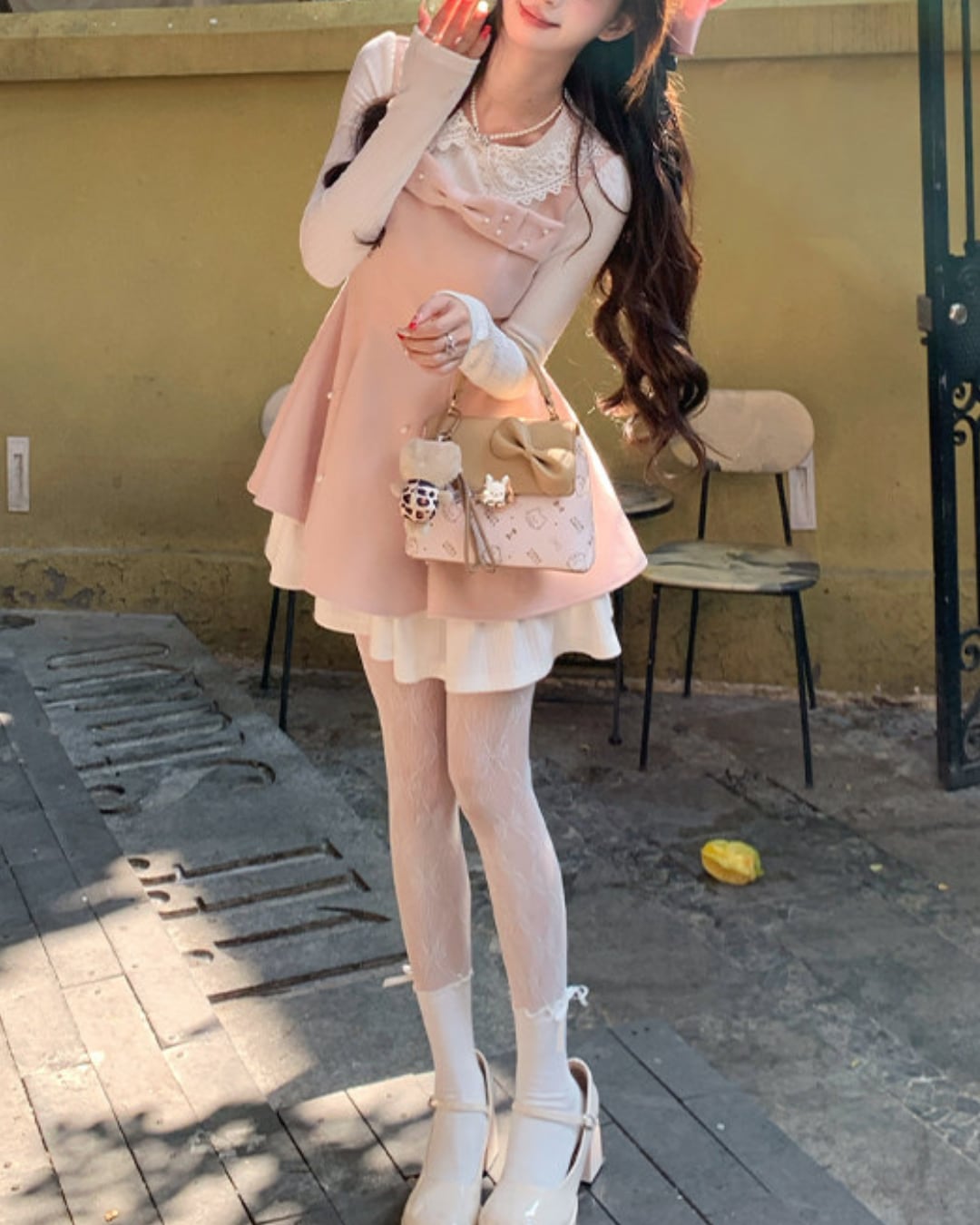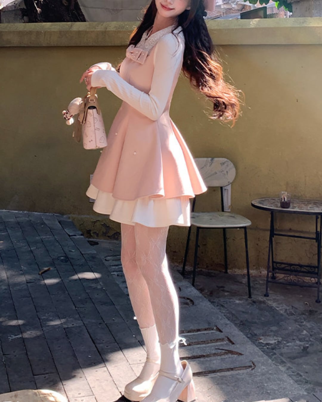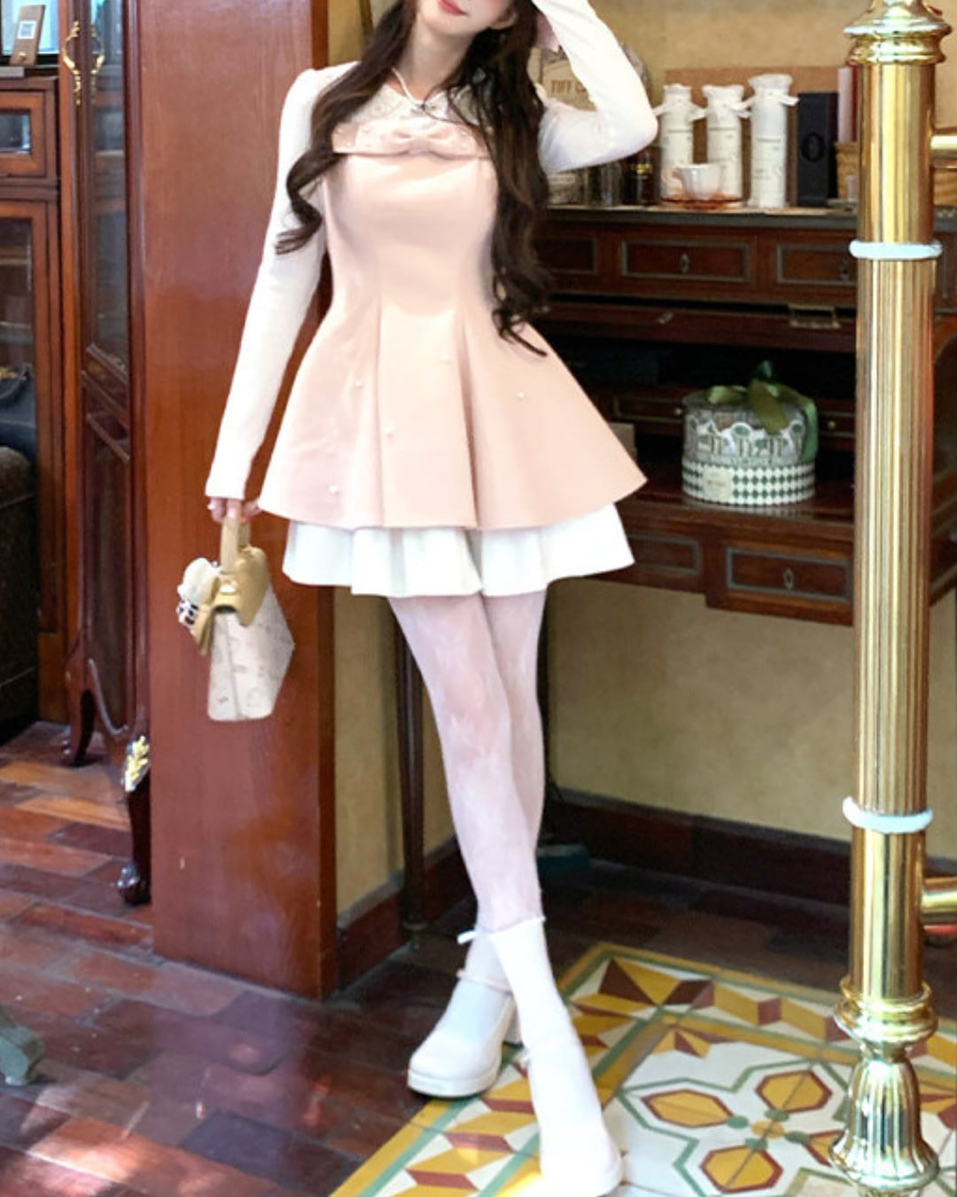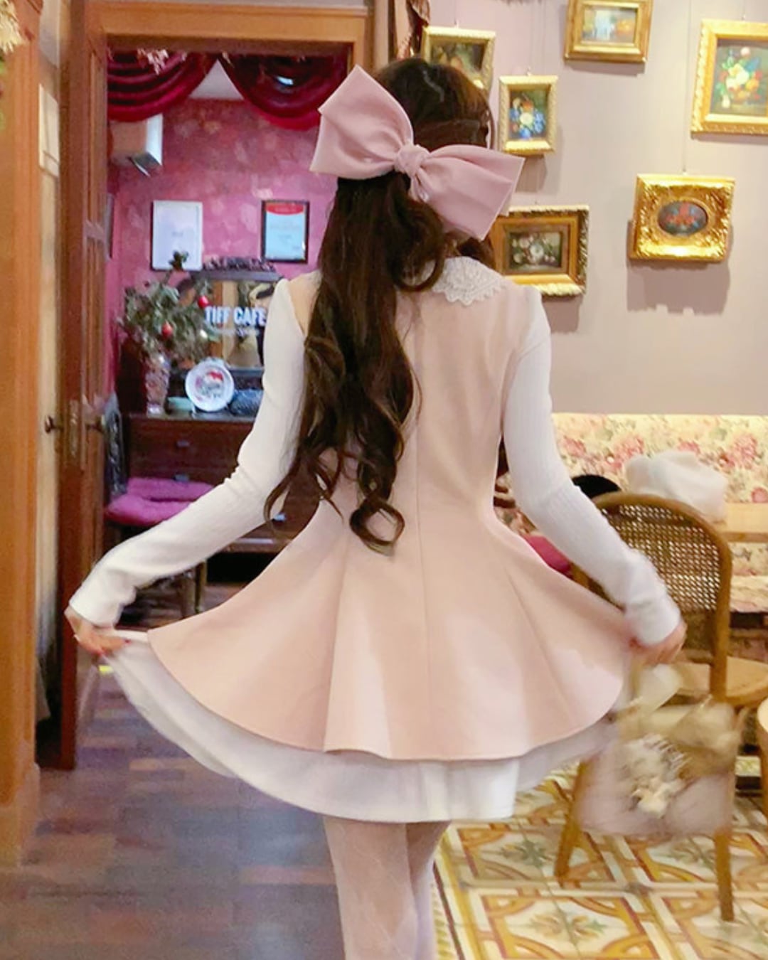 レースカラーのブラウスにワンピースを重ねたような