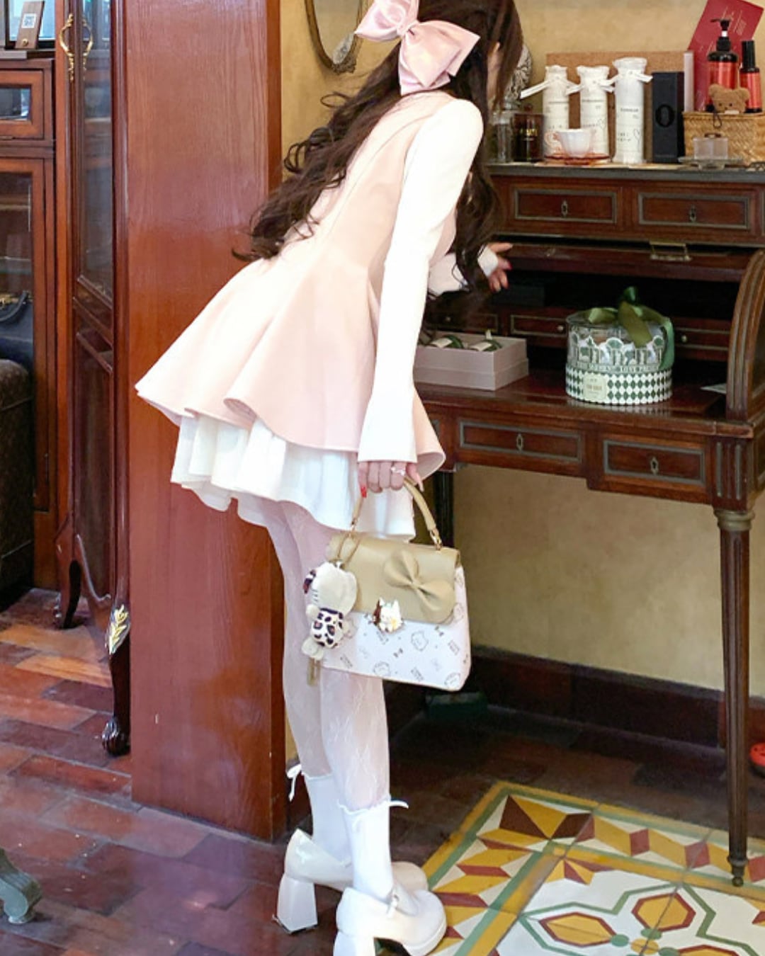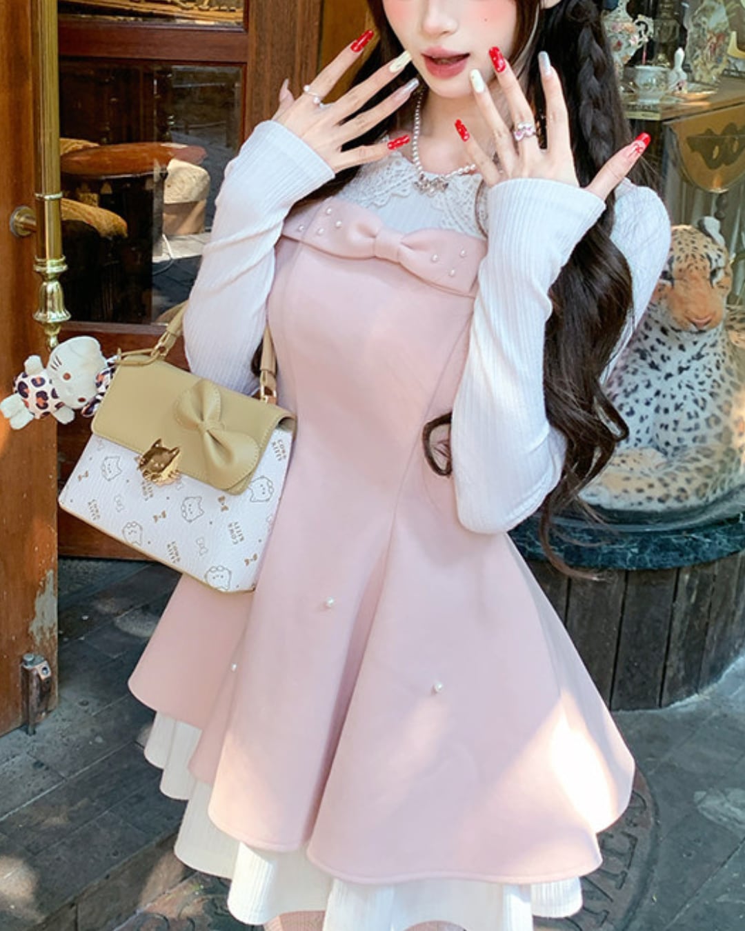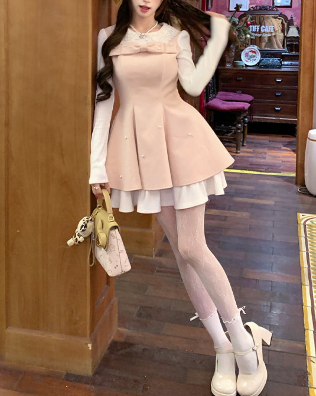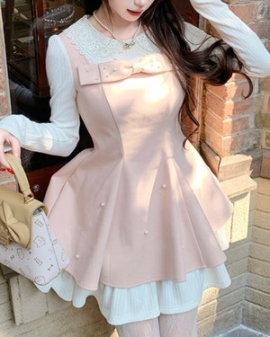大きな胸元リボンとパールをあしらったスウィートな魅力が詰まった一着です*.゜