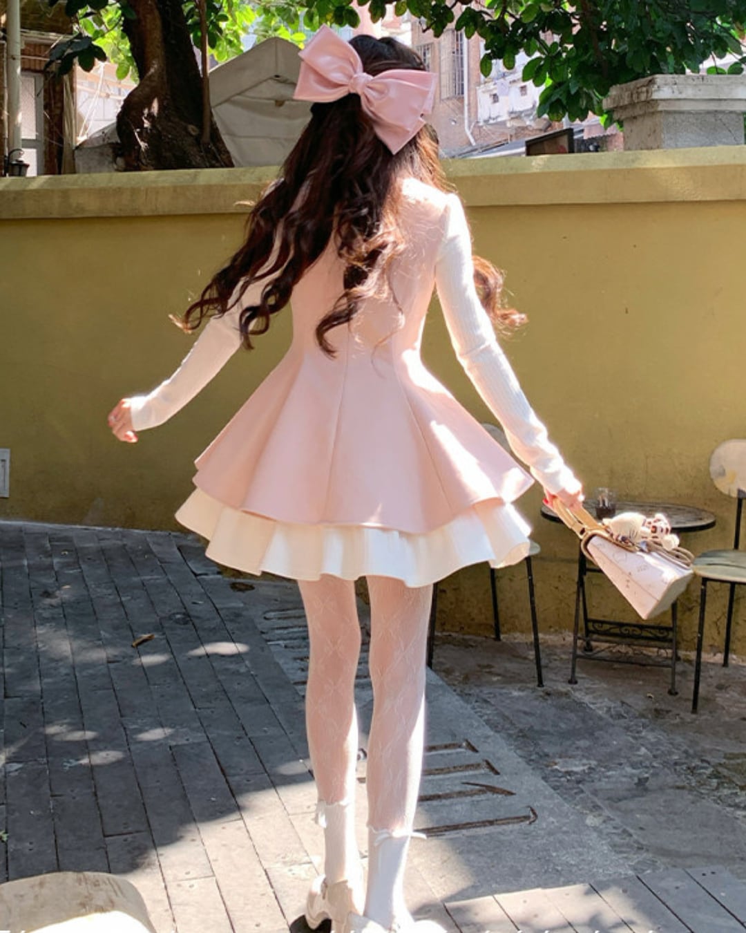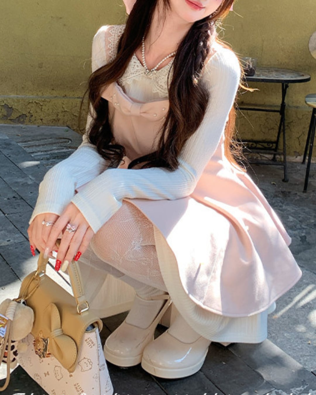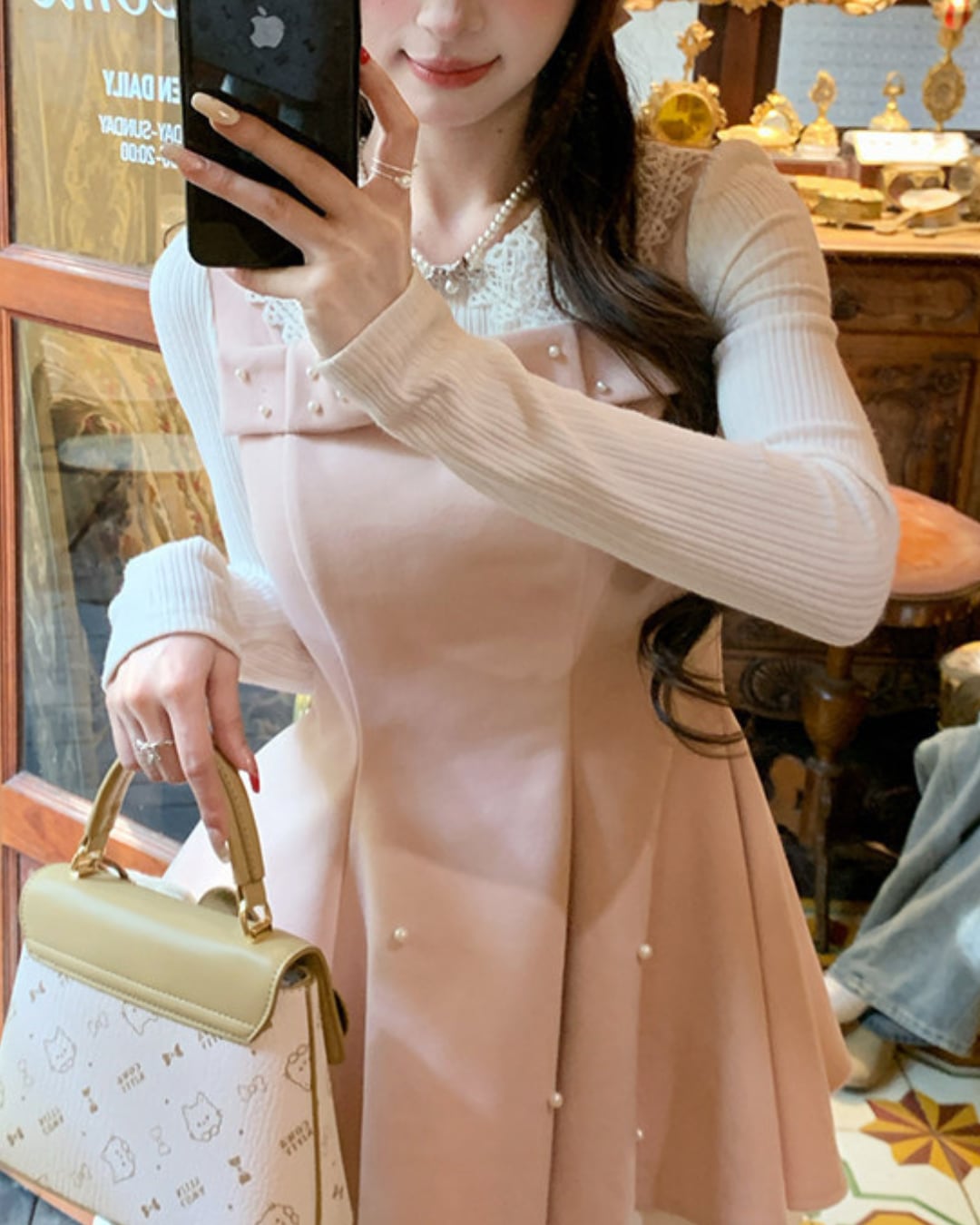 大きな胸元リボンとパールをあしらったスウィートな魅力が詰まった一着です*.゜
